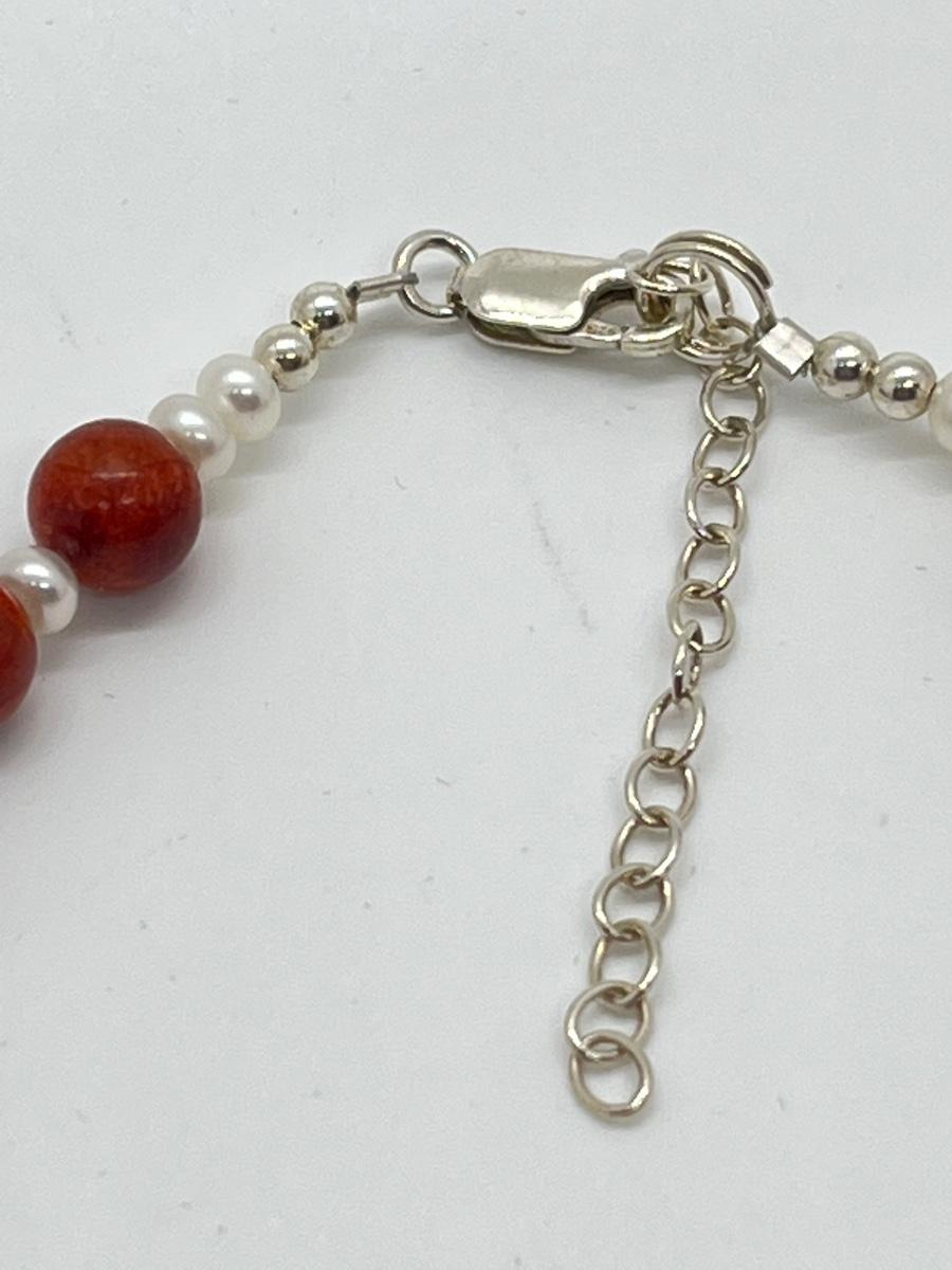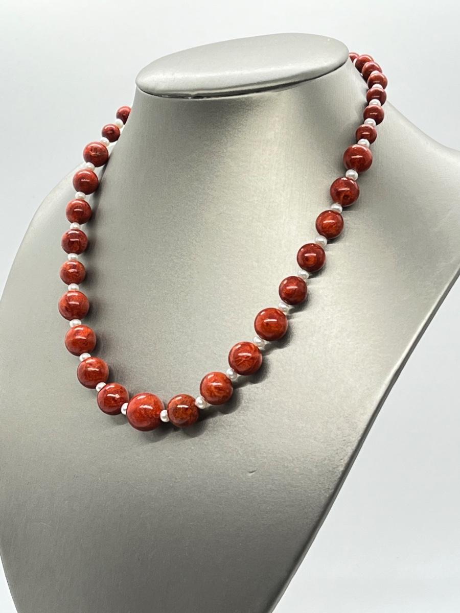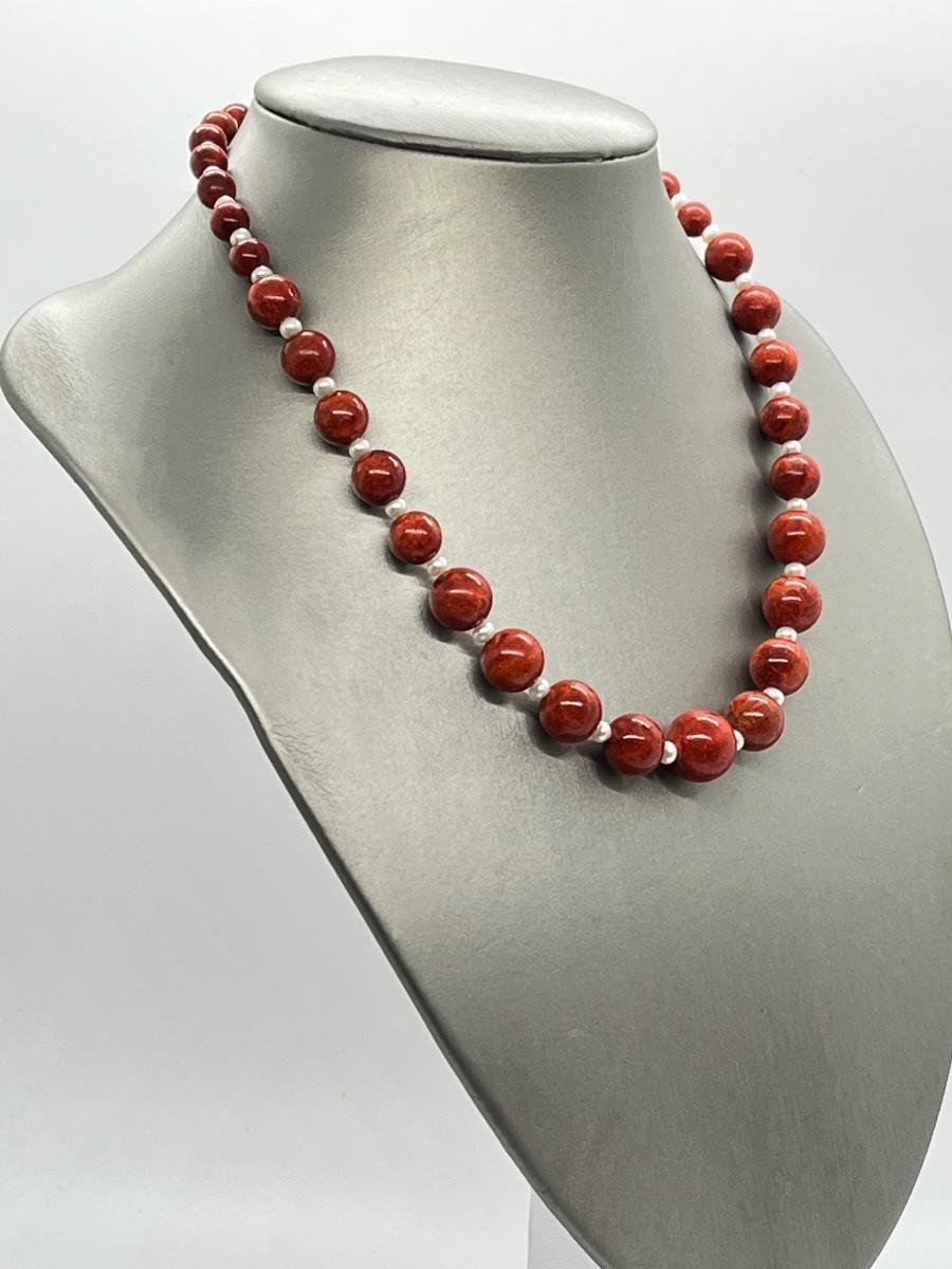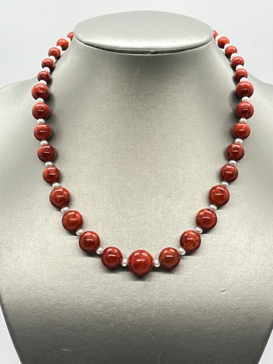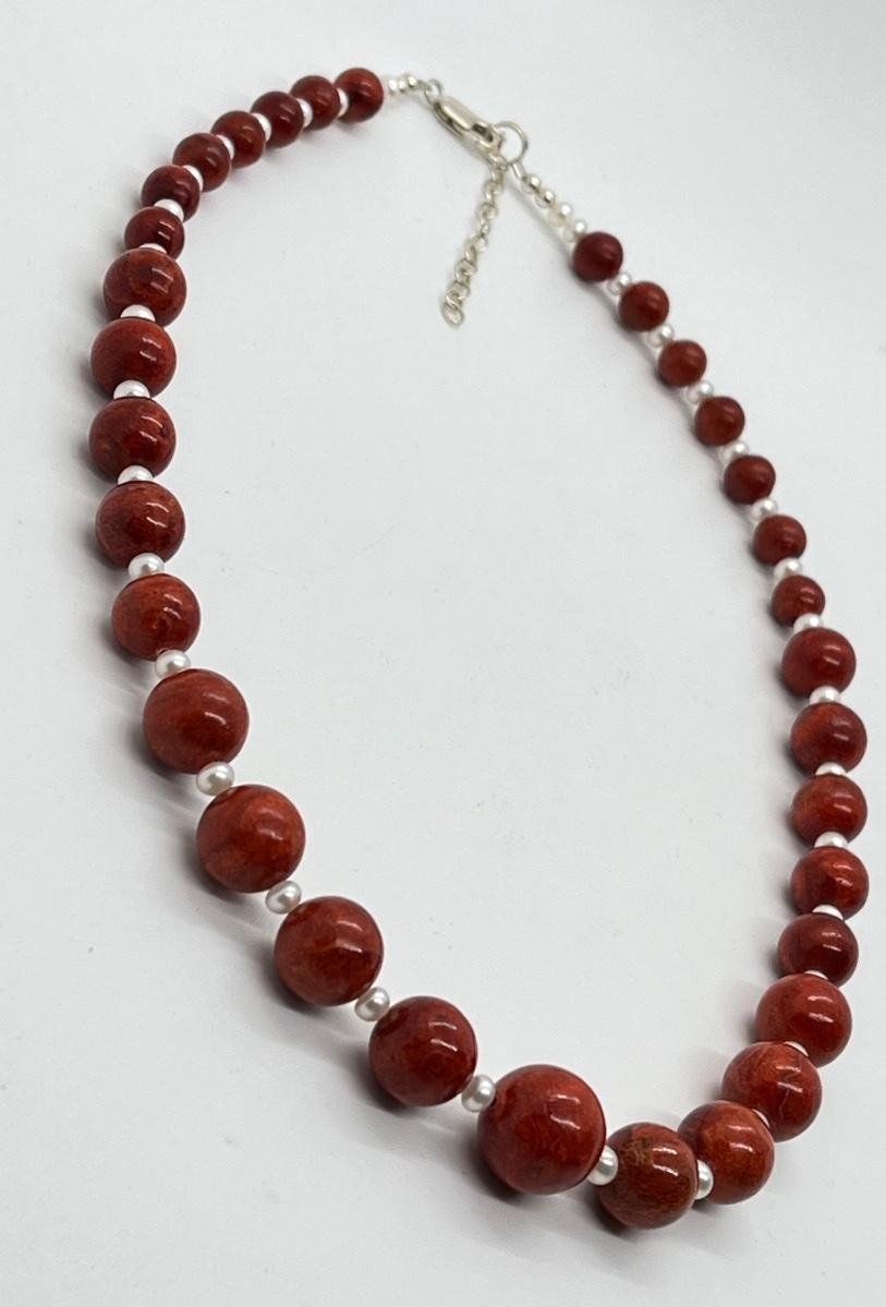 LOT 160: Lee Sands Red Sponge Coral Bead and Freshwater Cultured Pearl Necklace - 18" with 2" ext. and Sterling Clasp