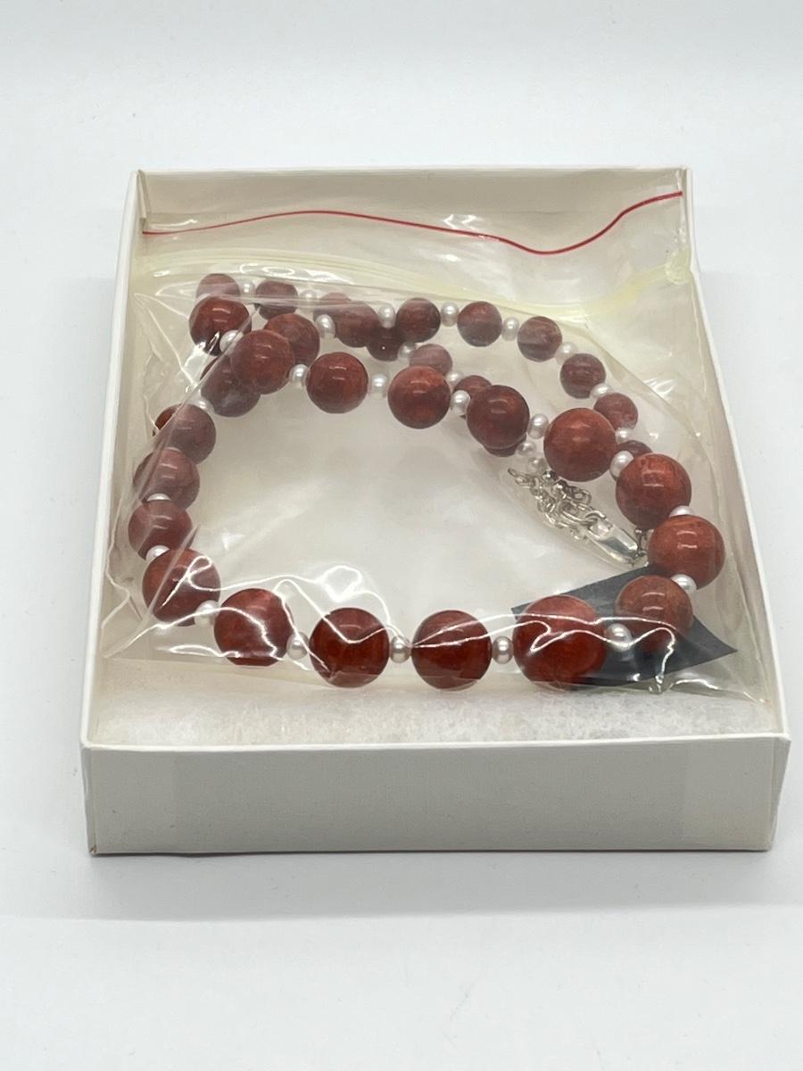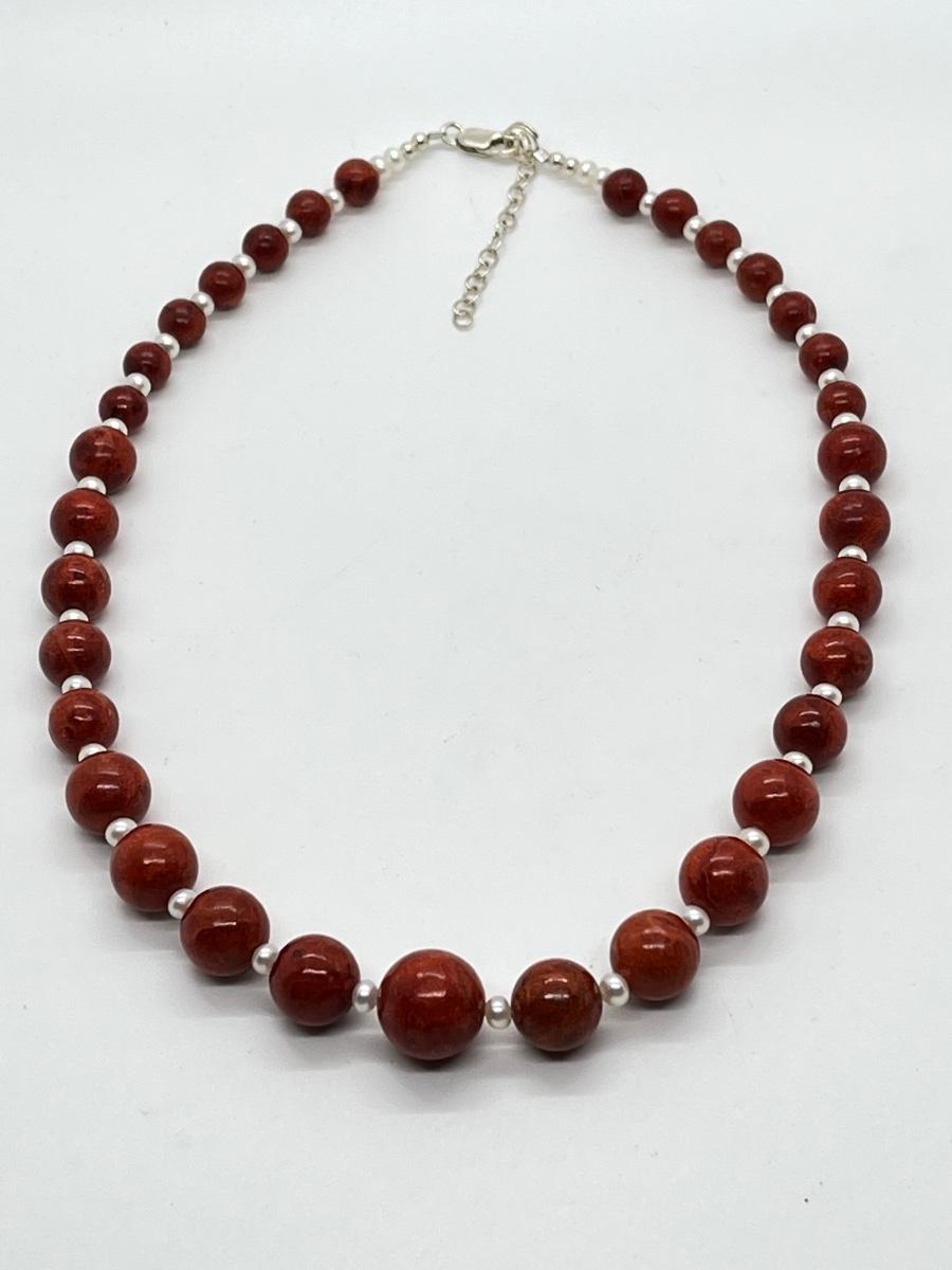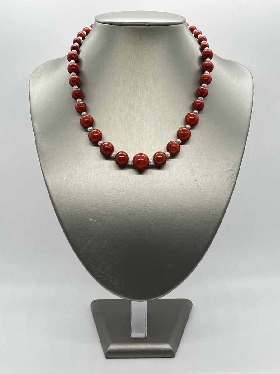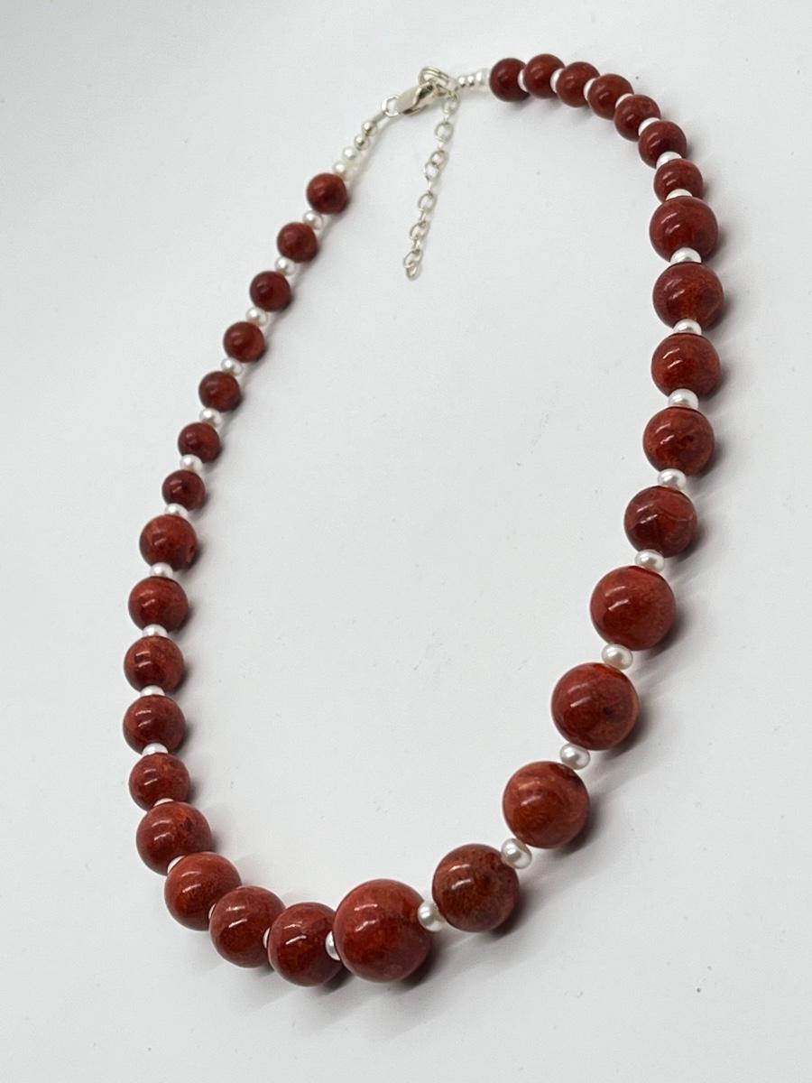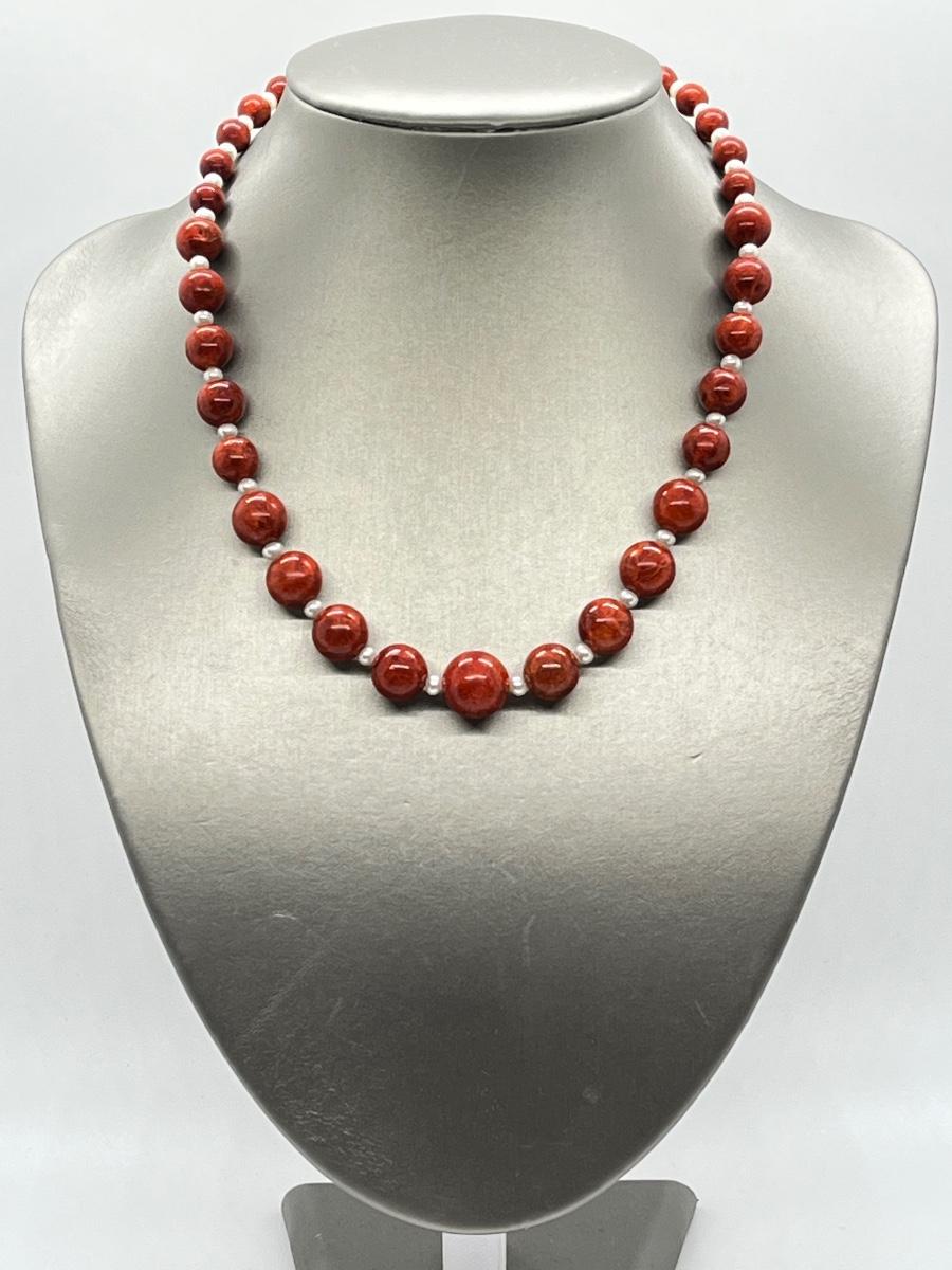 LOT 160: Lee Sands Red Sponge Coral Bead and Freshwater Cultured Pearl Necklace - 18" with 2" ext. and Sterling Clasp