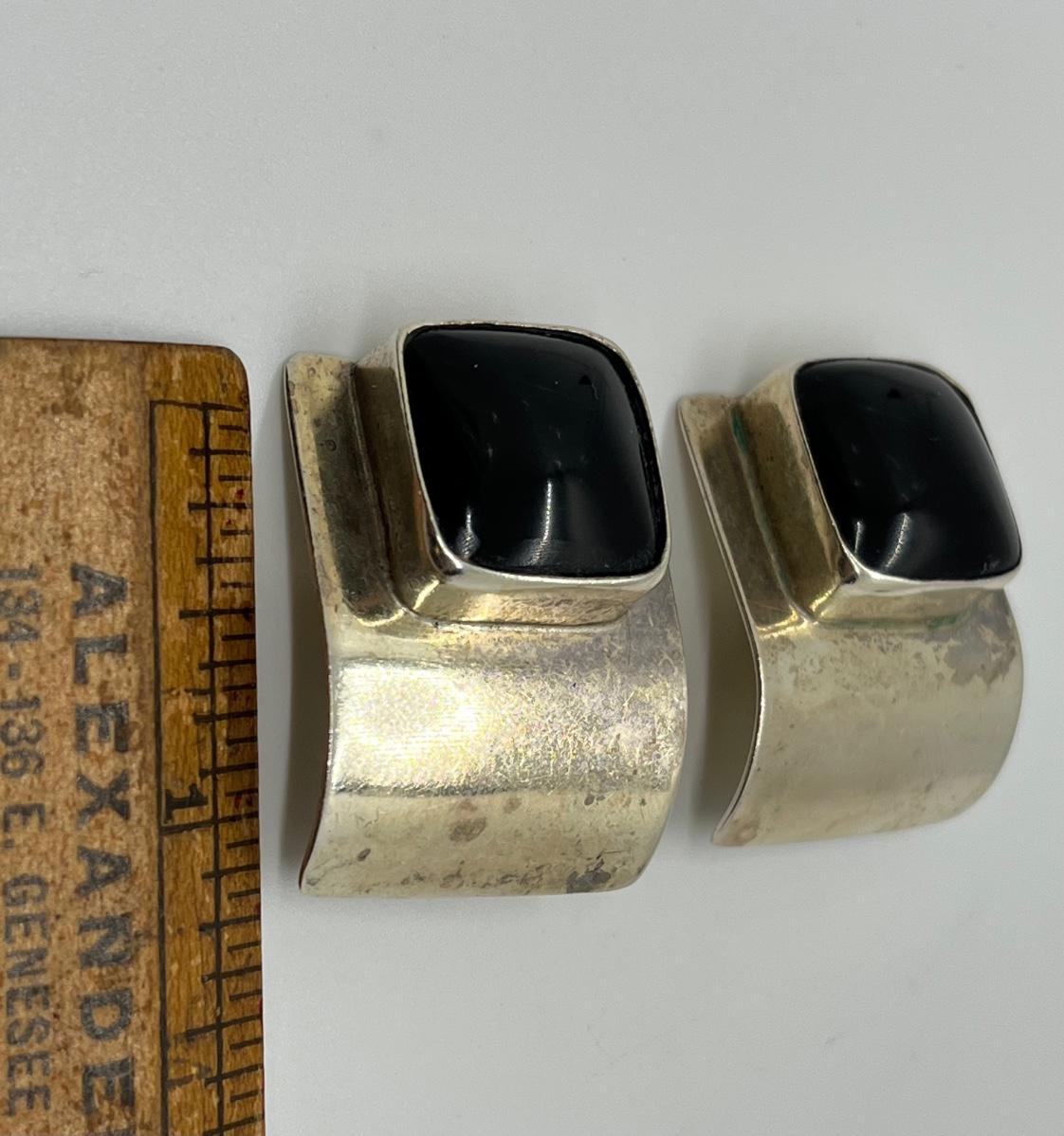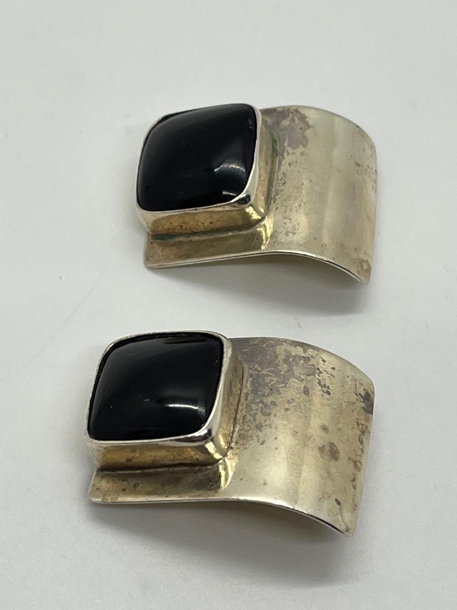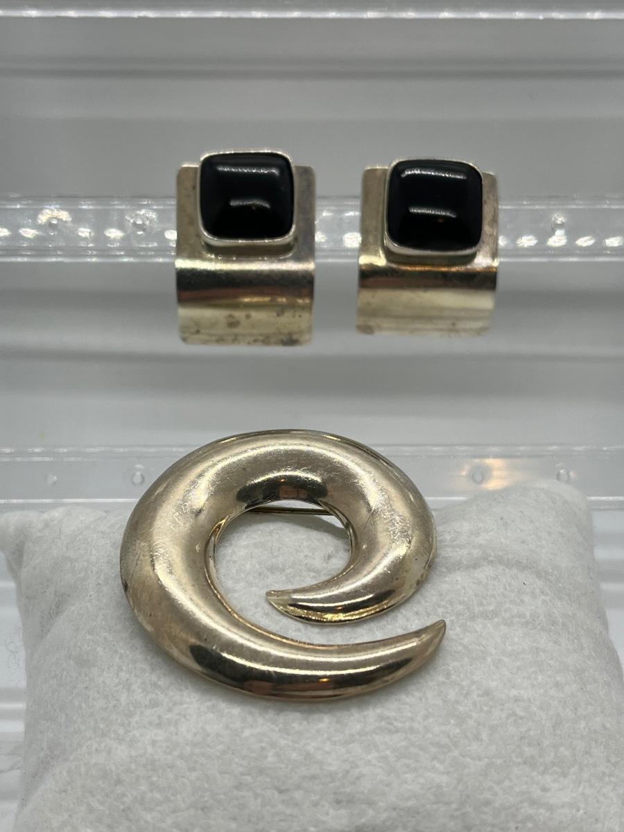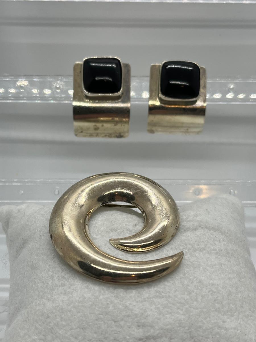 LOT 42: Sterling Silver Mexico Jewelry - Onyx Earrings & Swirl Brooch