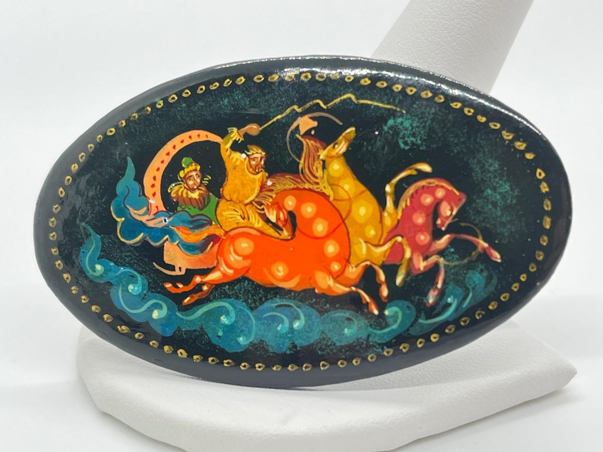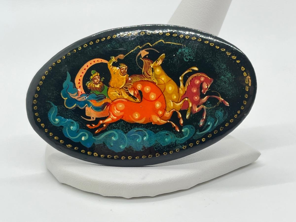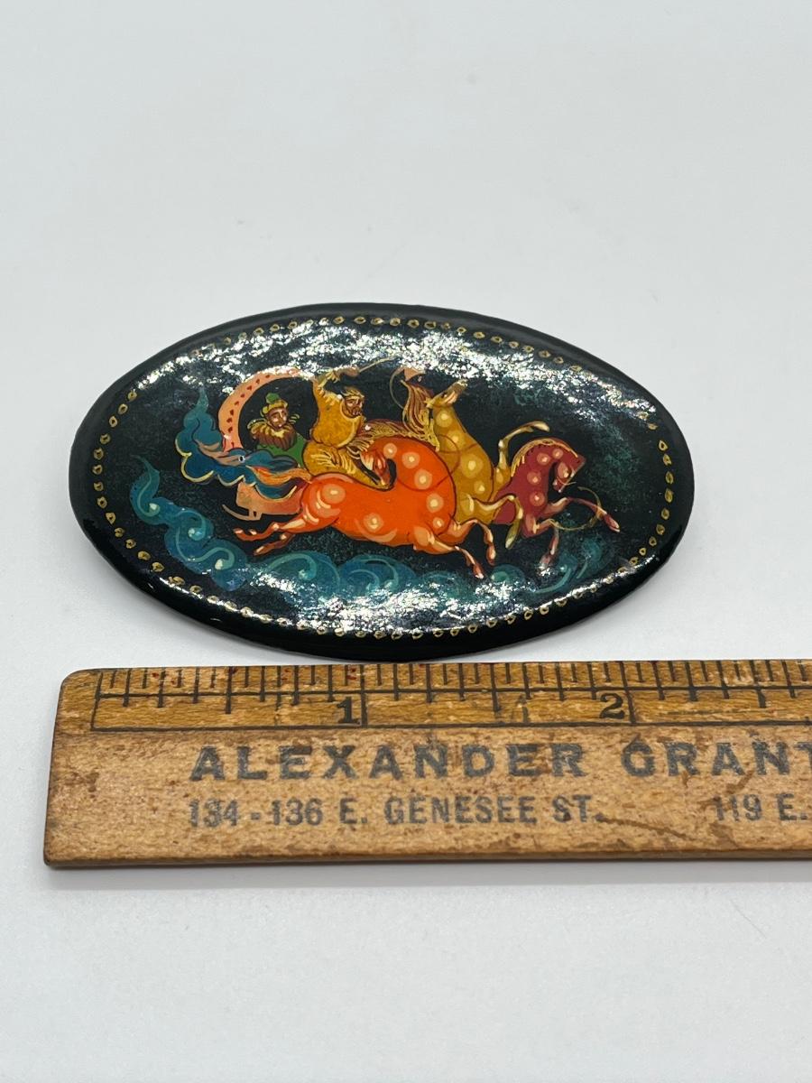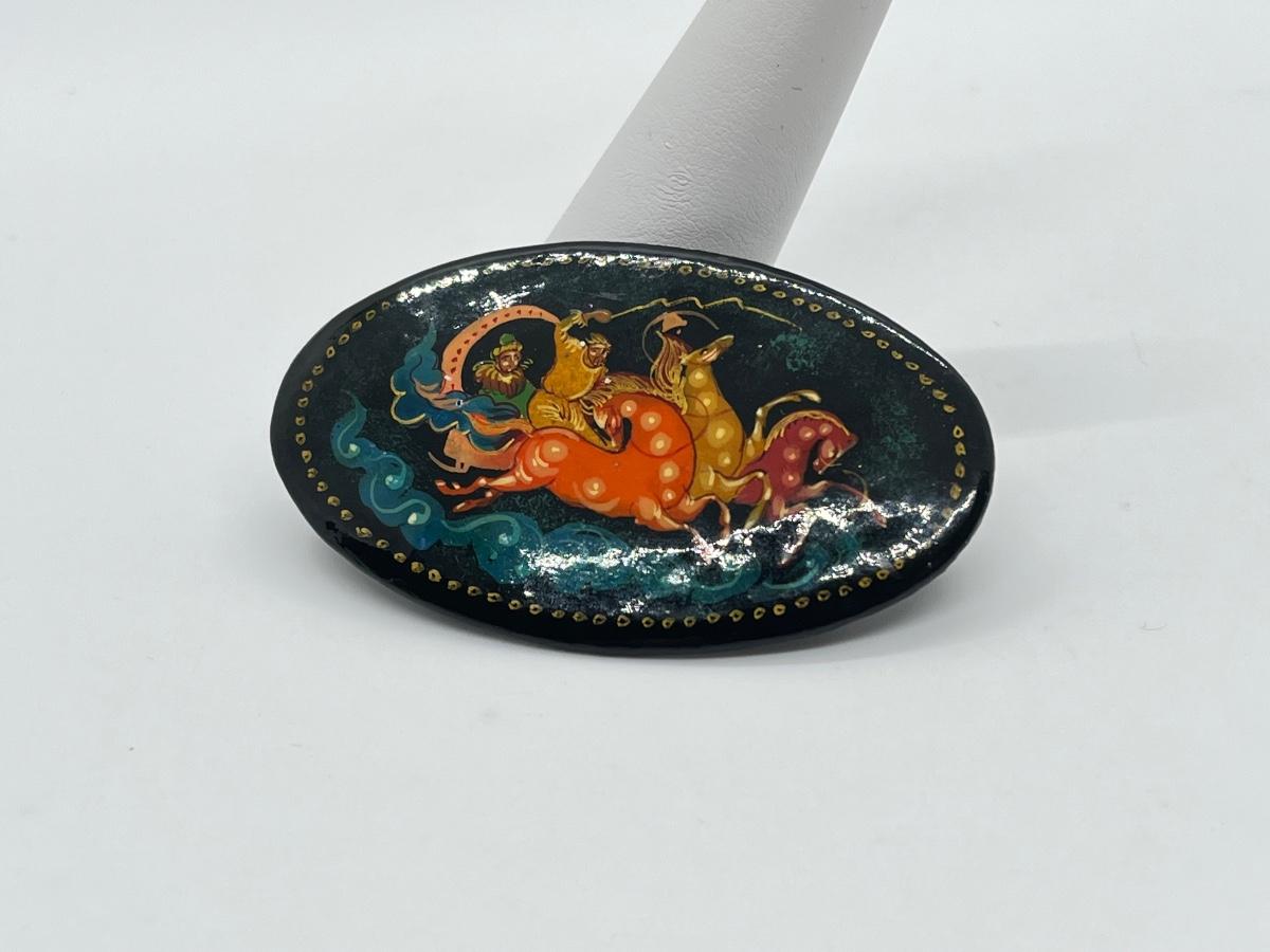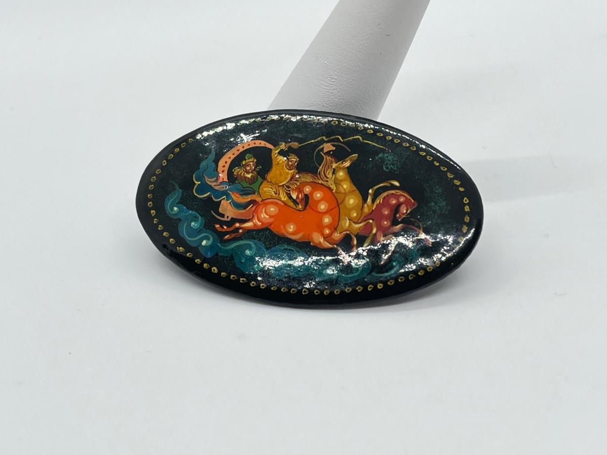 LOT 63: Russian Black Lacquer Brooch Painted w. Troika Pulling Sleigh
