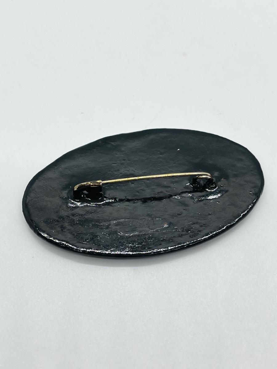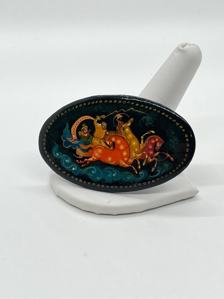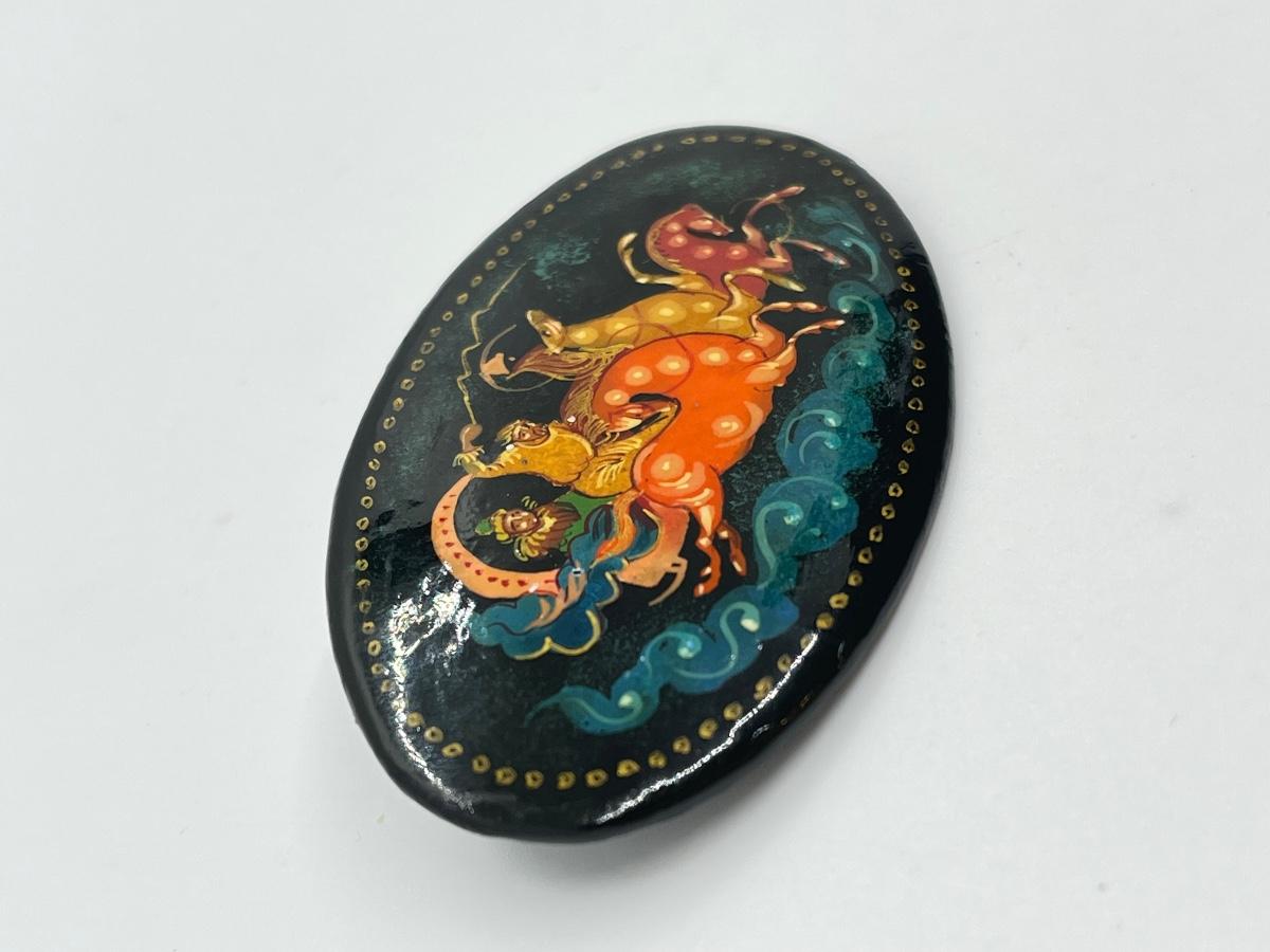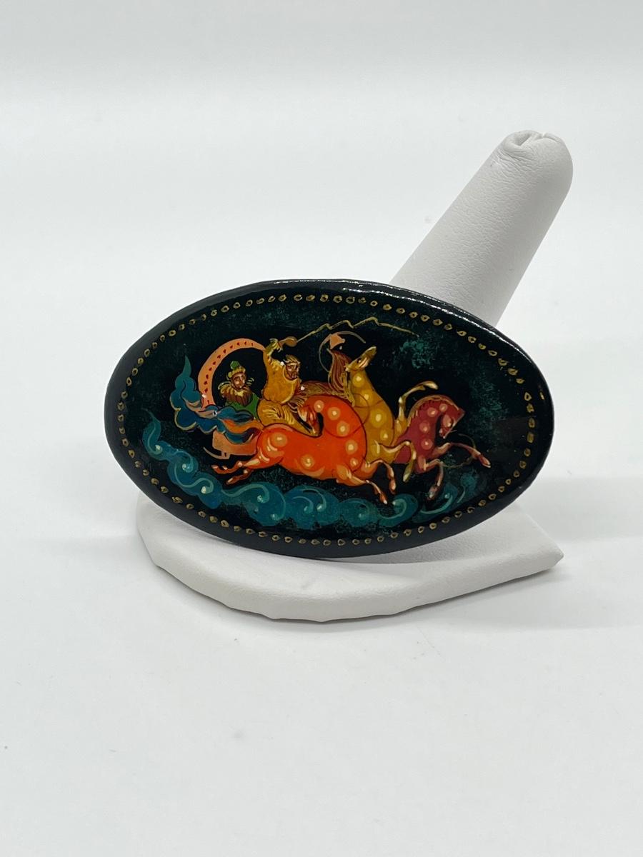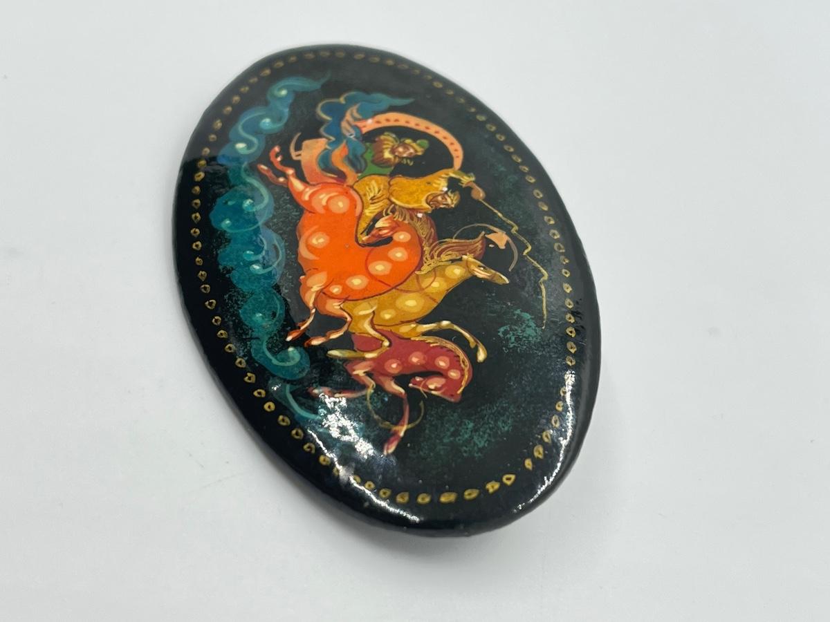 LOT 63: Russian Black Lacquer Brooch Painted w. Troika Pulling Sleigh