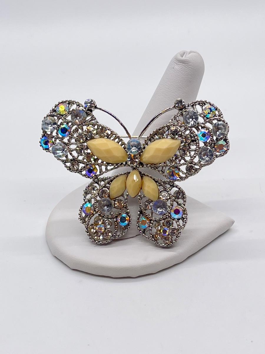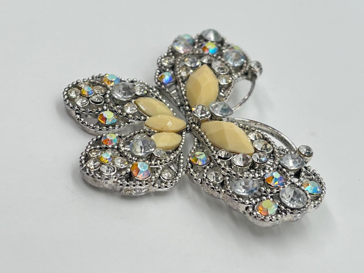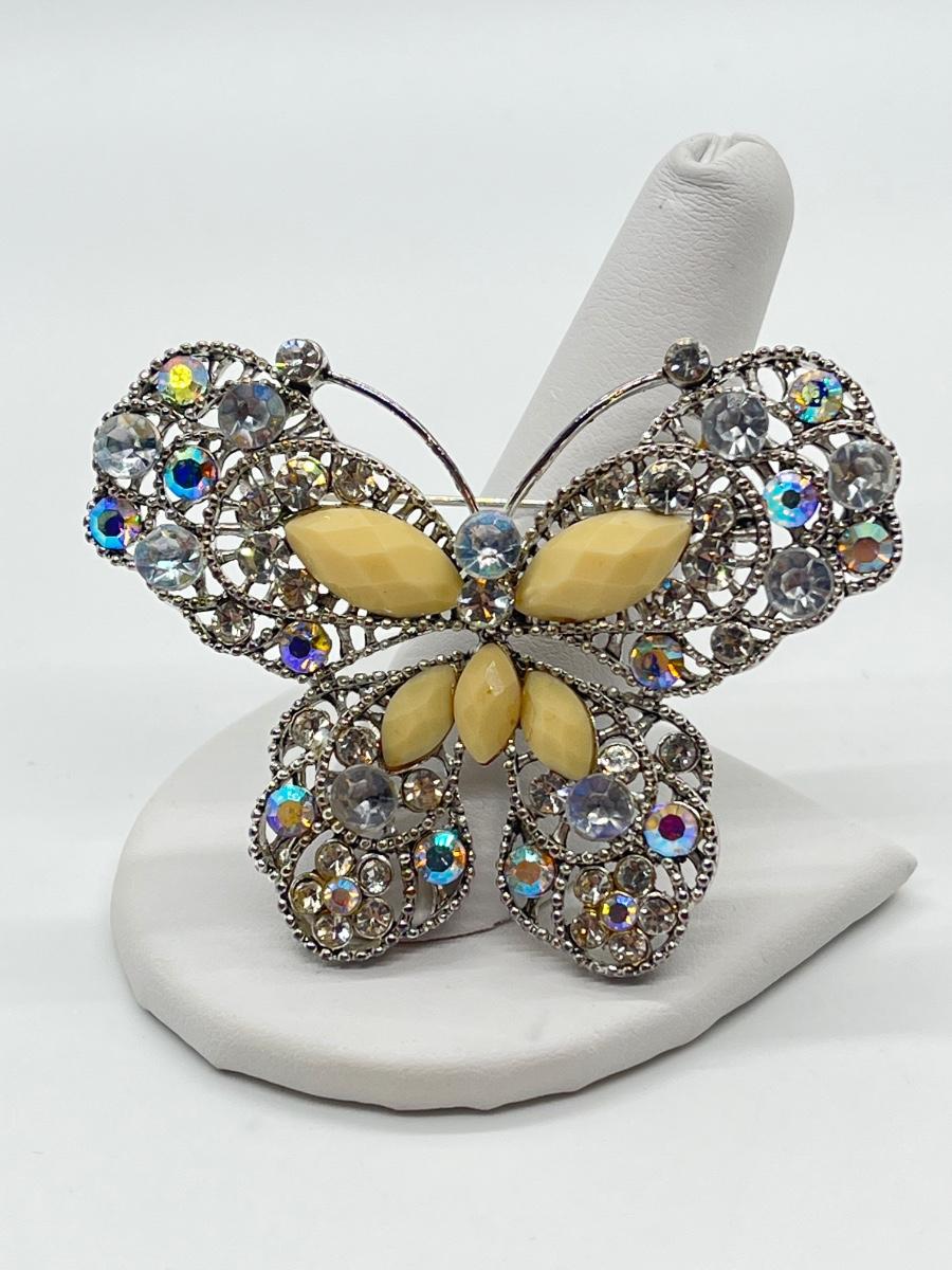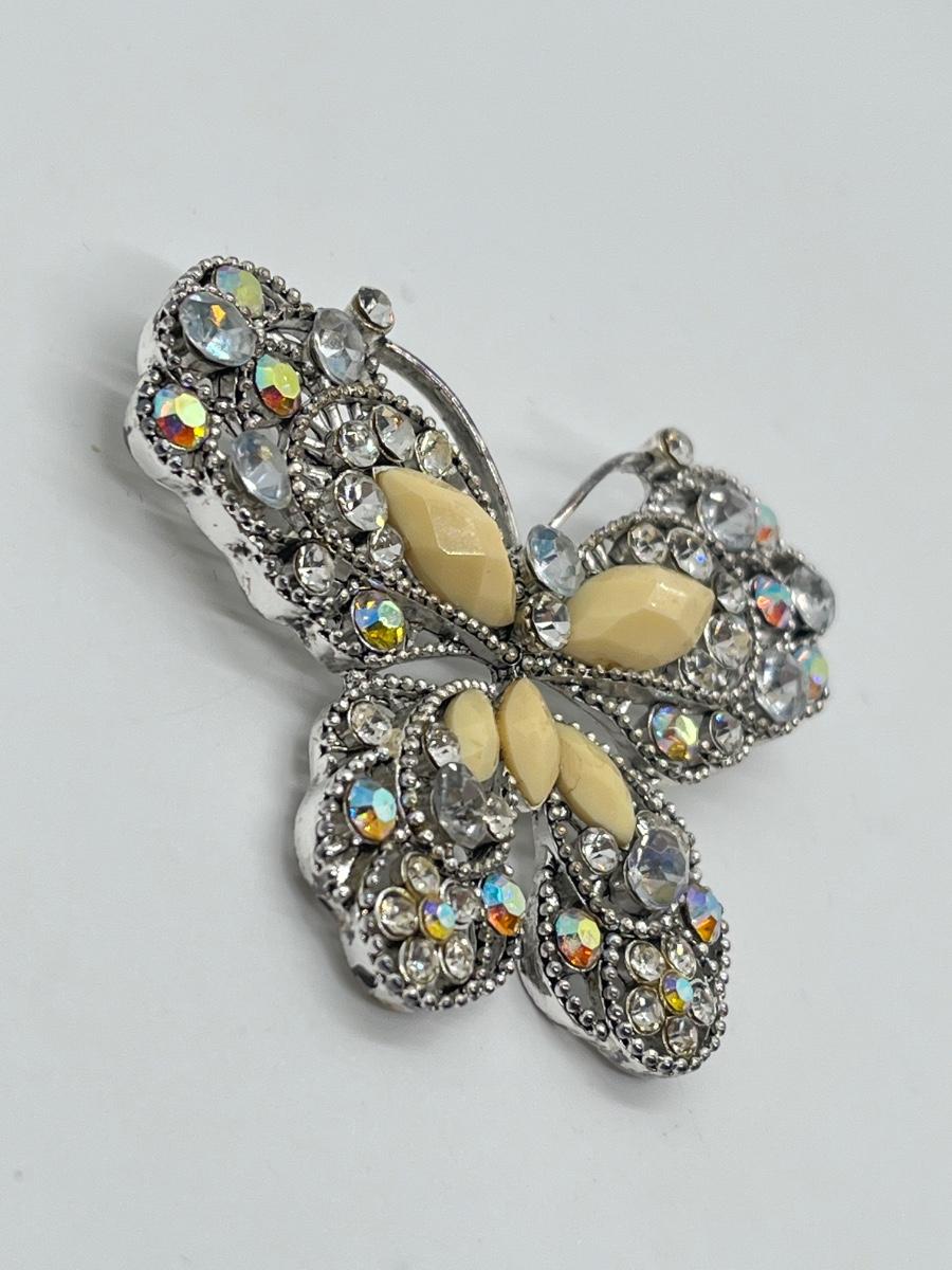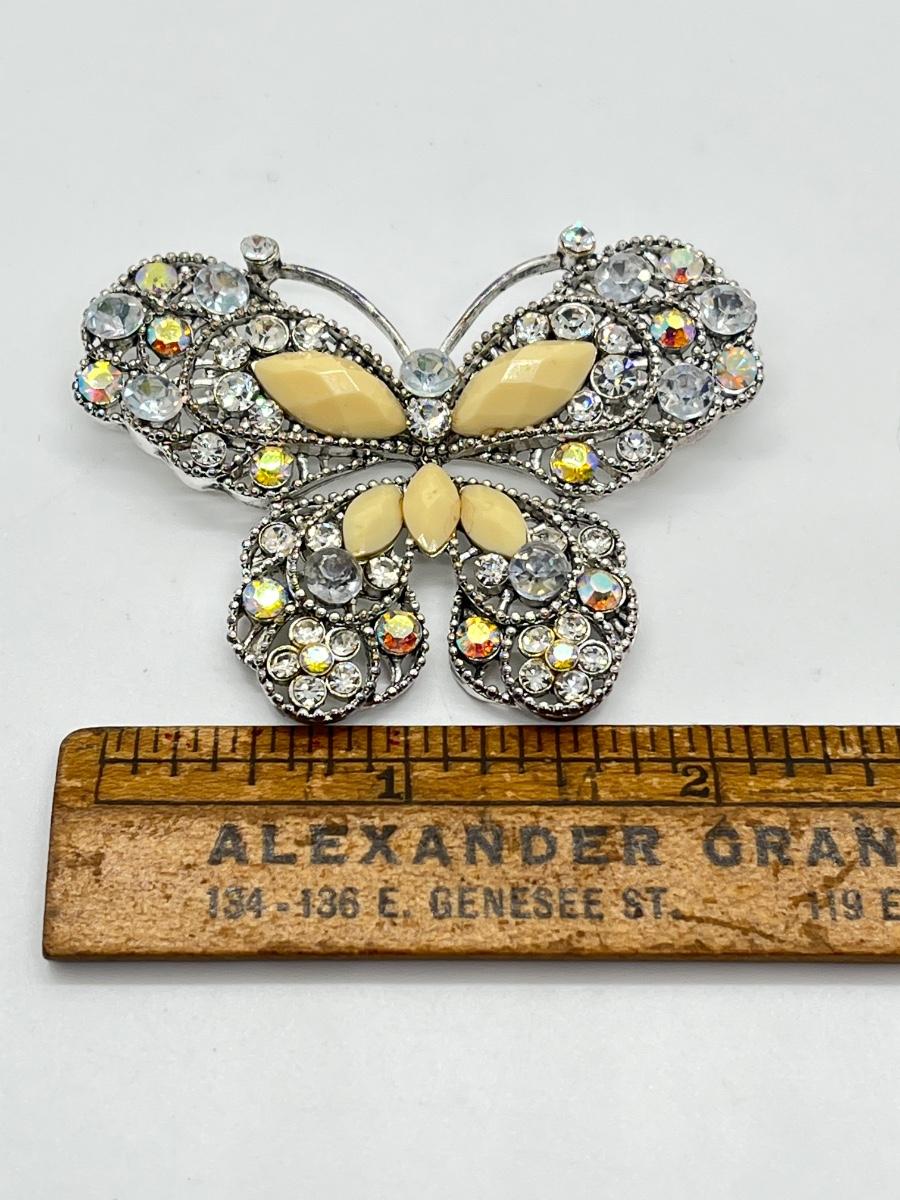 LOT 65: Silvertone Butterfly Brooch / Pin - Cream Acrylic / Crystal Stone