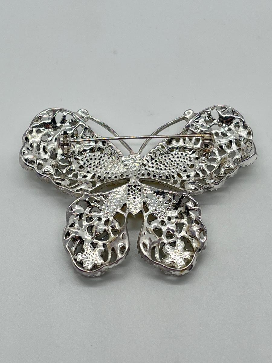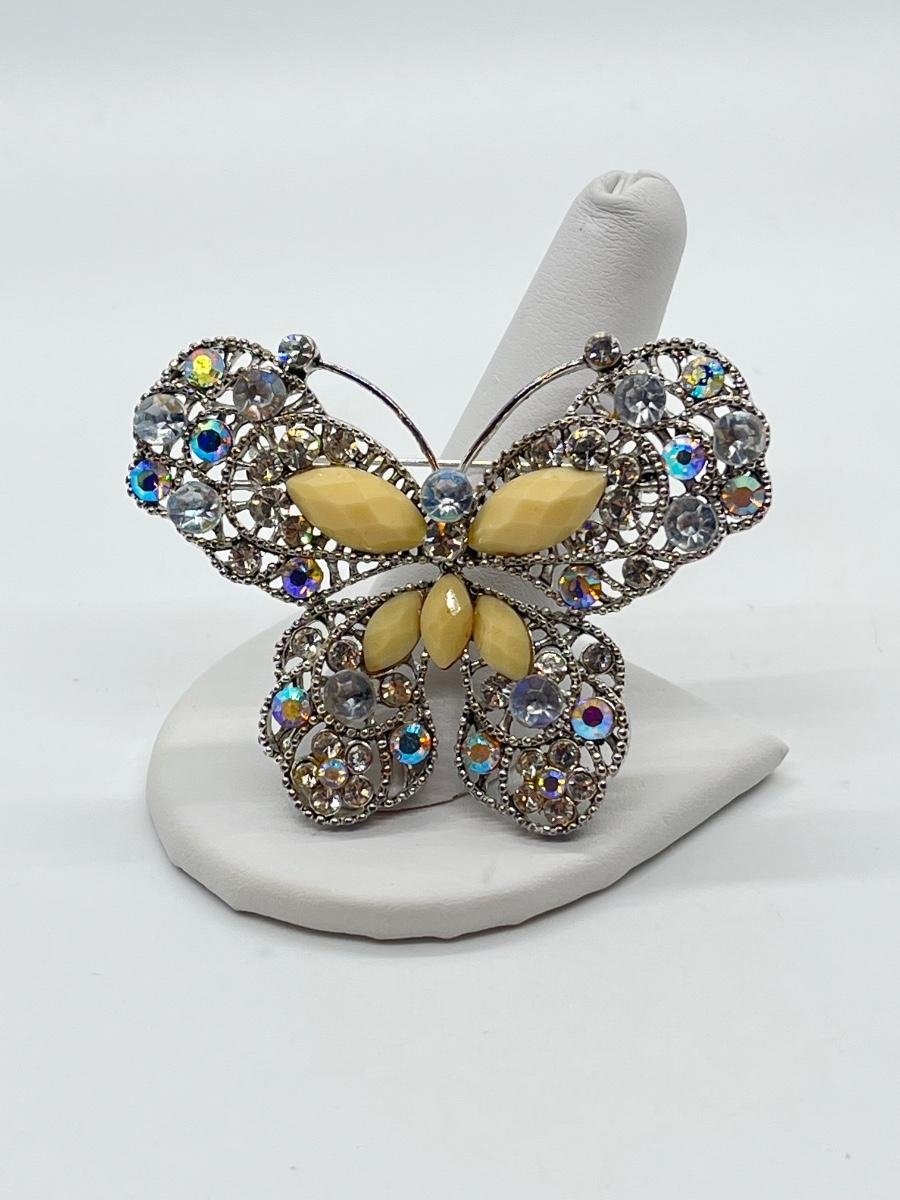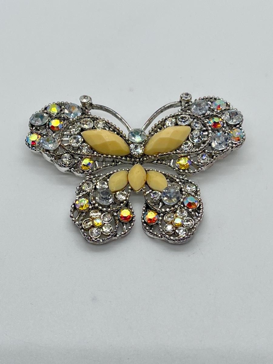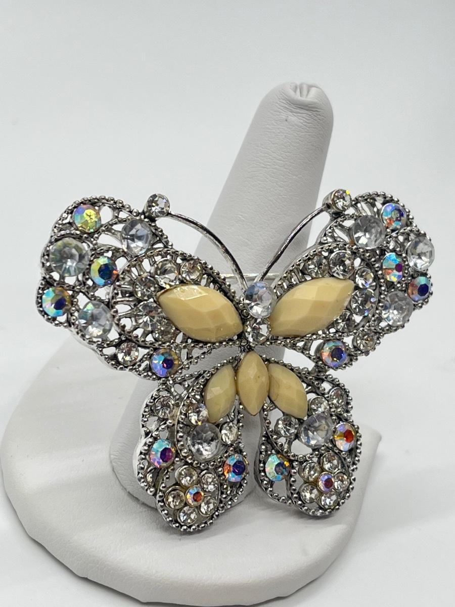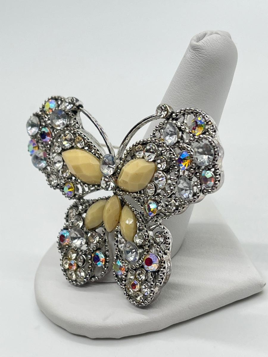 LOT 65: Silvertone Butterfly Brooch / Pin - Cream Acrylic / Crystal Stone