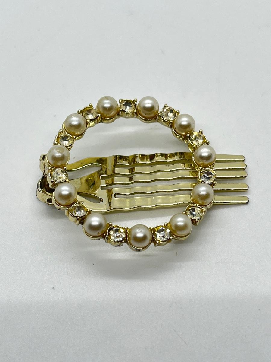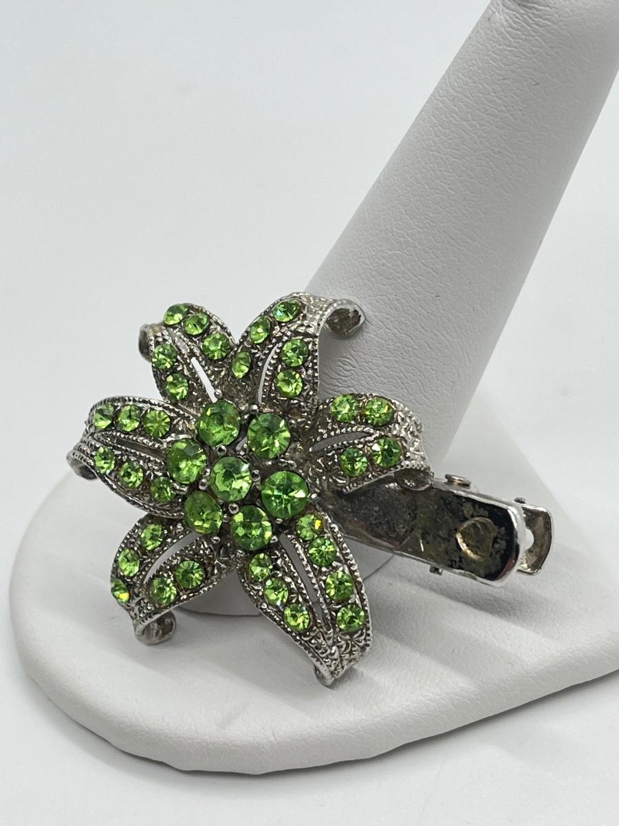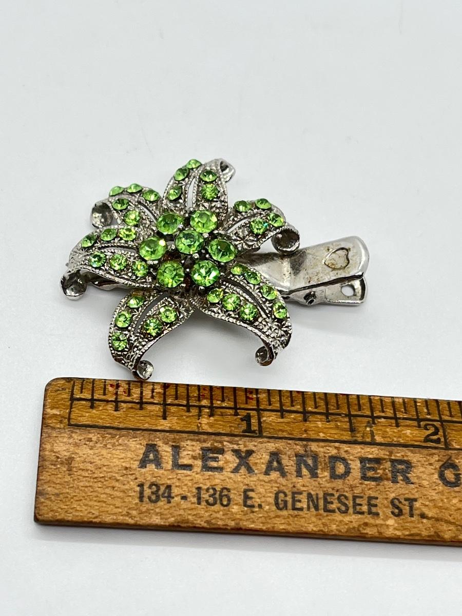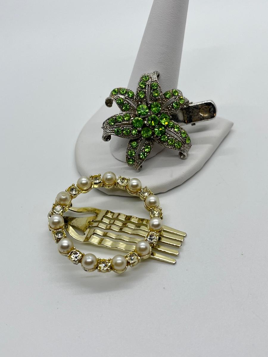 LOT 66: Two Vintage Hair Clips - Silvertone w/ Green Rhinestones, Goldtone w/ Faux Pearls