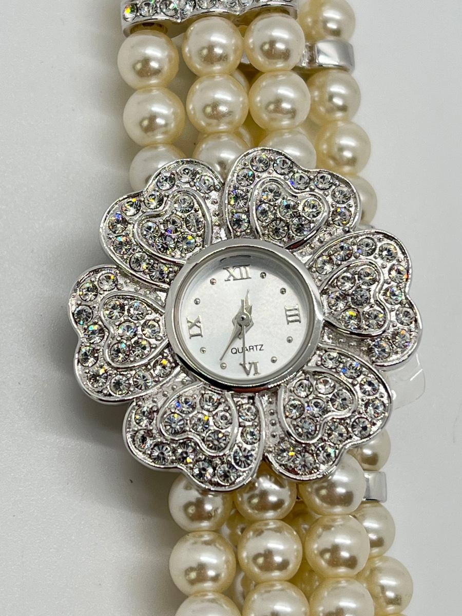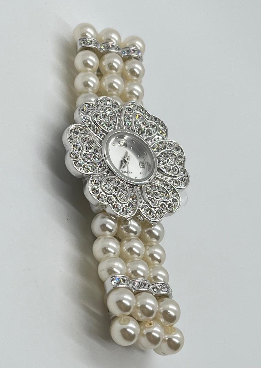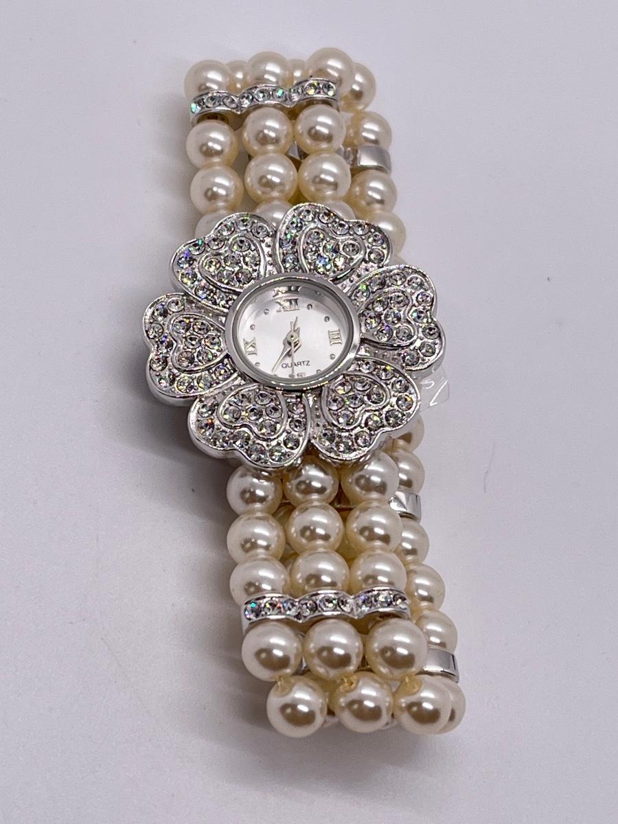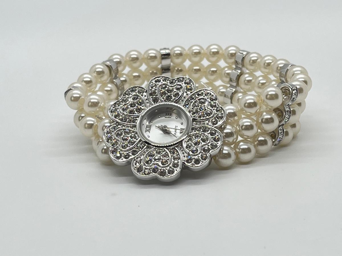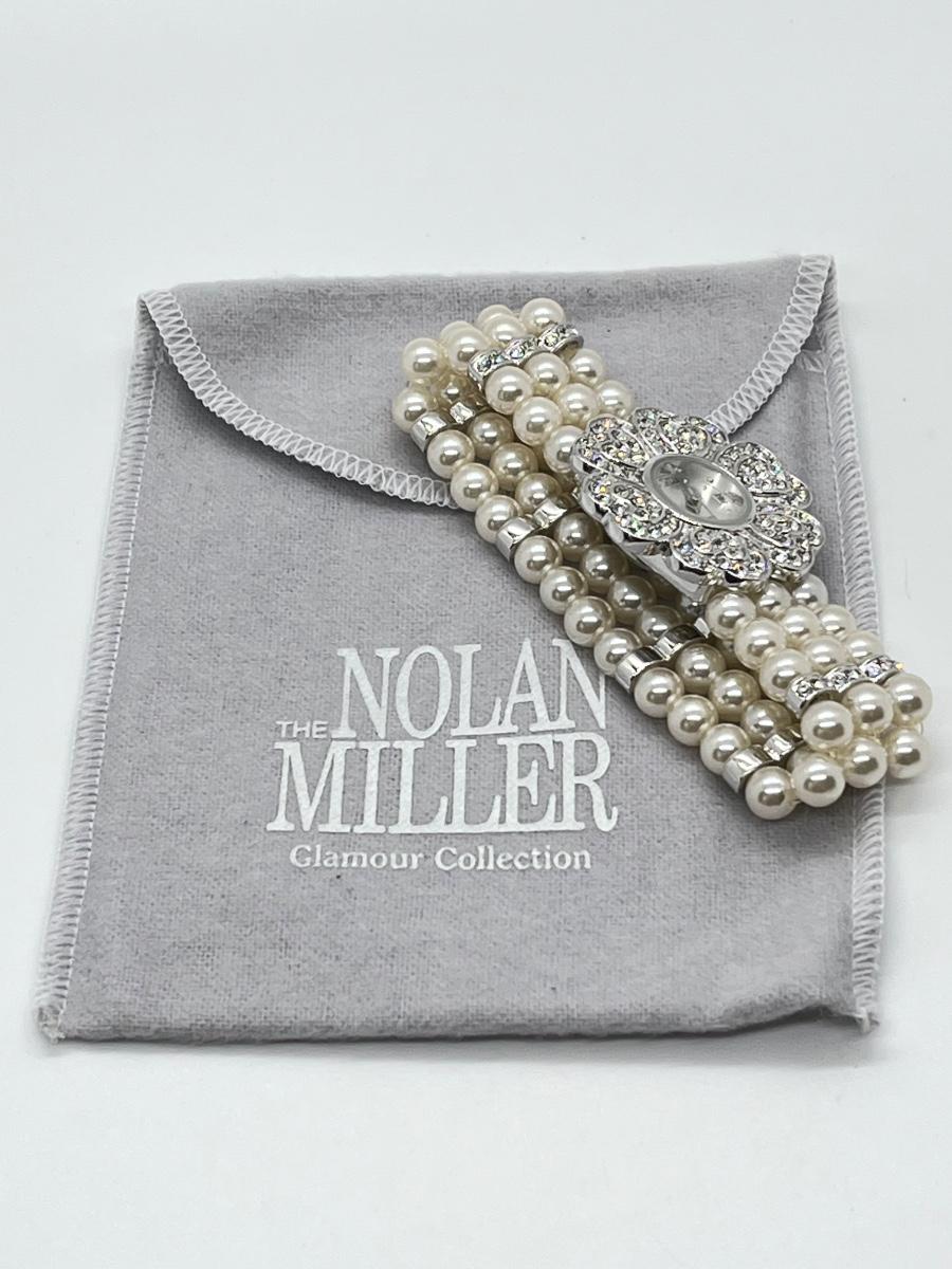 LOT 95: Nolan Miller Faux Pearl Stretch Bracelet Watch in Original Box (needs battery)
