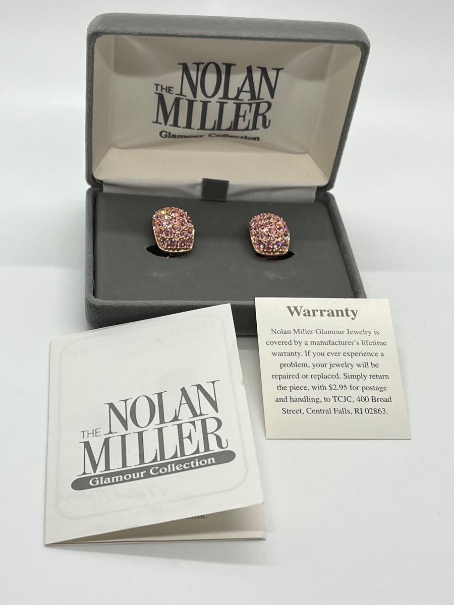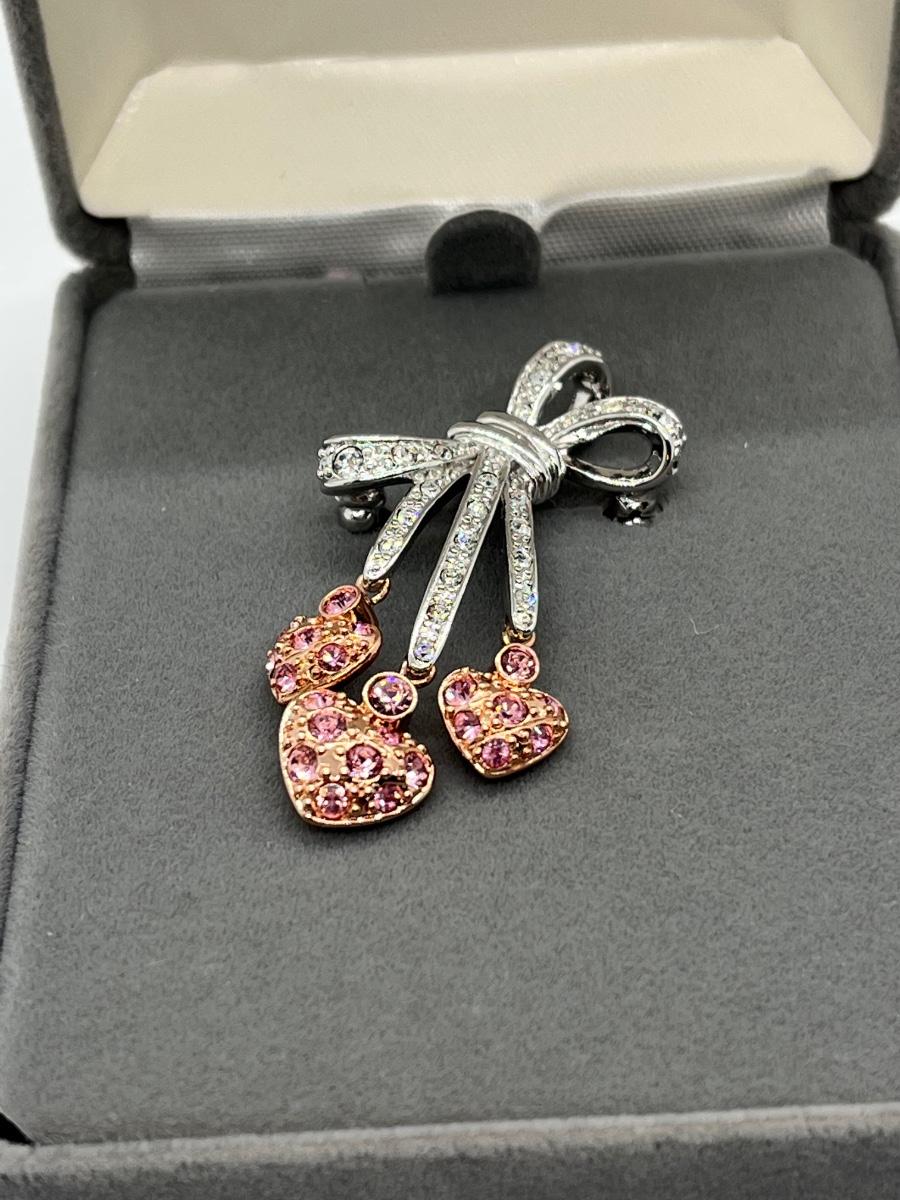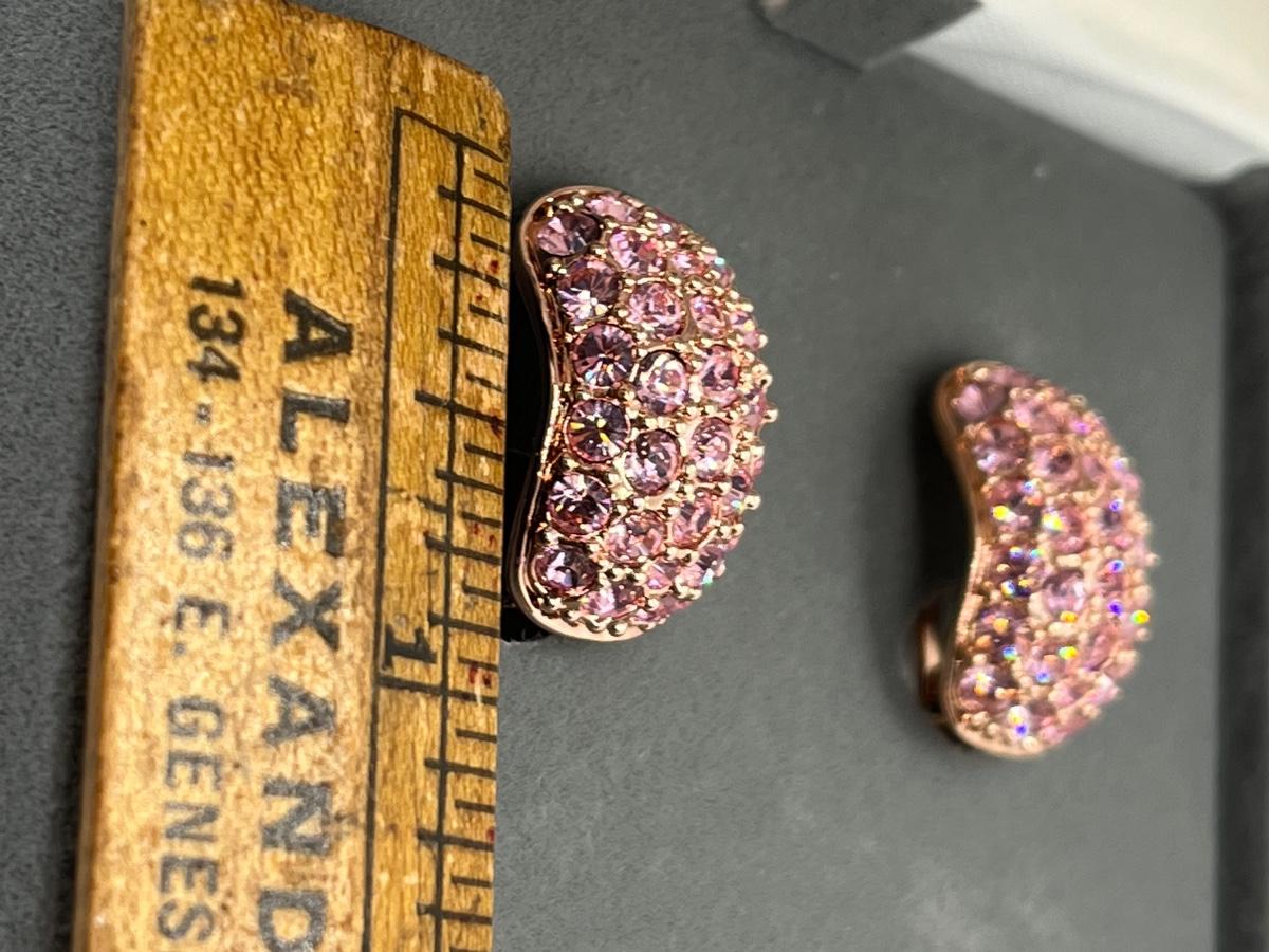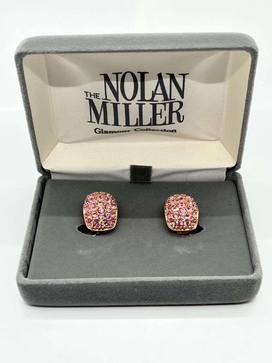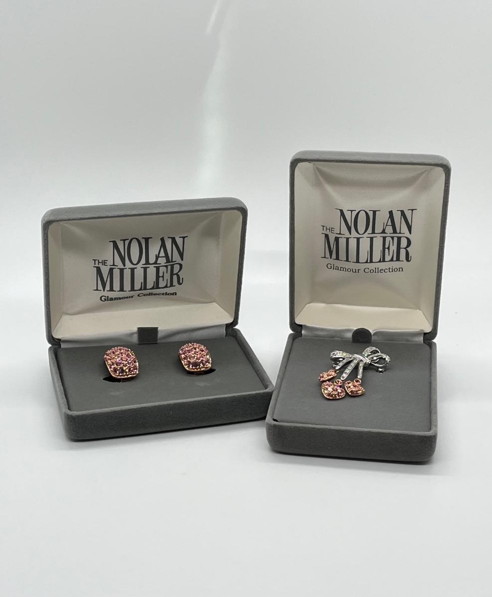 LOT 98: Nolan Miller Pink Pave Clip-On Demi-Hoop Earrings & Charming Bow Pin in Original Boxes
