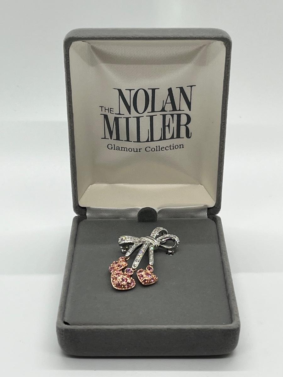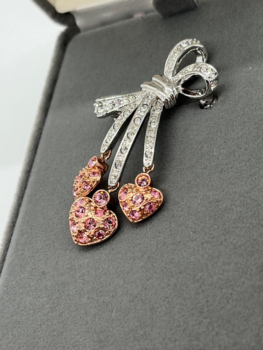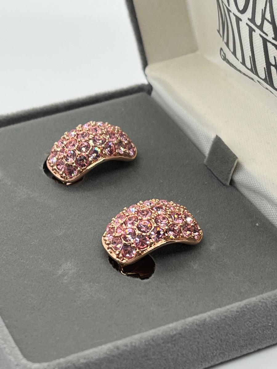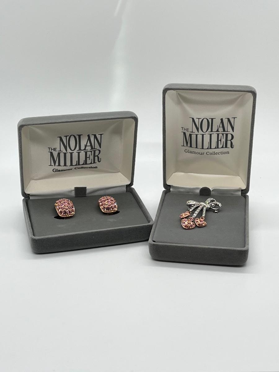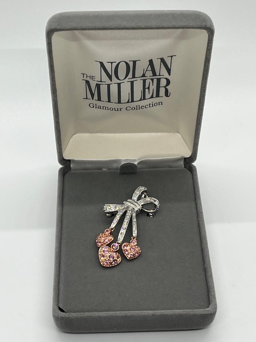 LOT 98: Nolan Miller Pink Pave Clip-On Demi-Hoop Earrings & Charming Bow Pin in Original Boxes