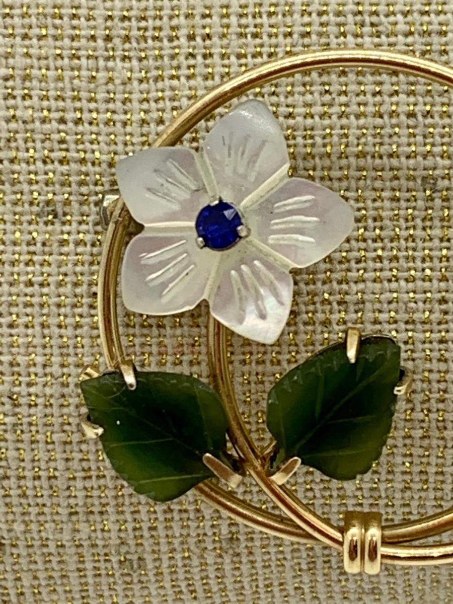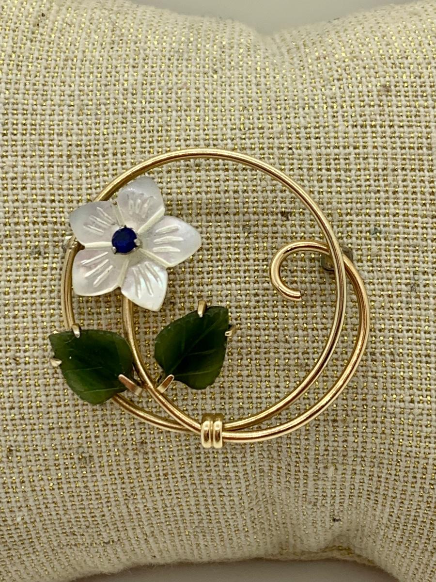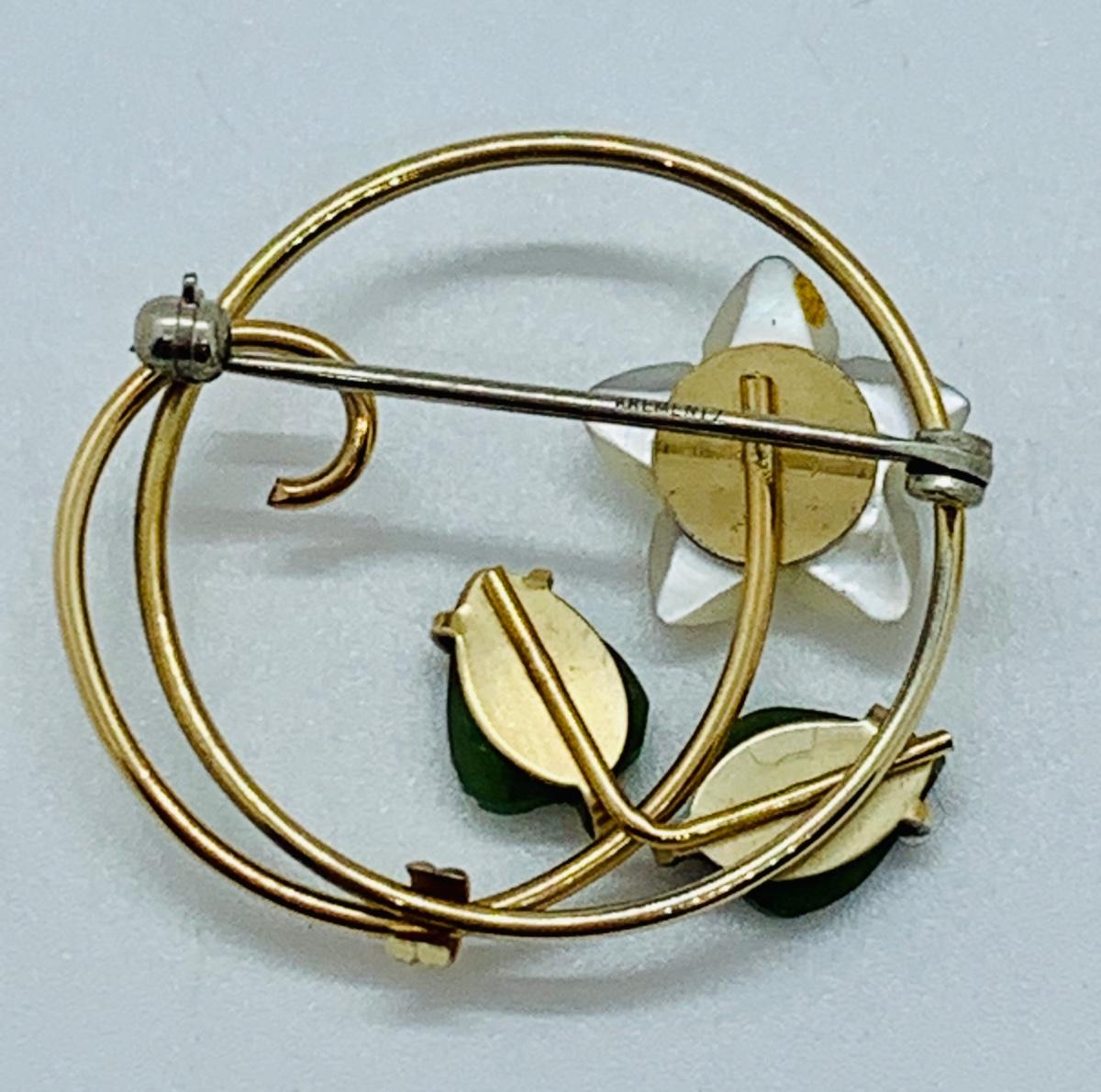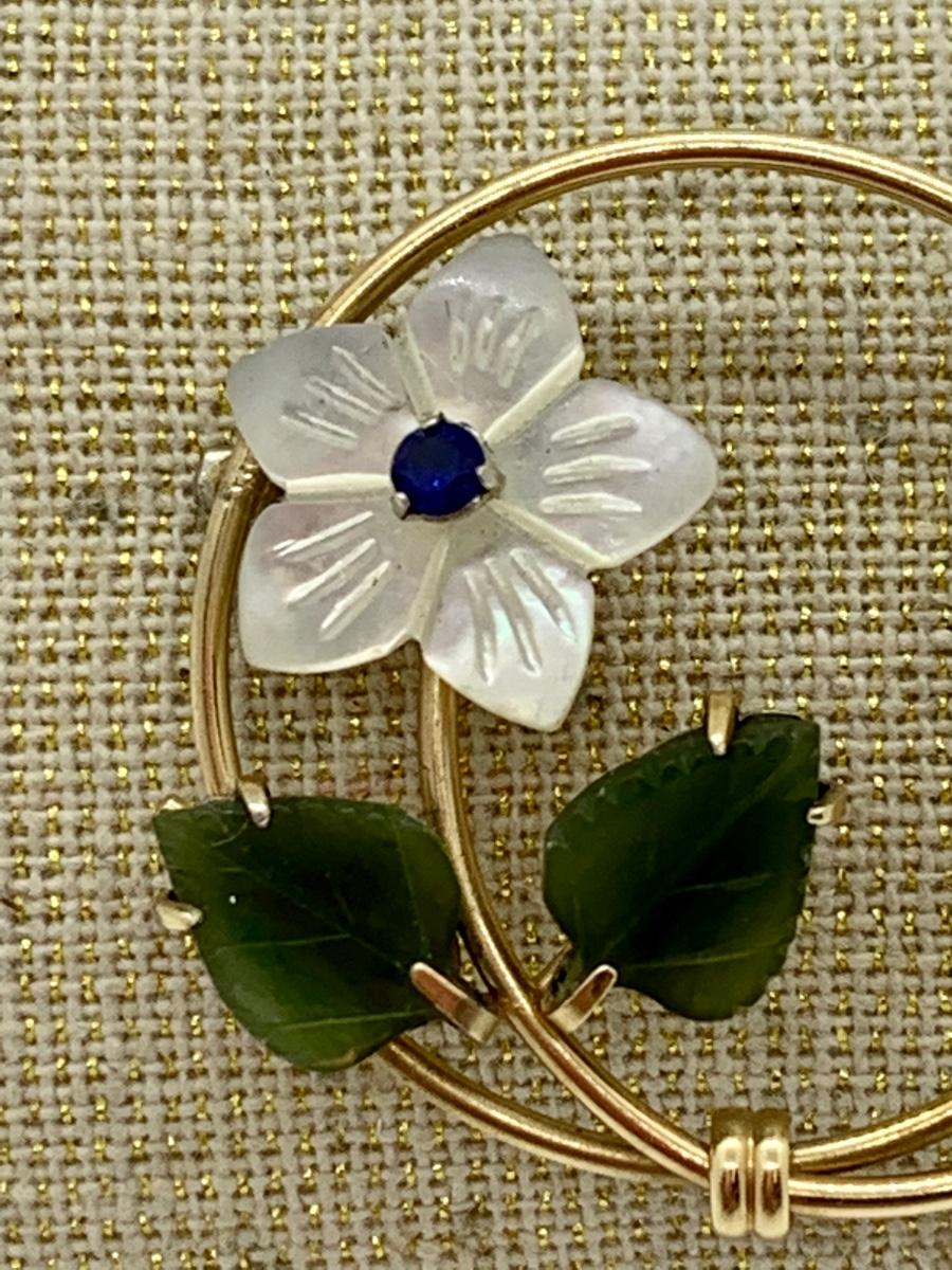 LOT 10R: Vintage Krementz Brooch. Mother of Pearl & Jade