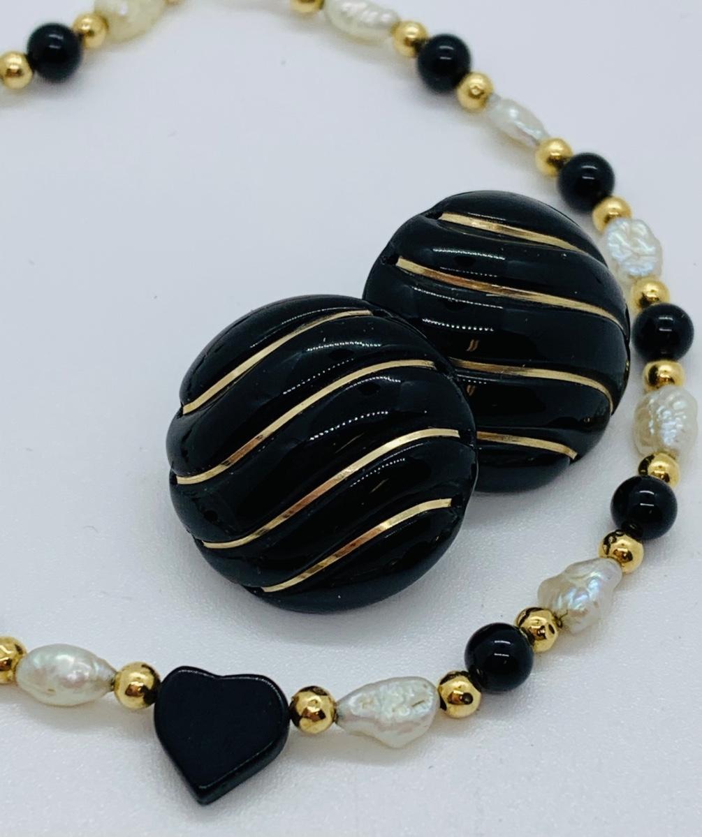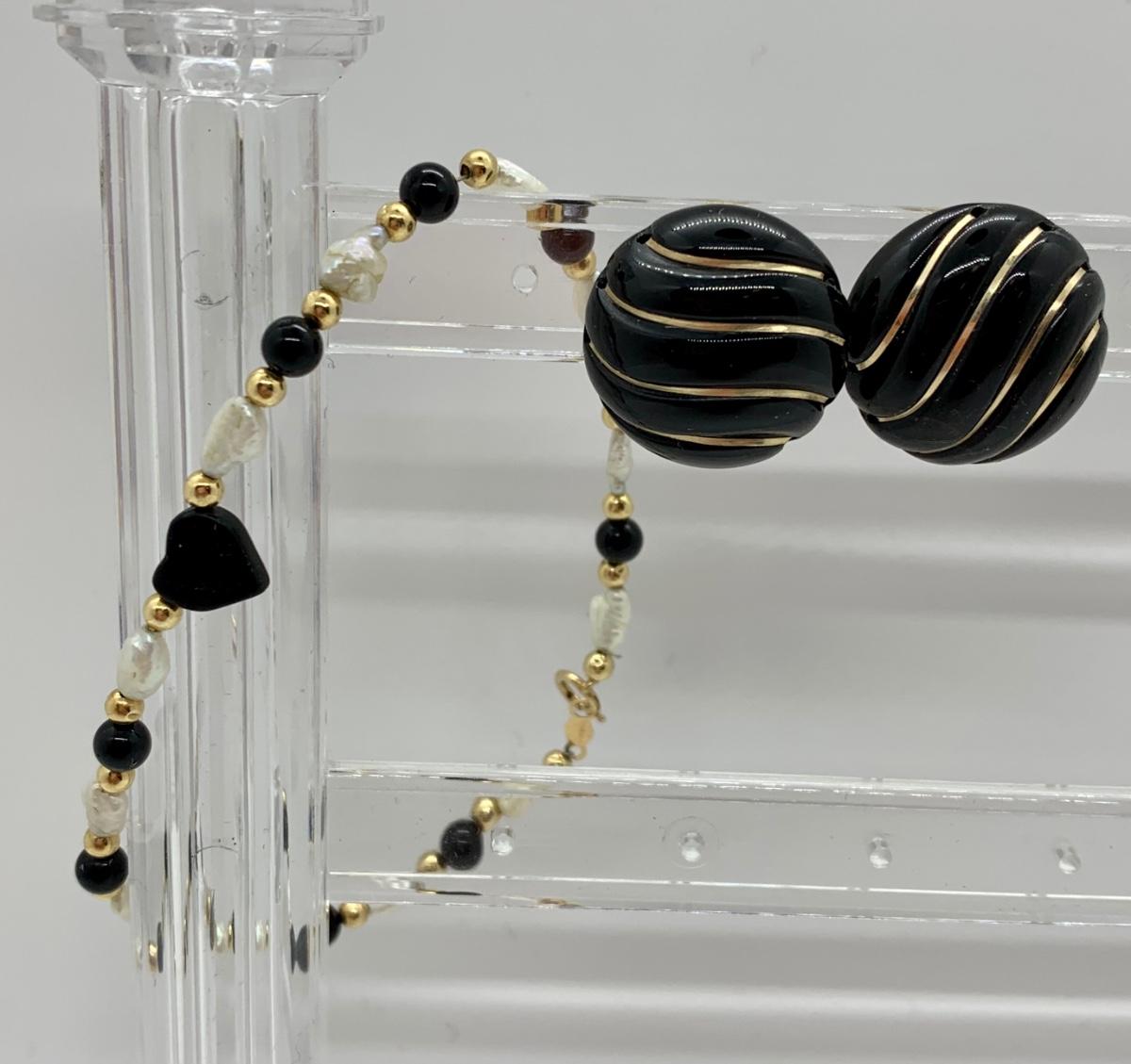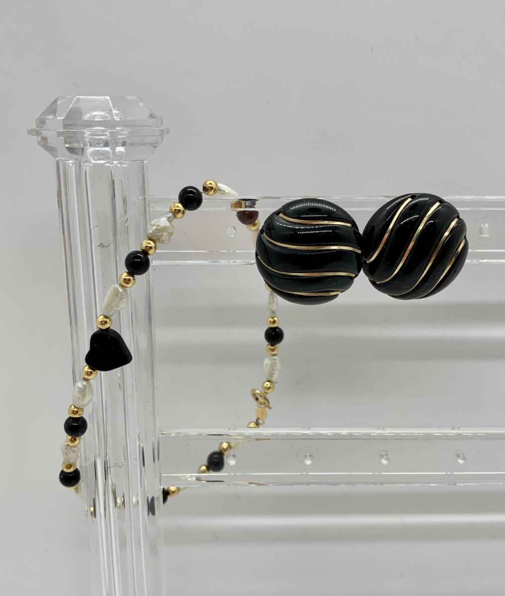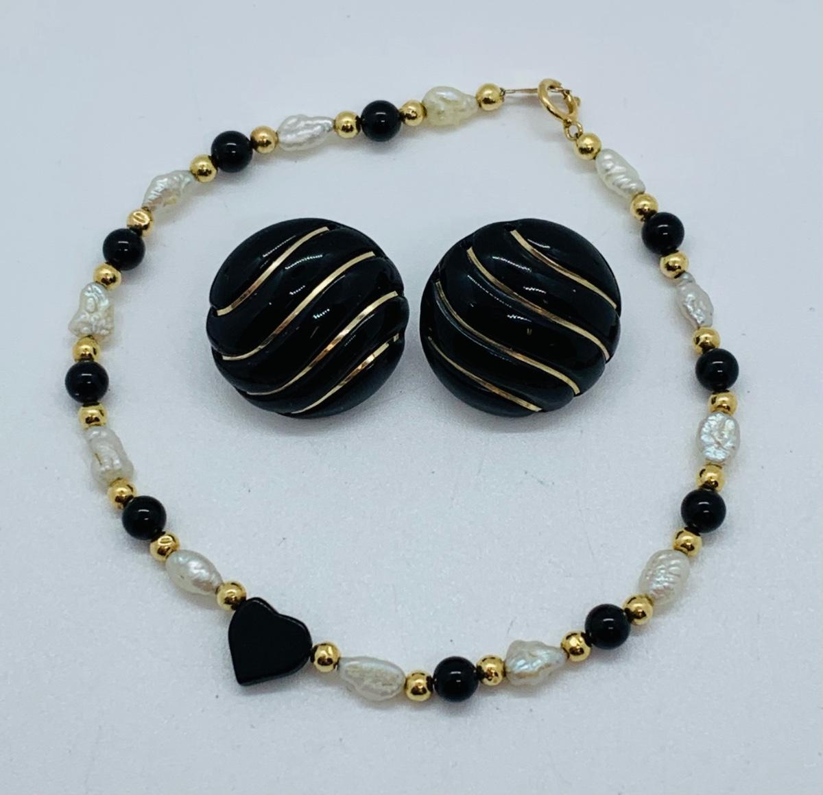 LOT 15R: Fresh Water Pearl & Black Onyx 8" Bracelet w/ 14K Beads & Clasp along with 14K Black & Gold Pierced Earrings