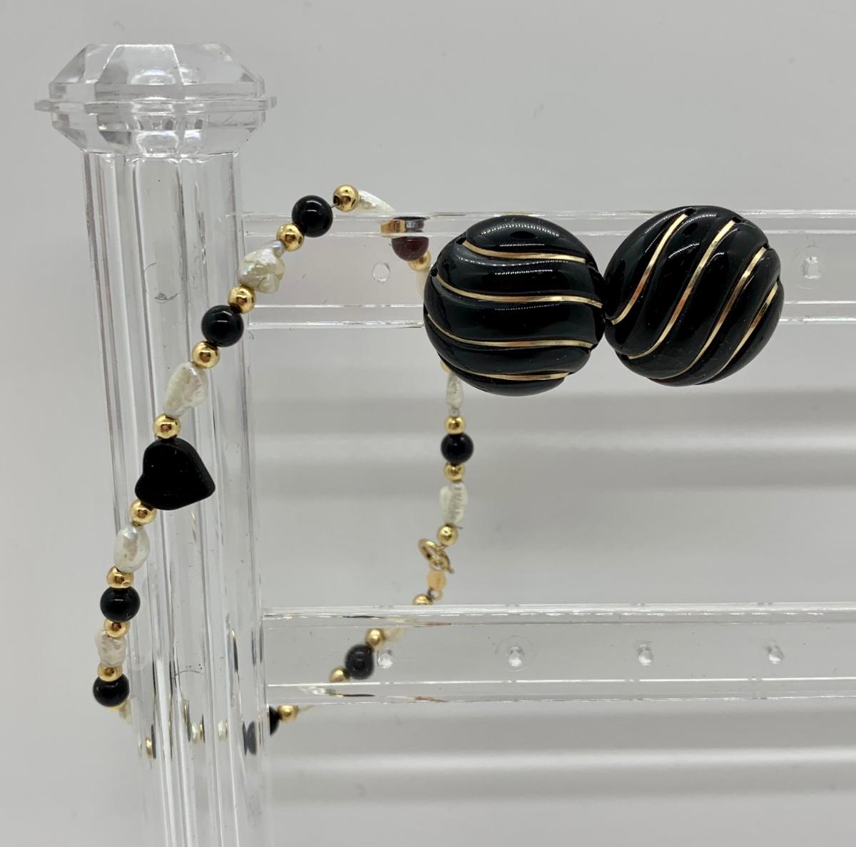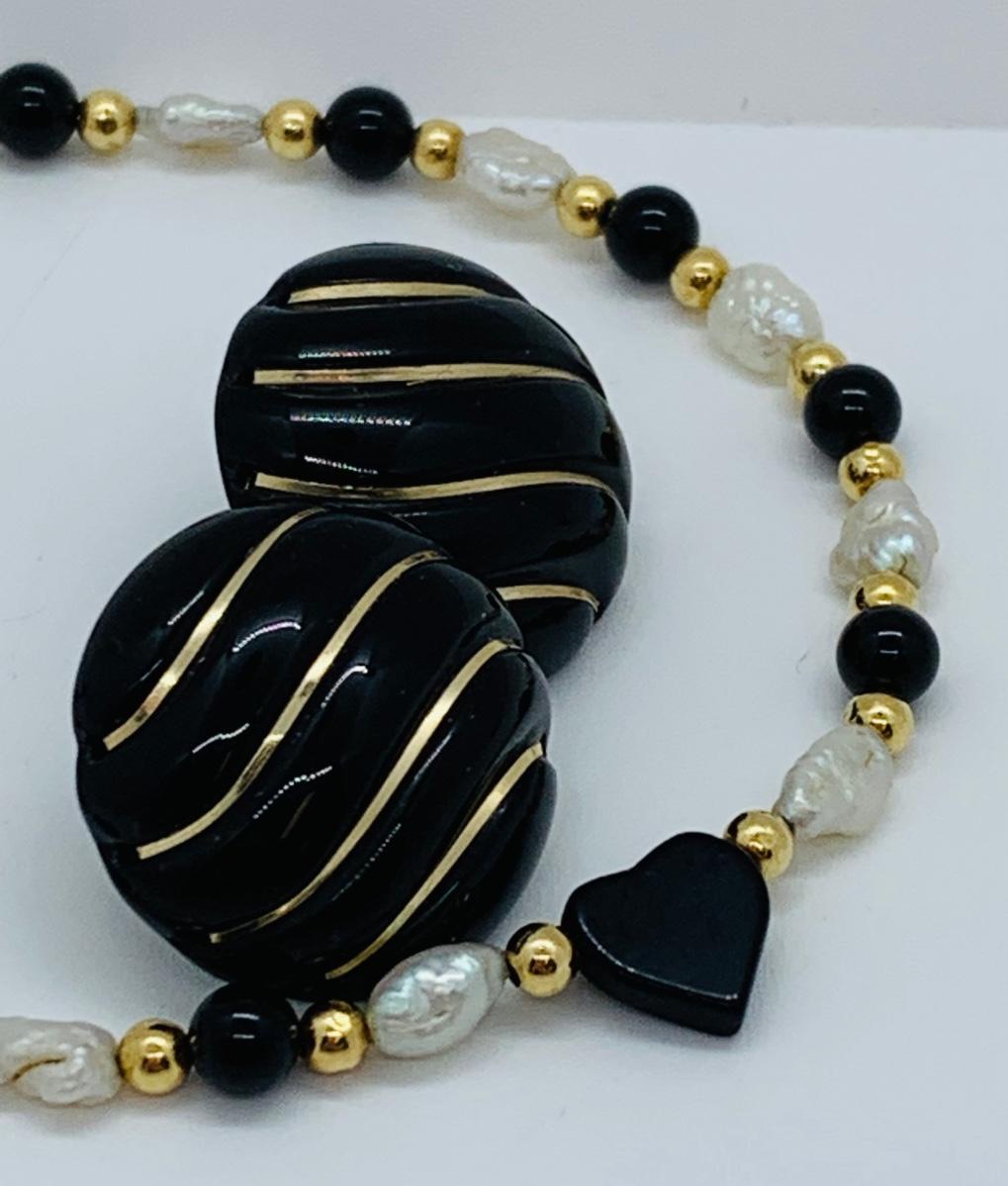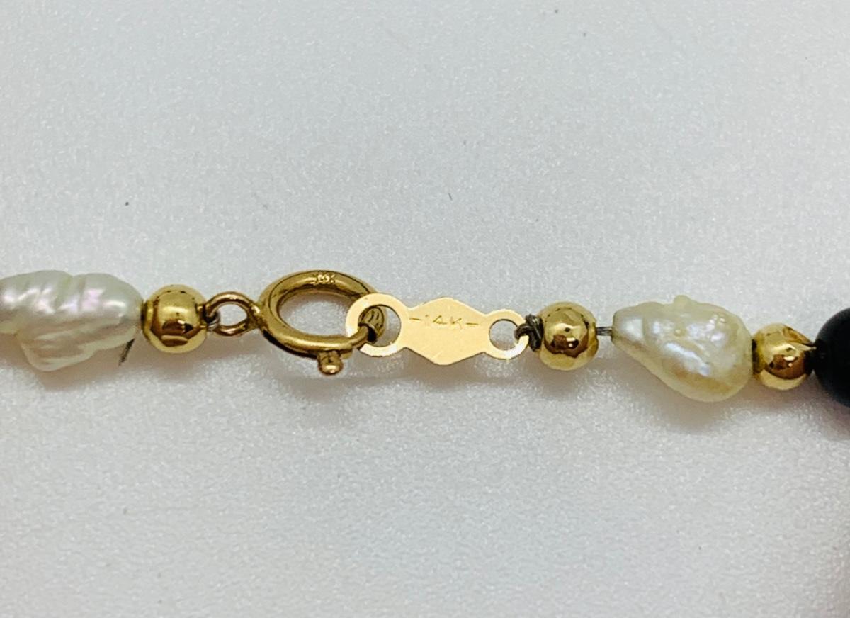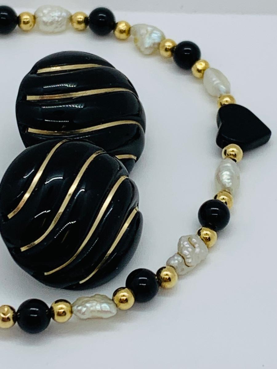 LOT 15R: Fresh Water Pearl & Black Onyx 8" Bracelet w/ 14K Beads & Clasp along with 14K Black & Gold Pierced Earrings