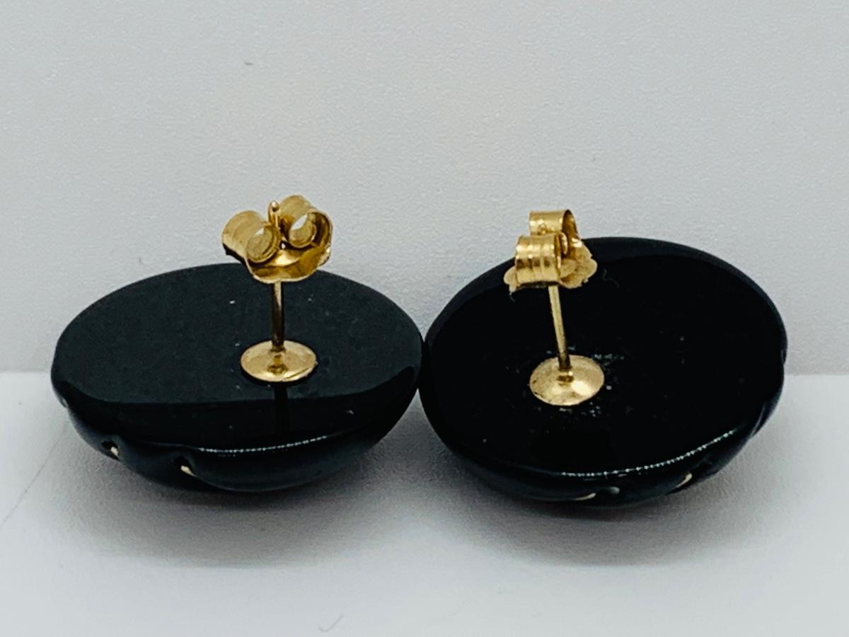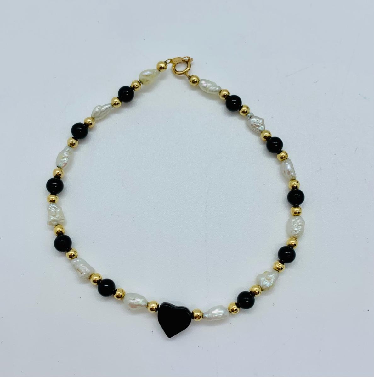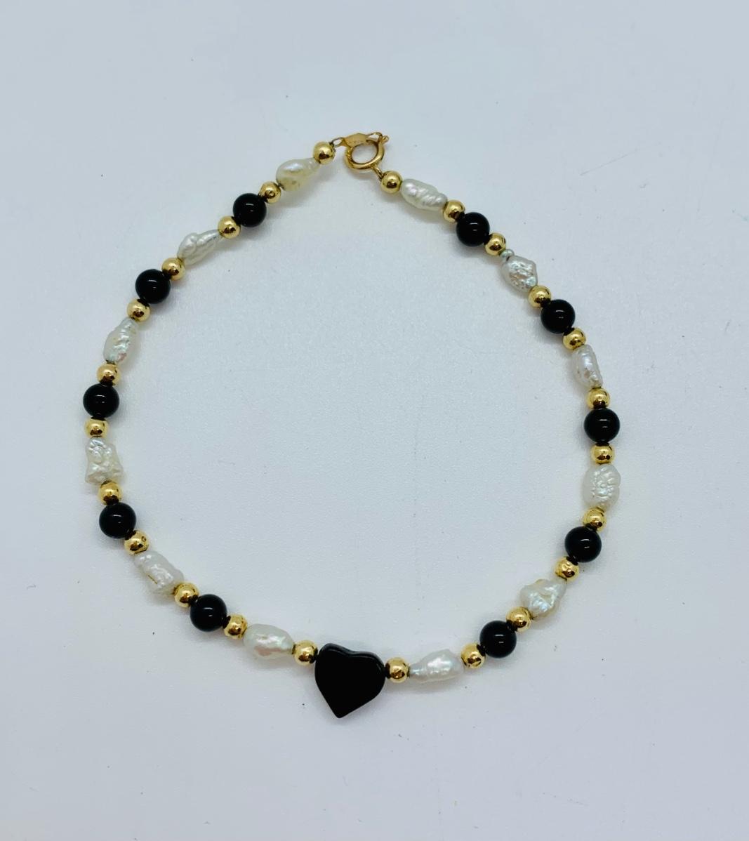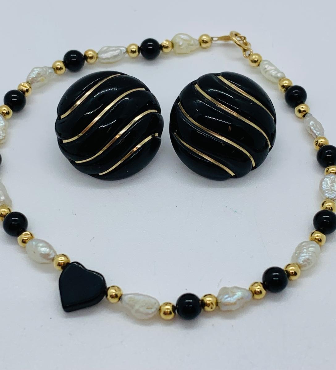 LOT 15R: Fresh Water Pearl & Black Onyx 8" Bracelet w/ 14K Beads & Clasp along with 14K Black & Gold Pierced Earrings