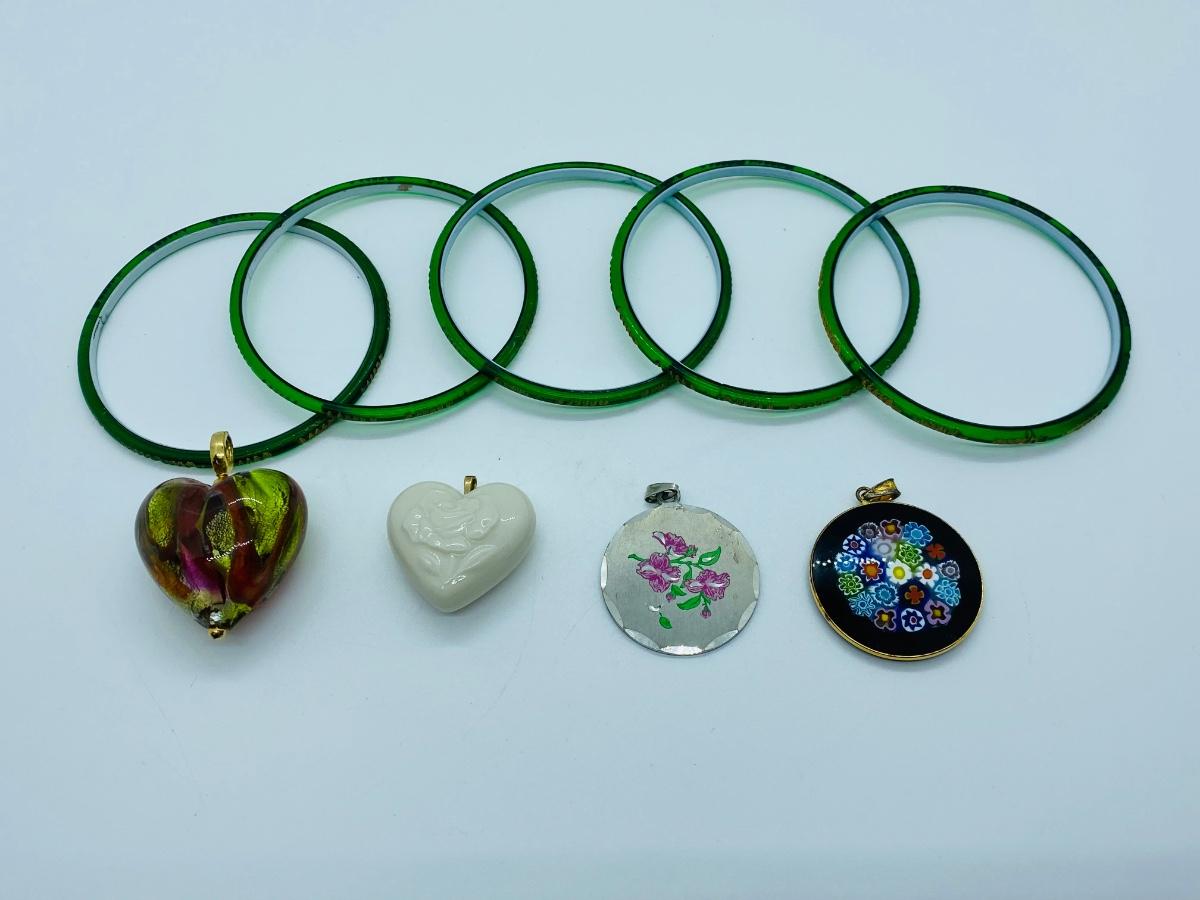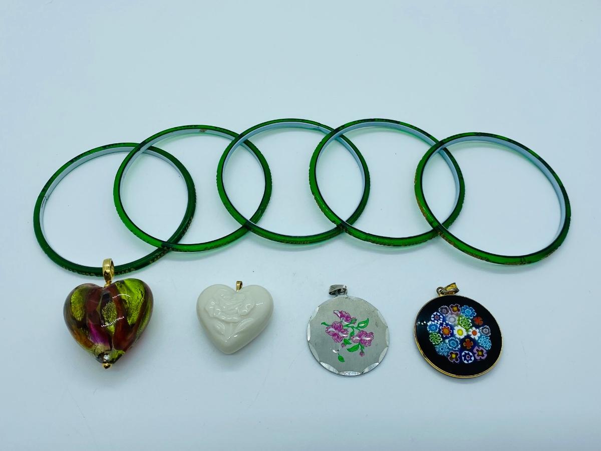 LOTJ: Vintage Citizen Diamond Cut Bangles w/Original Box, Glass Heart Pendant, Heart w/Rose Pendant, & 2 Rd. Floral Pendants