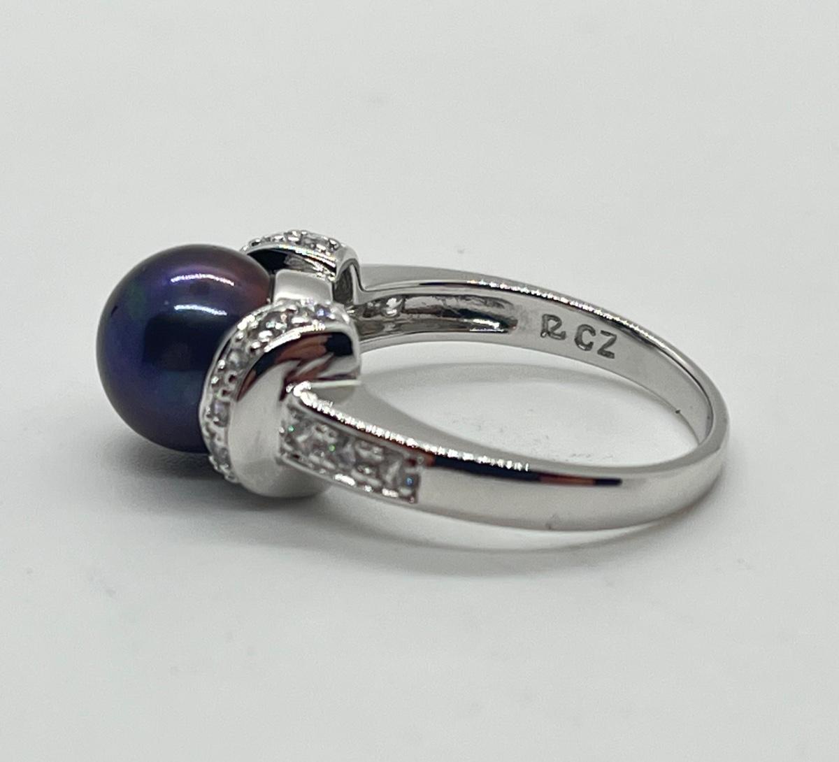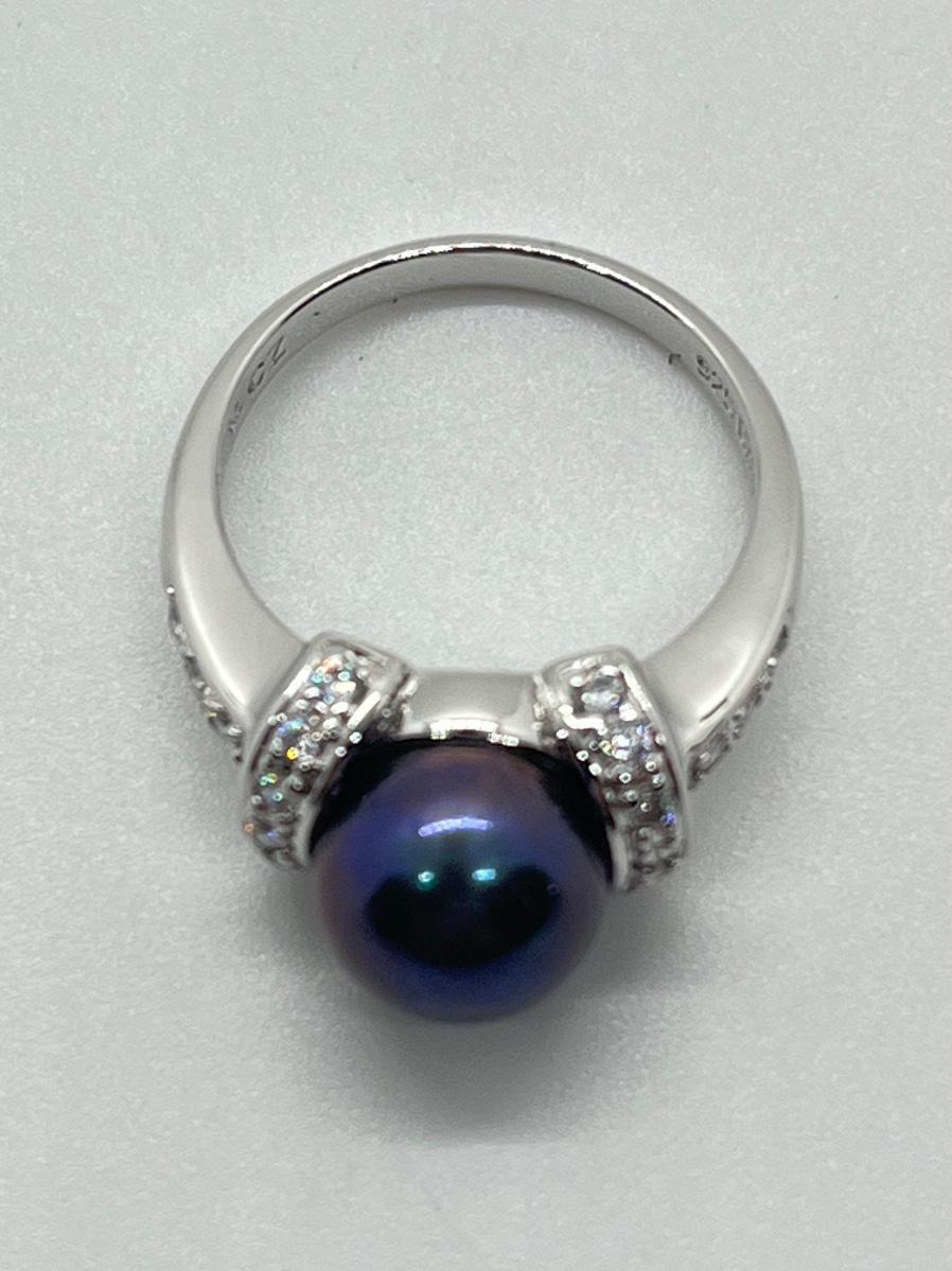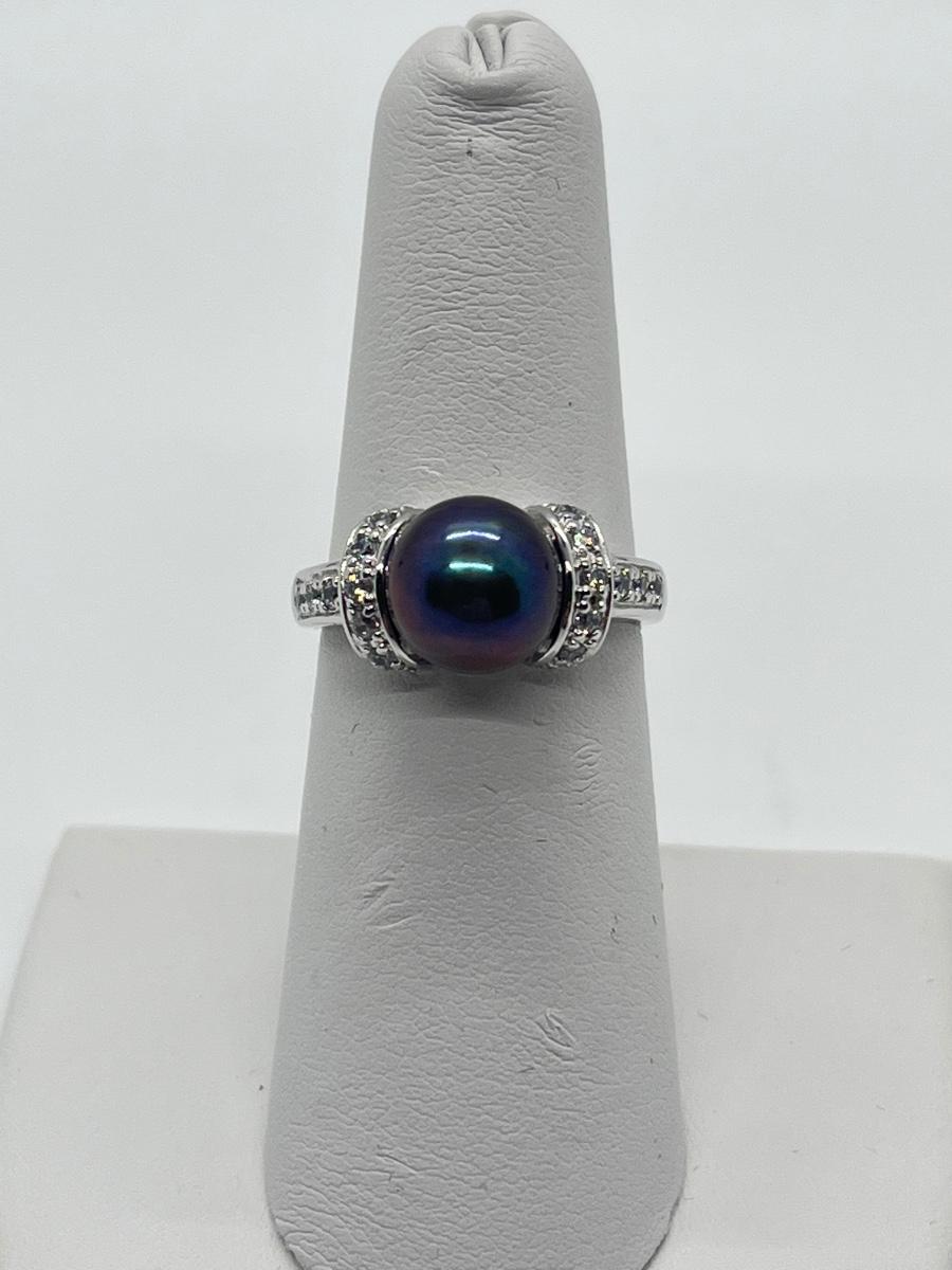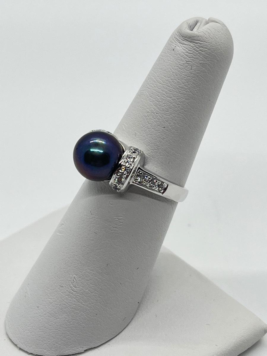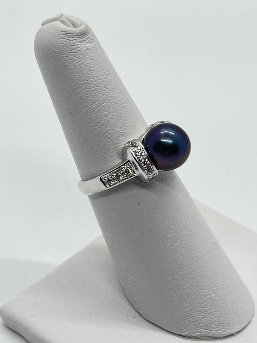 LOTJ36: Epiphany Platinum Clad Silver 925 & Diamonique Cultured Pearl Ring, Black, Sz6
