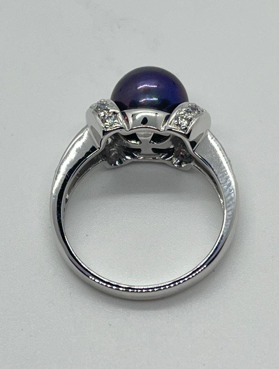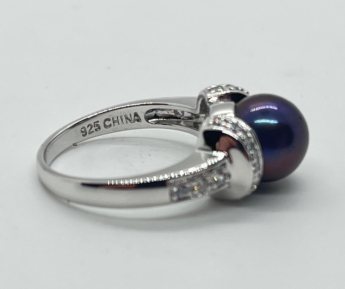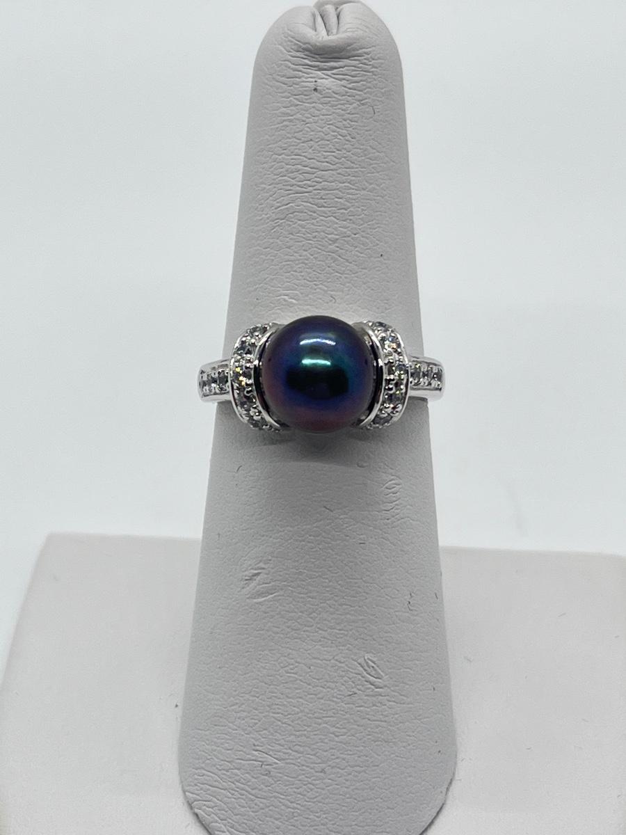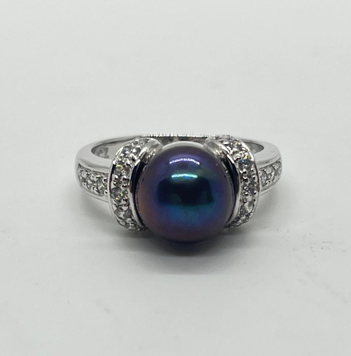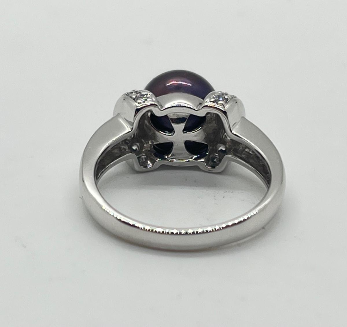 LOTJ36: Epiphany Platinum Clad Silver 925 & Diamonique Cultured Pearl Ring, Black, Sz6