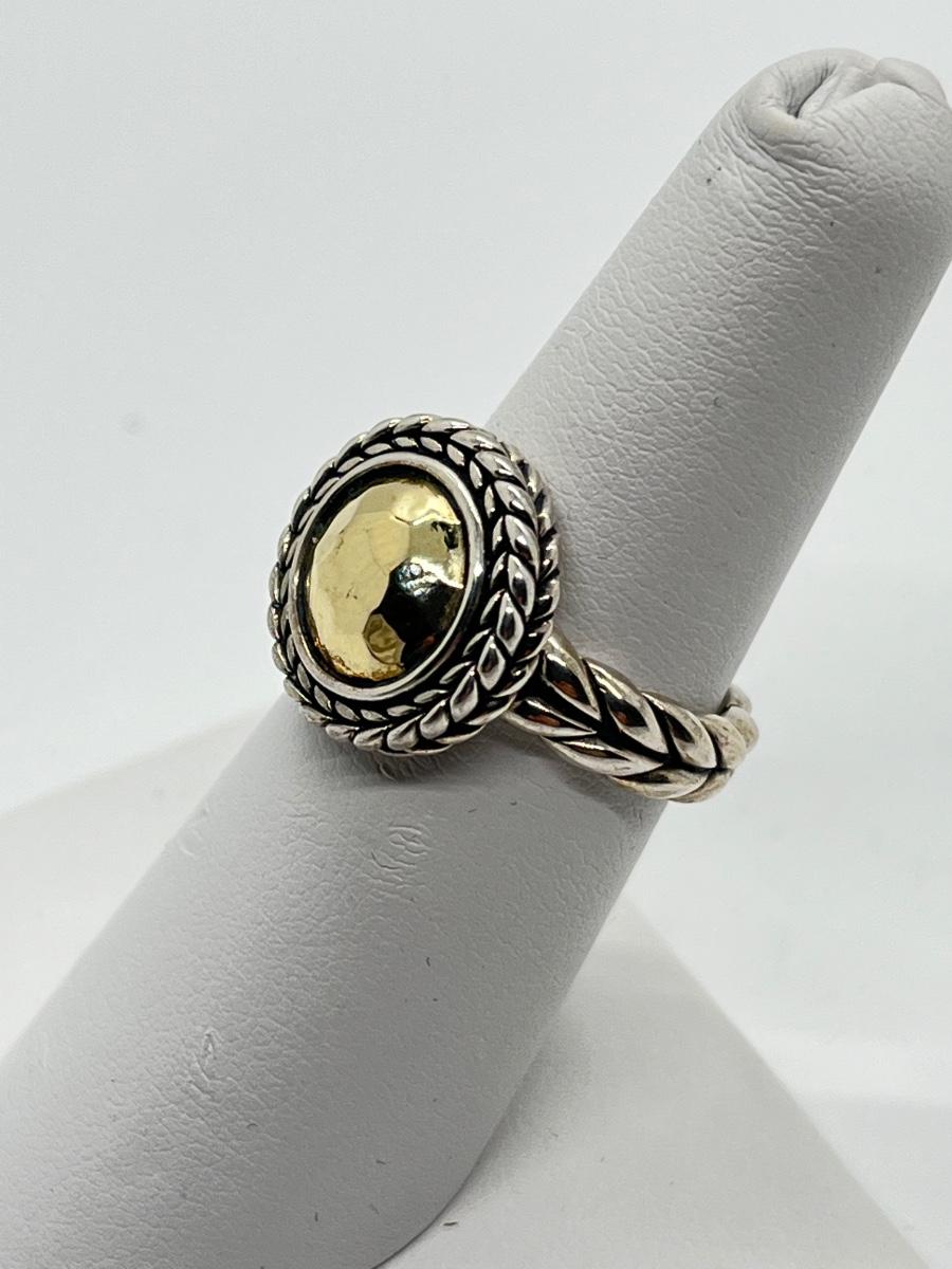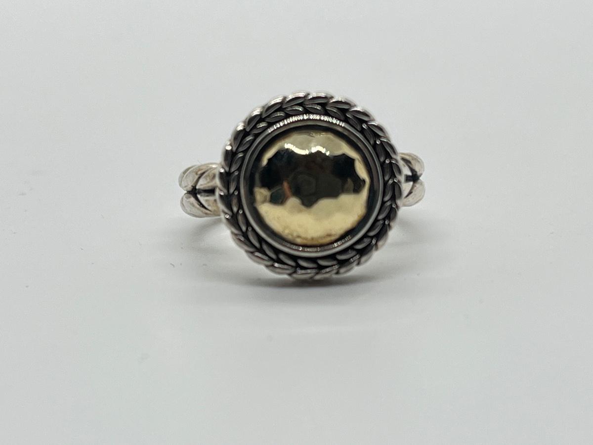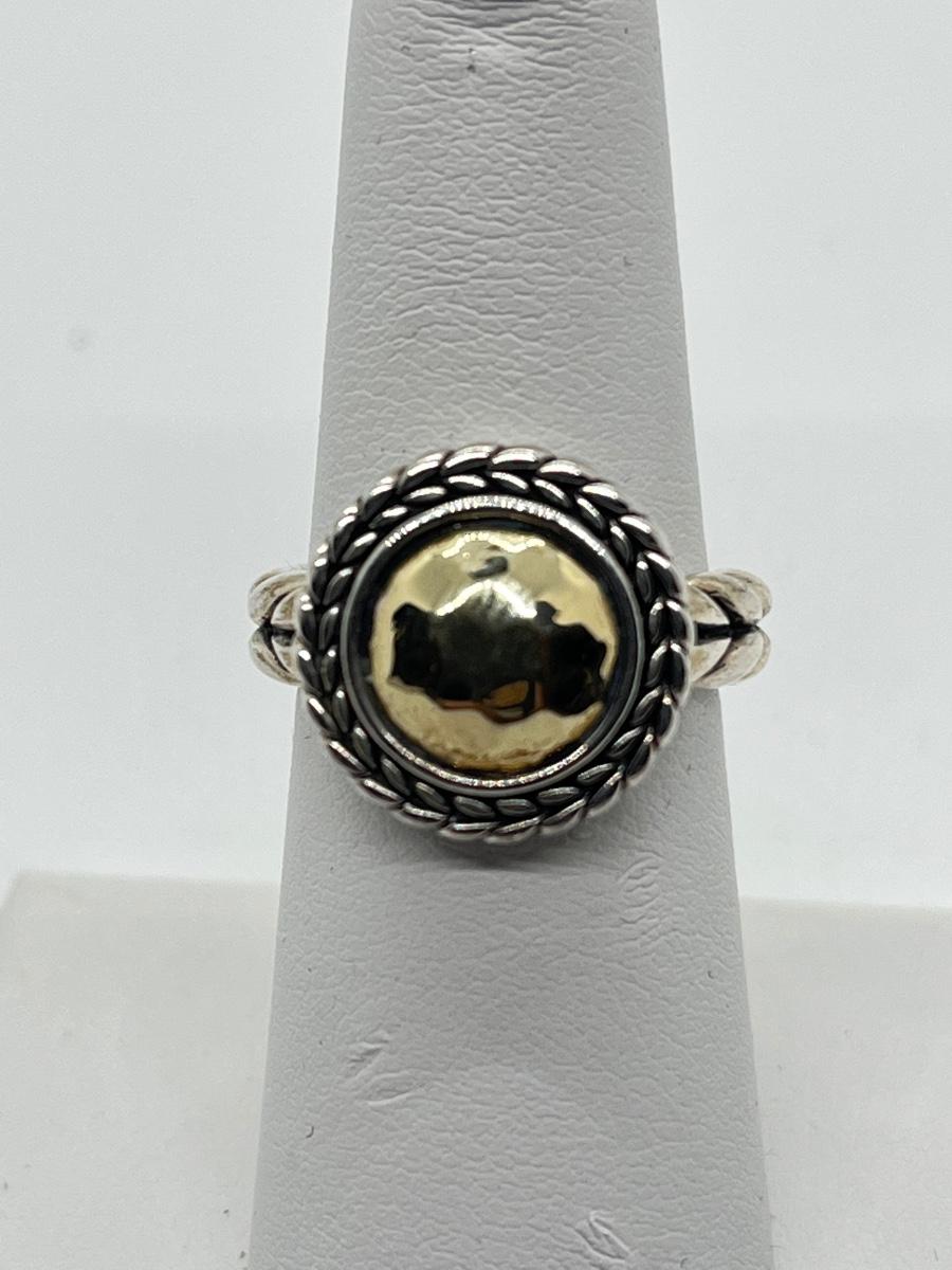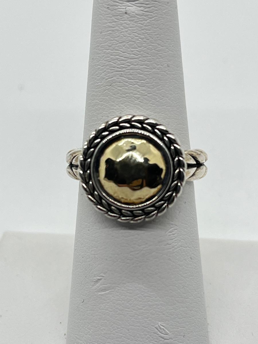 LOTJ76: JAI Sterling Sliver & 14K Gold Hammered Disk Disk Ring, 14k Gold Plate, Sz6