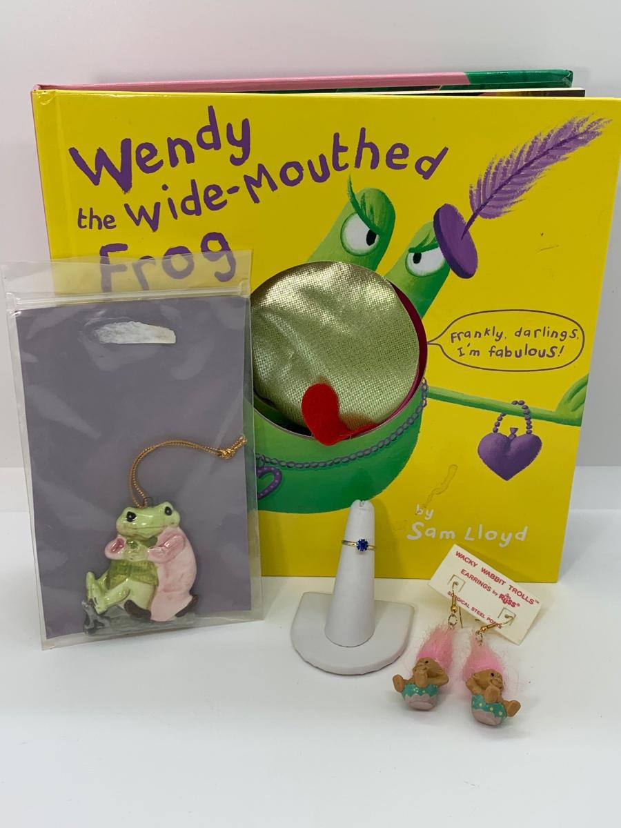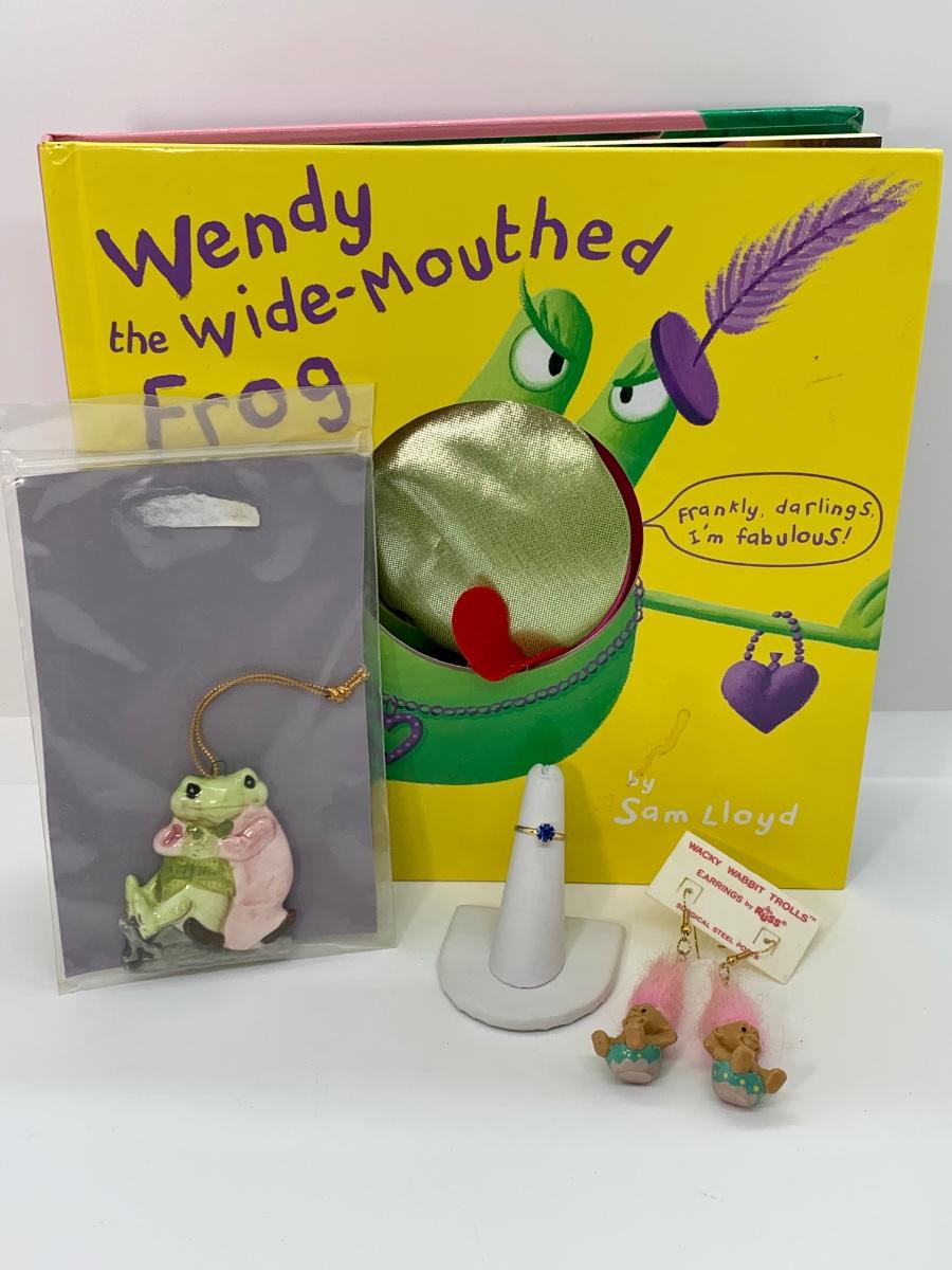 Lot 19: Troll Pierced Earrings, Childrens Puppet Book, Schmid Beatrix Potter Jeremy Fisher Frog Ornament & More