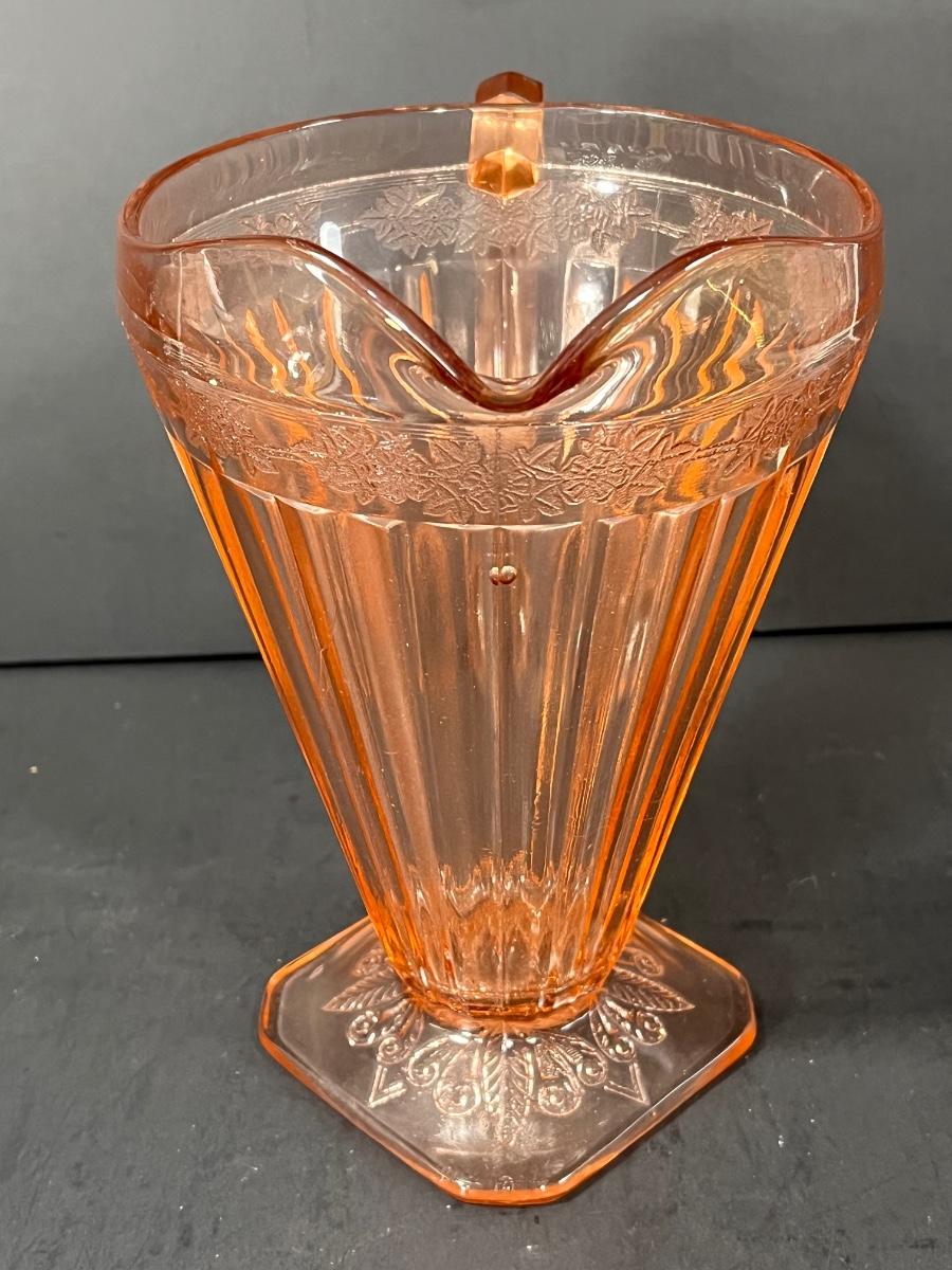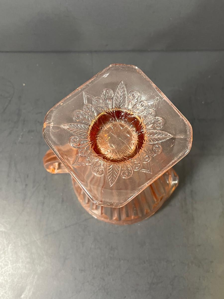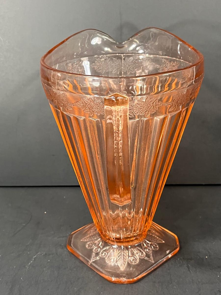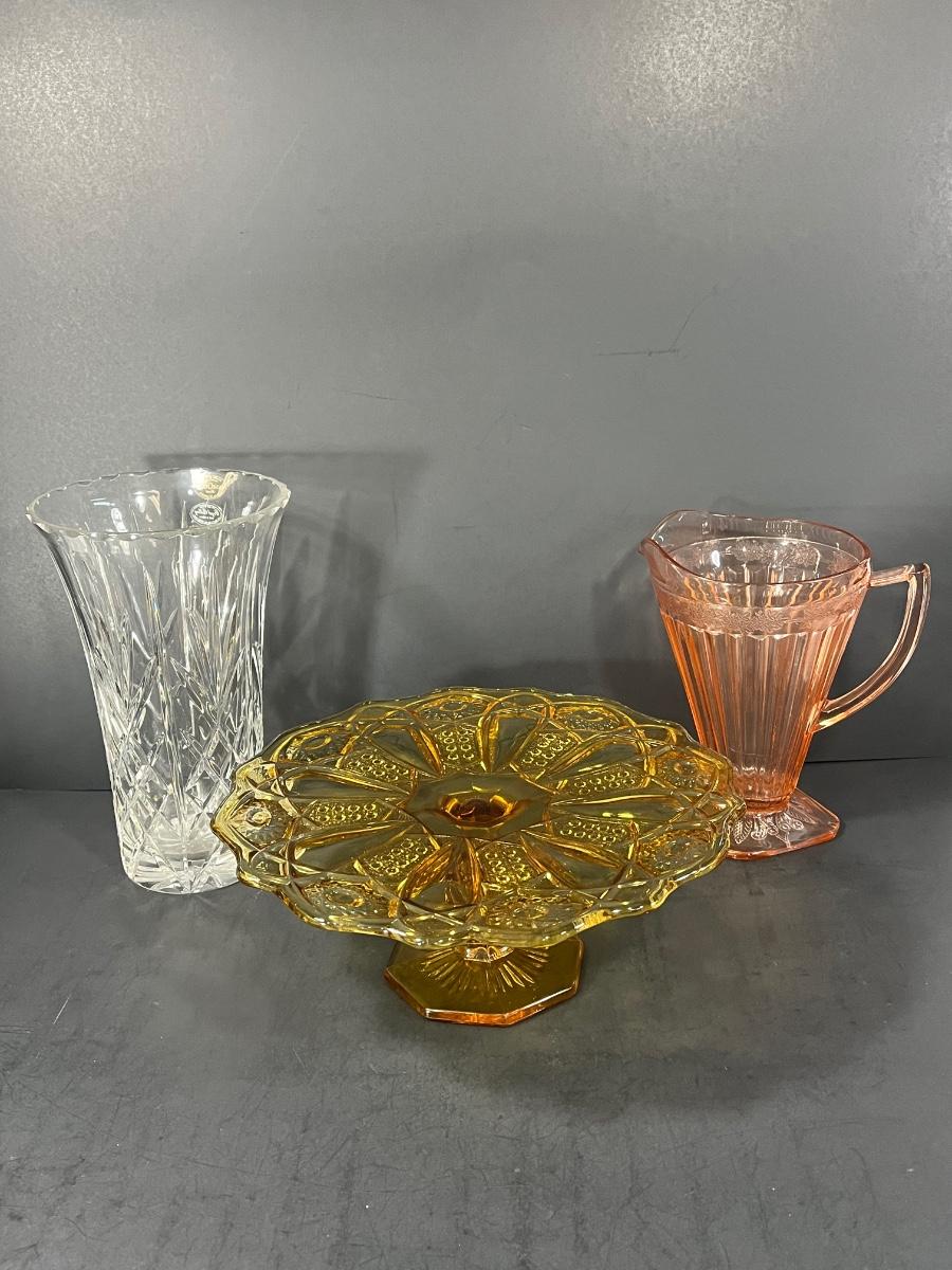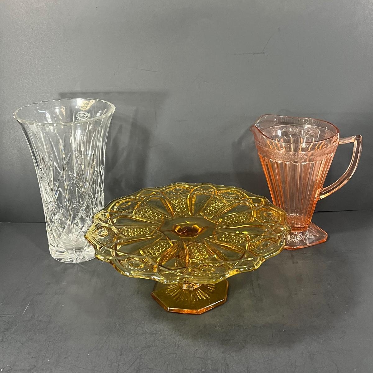 LOT 65: Samobor Crystal Vase + Pink Depression Glass Pitcher & Amber Cake Stand