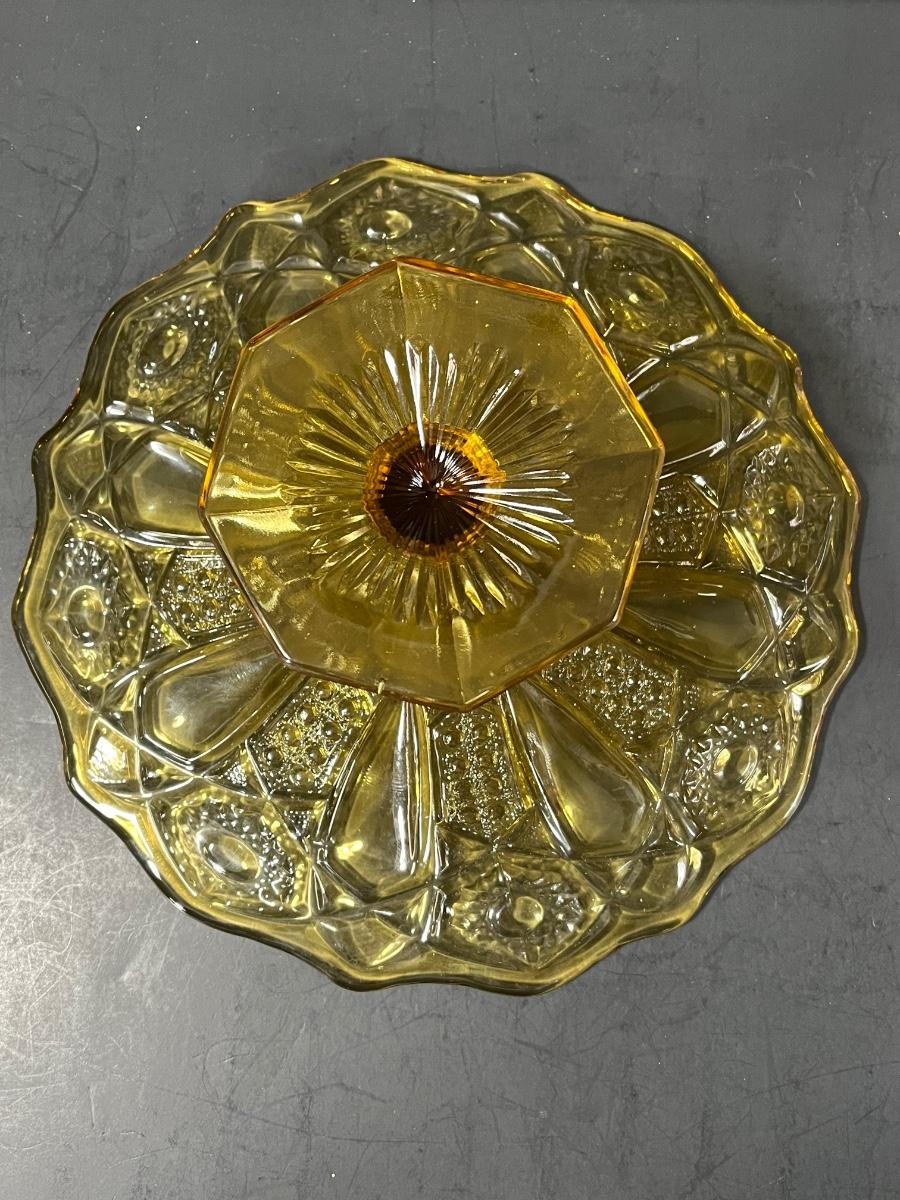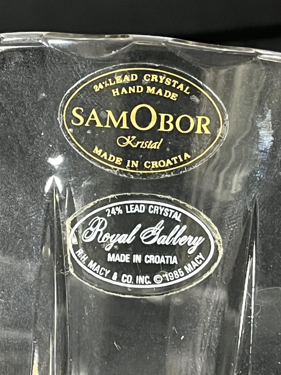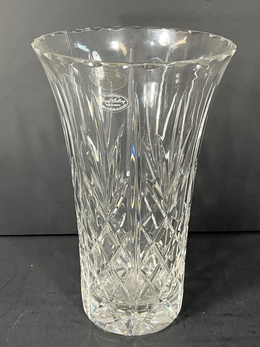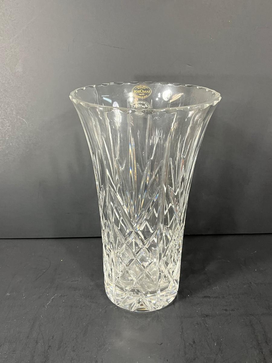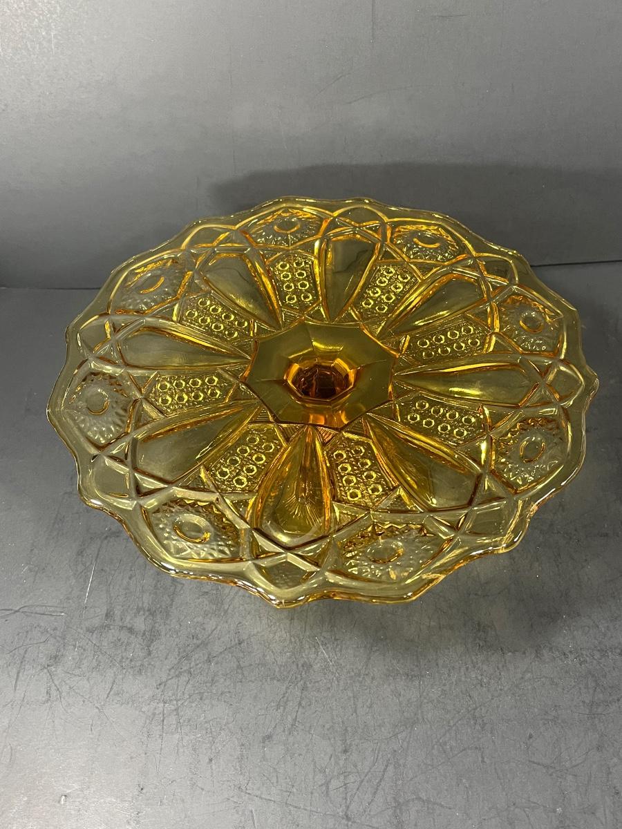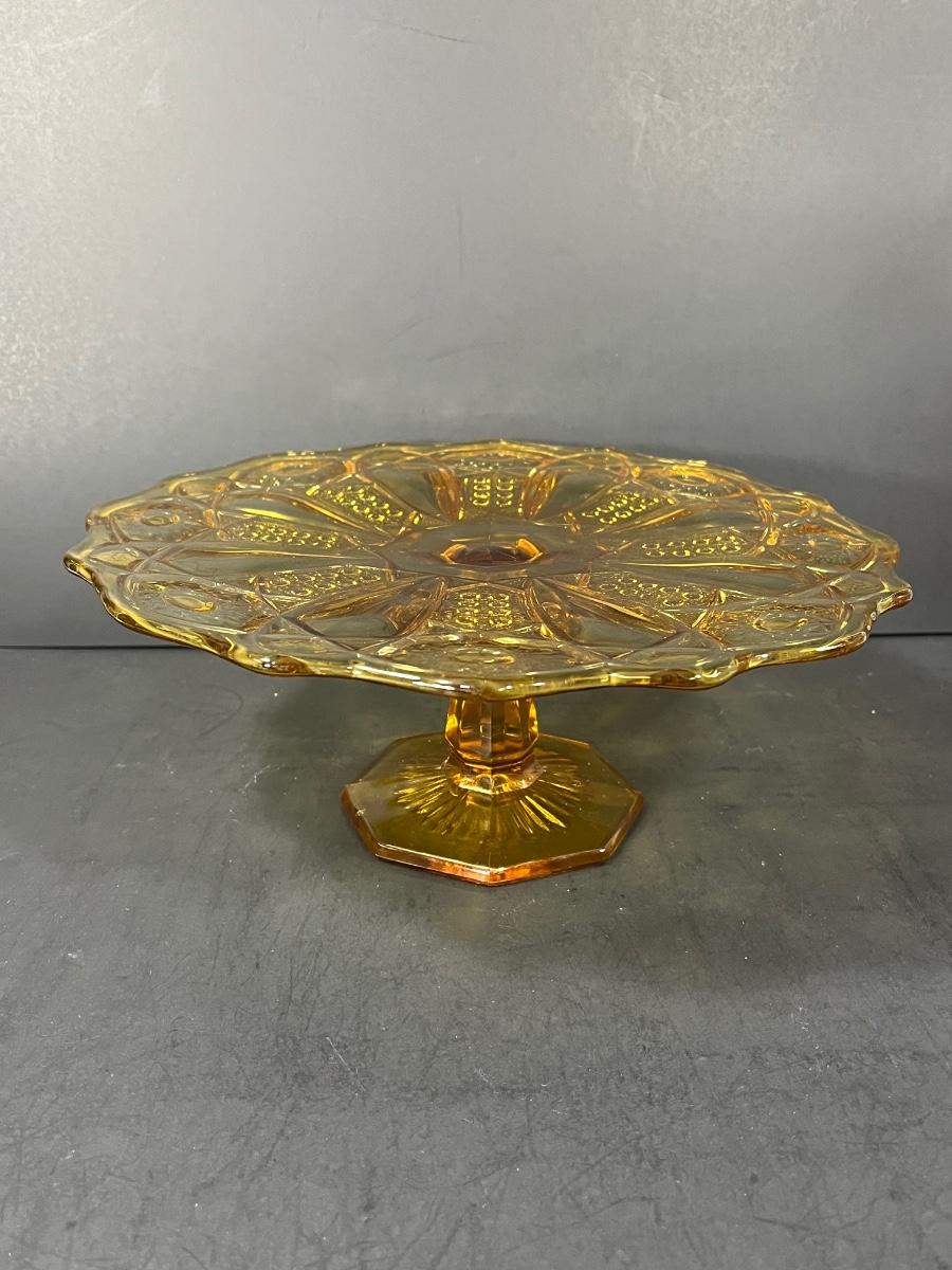 LOT 65: Samobor Crystal Vase + Pink Depression Glass Pitcher & Amber Cake Stand