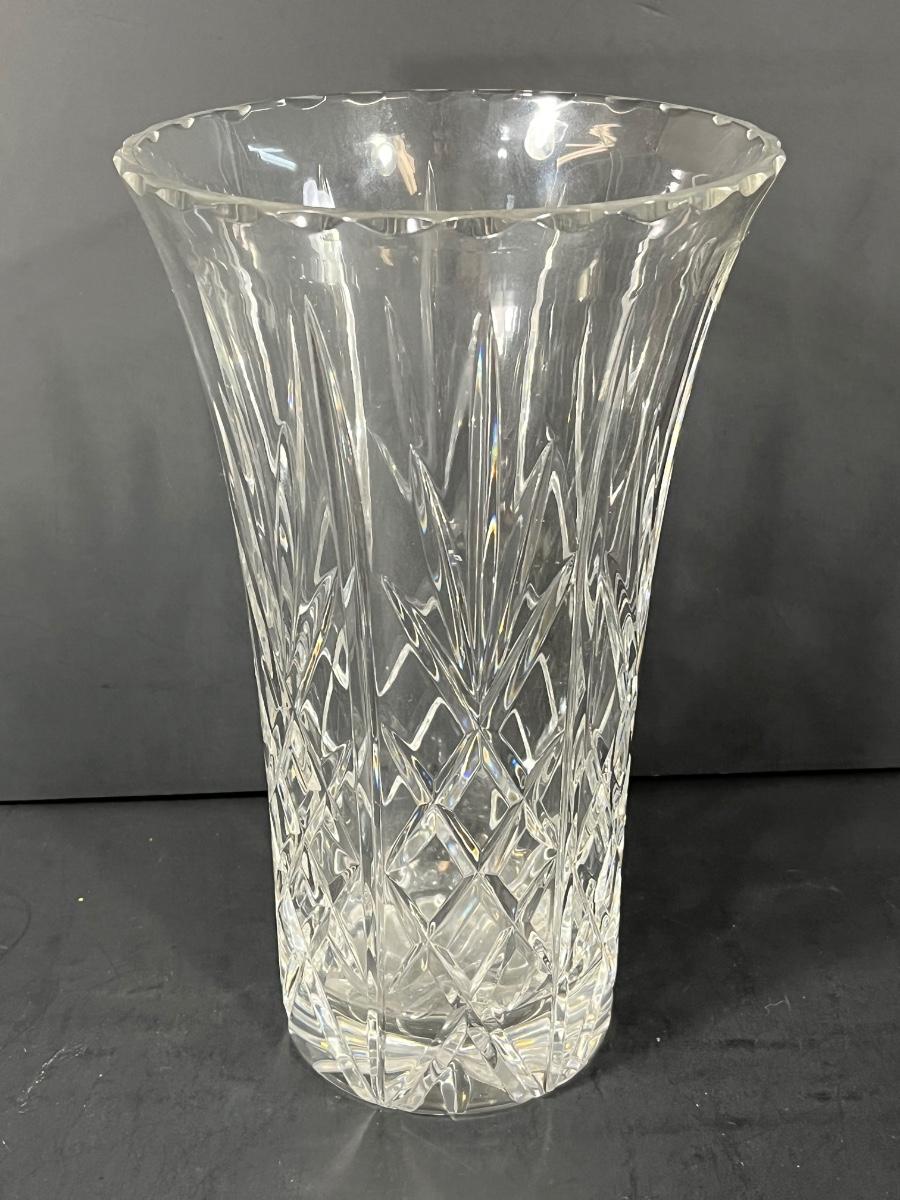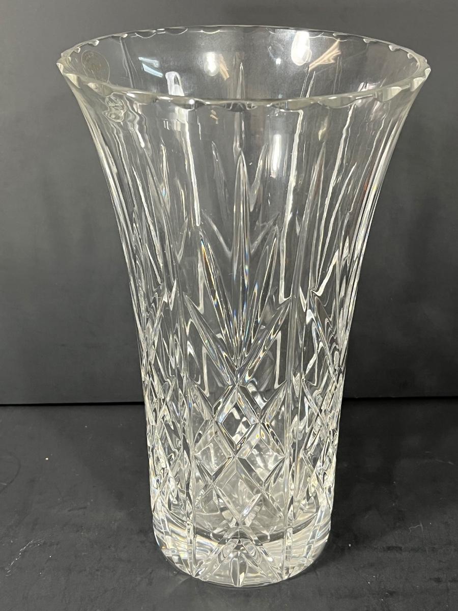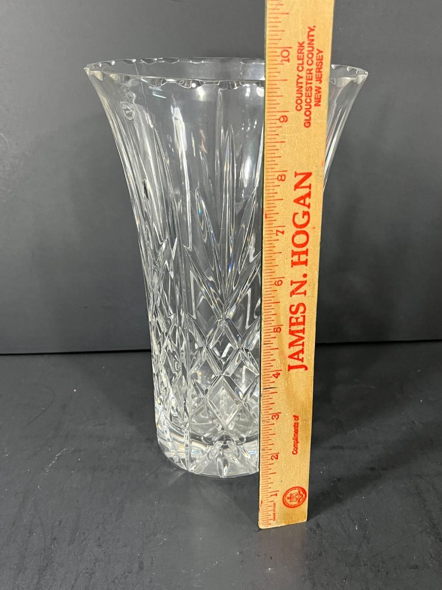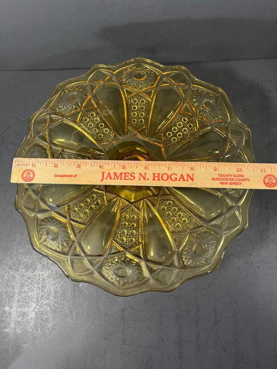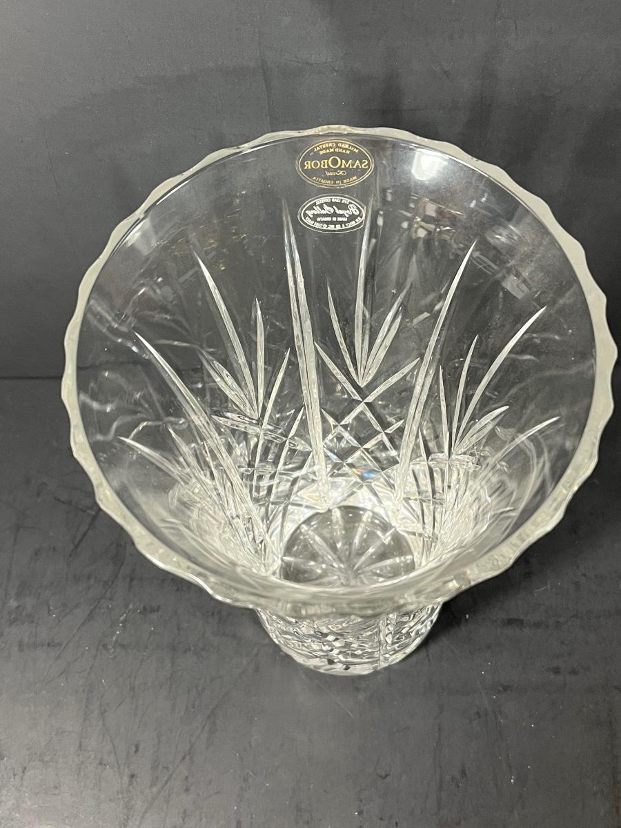 LOT 65: Samobor Crystal Vase + Pink Depression Glass Pitcher & Amber Cake Stand