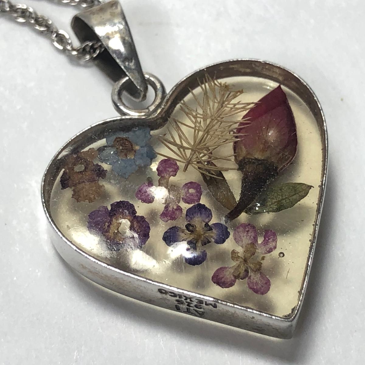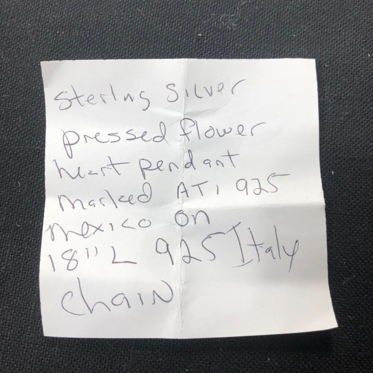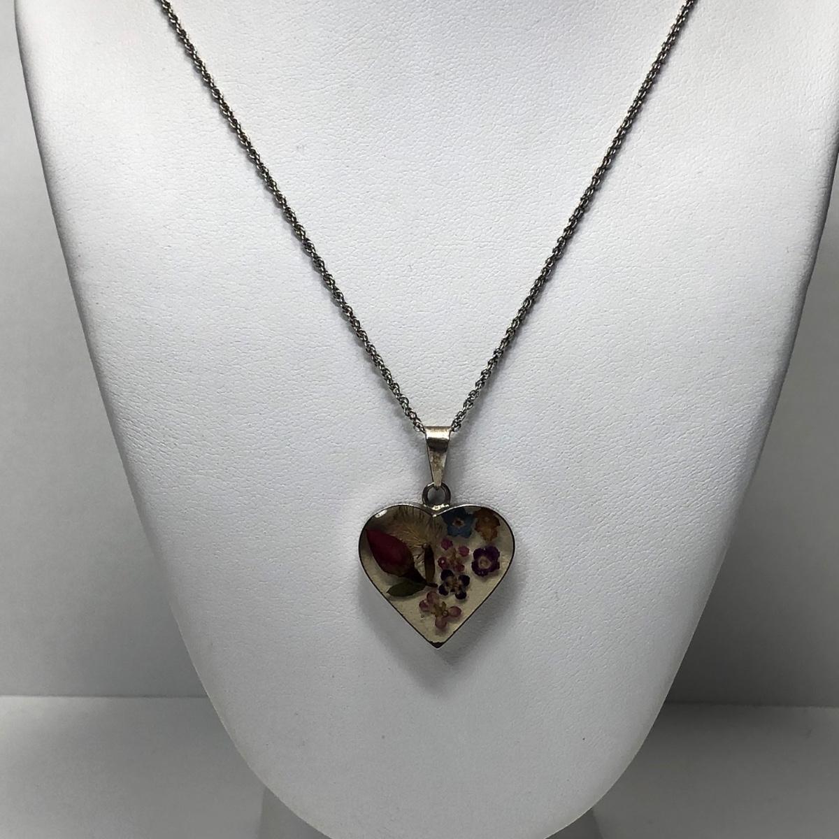 LOT 51: Sterling Silver Pressed Flower Heart Pendant on 18" Chain