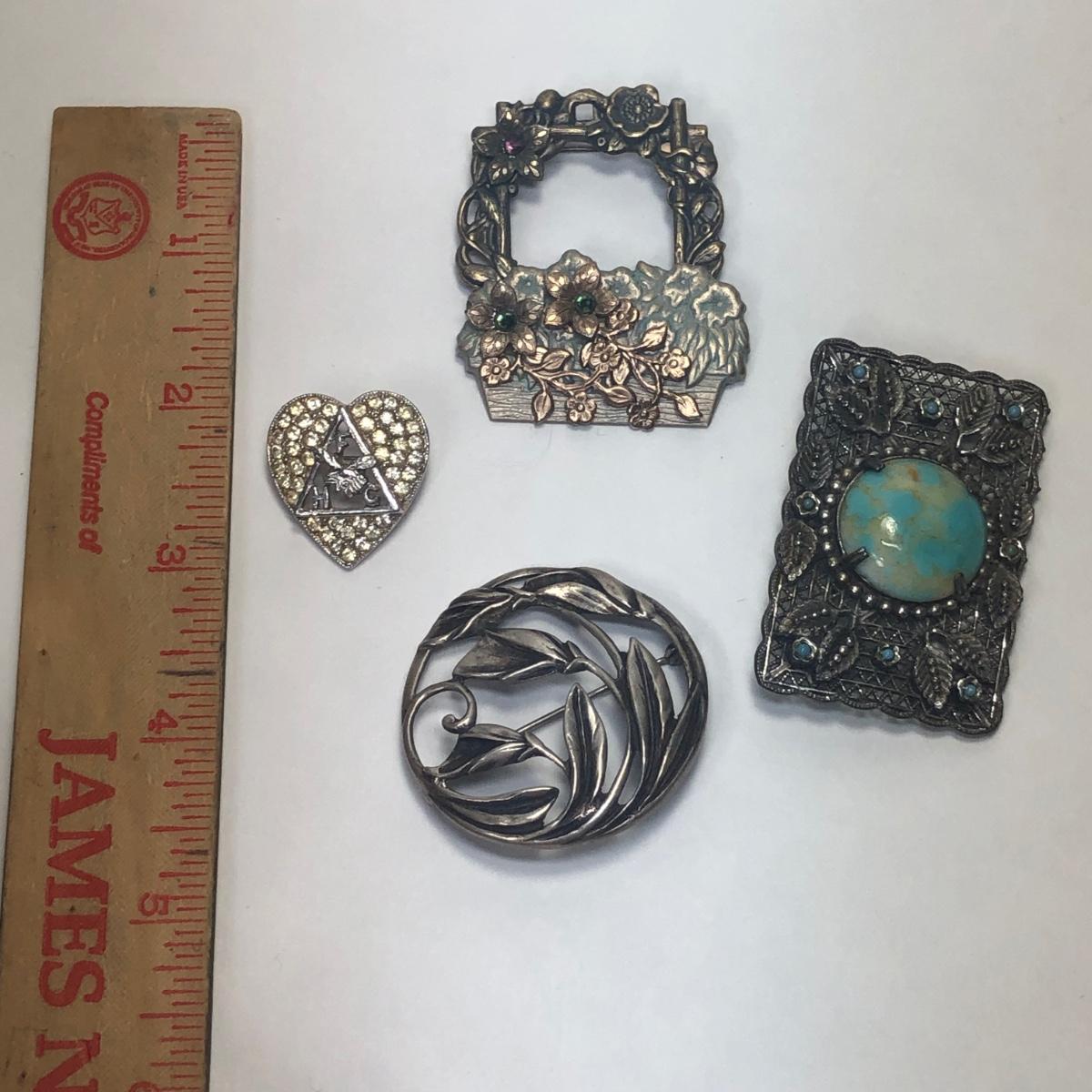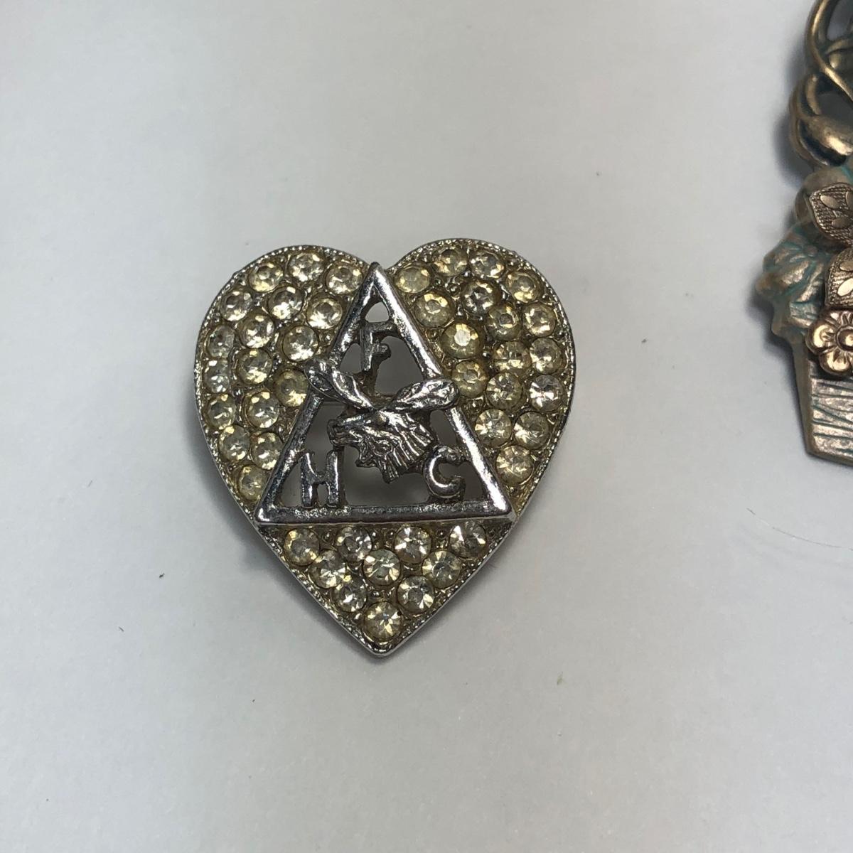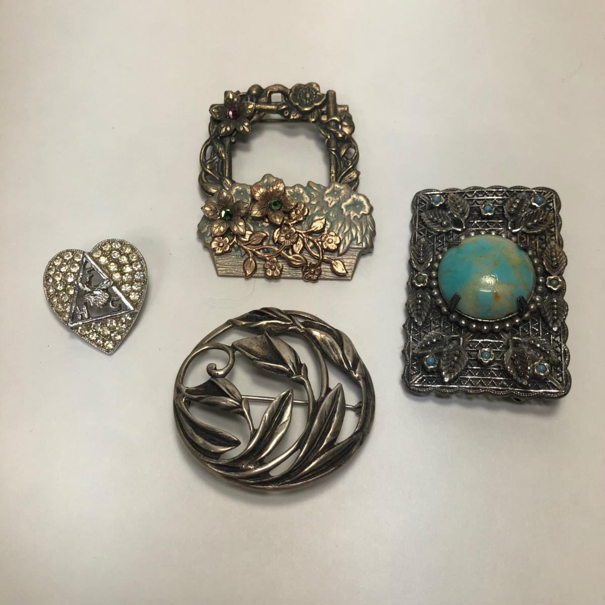 LOT 56: Vintage Filagree Brooch w/ Natural Stone, Two-Tone Floral Trellis Brooch, Swirling Flower Pin & Elk Lodge Rhinestone Sweetheart Pin