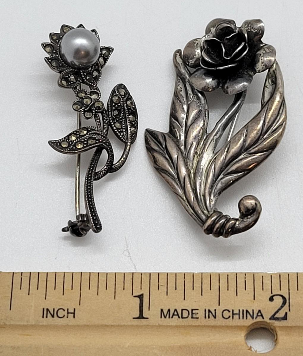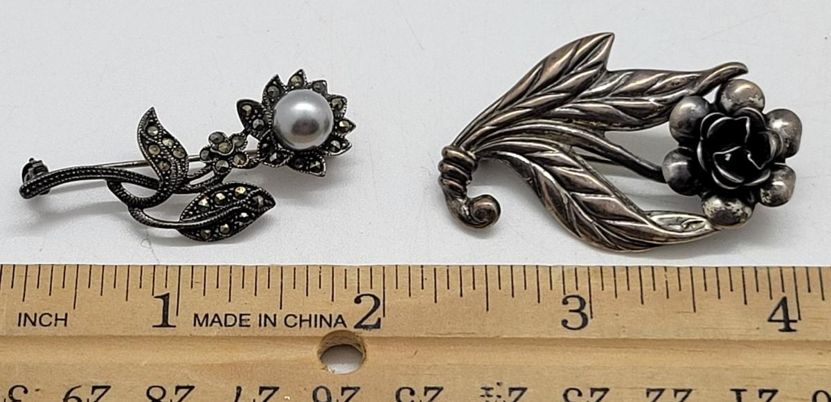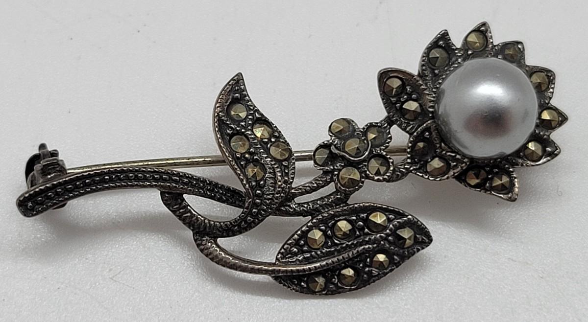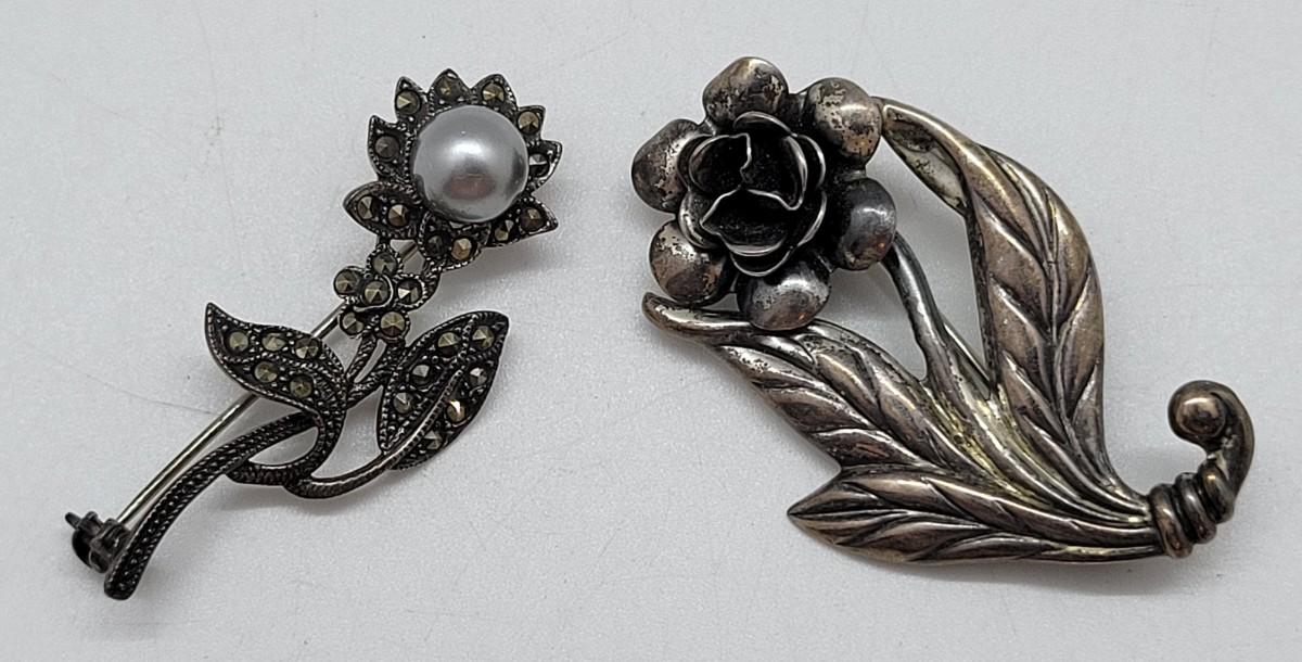 LOT 65: 925 Marcastic Pearl Flower Brooch & Sterling Danecraft Flower Brooch