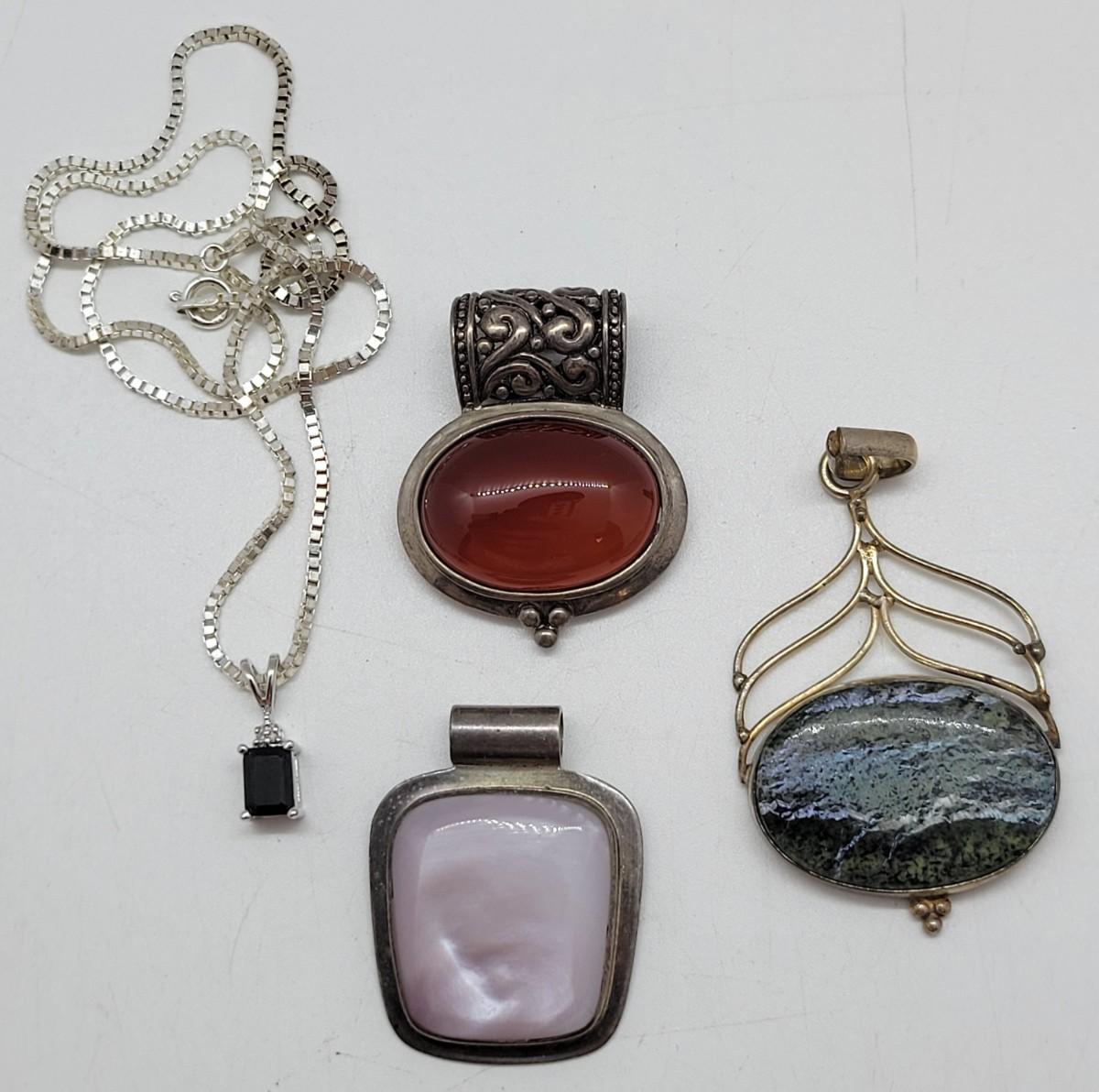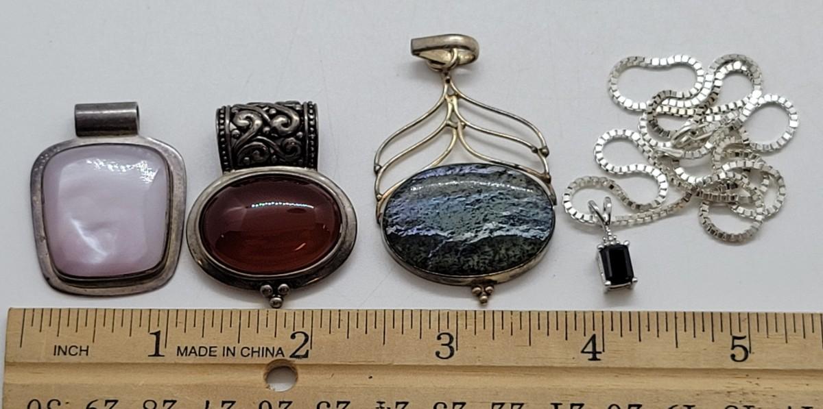 LOT 73: 20"L Sterling Silver Box Chain with Several Pendants