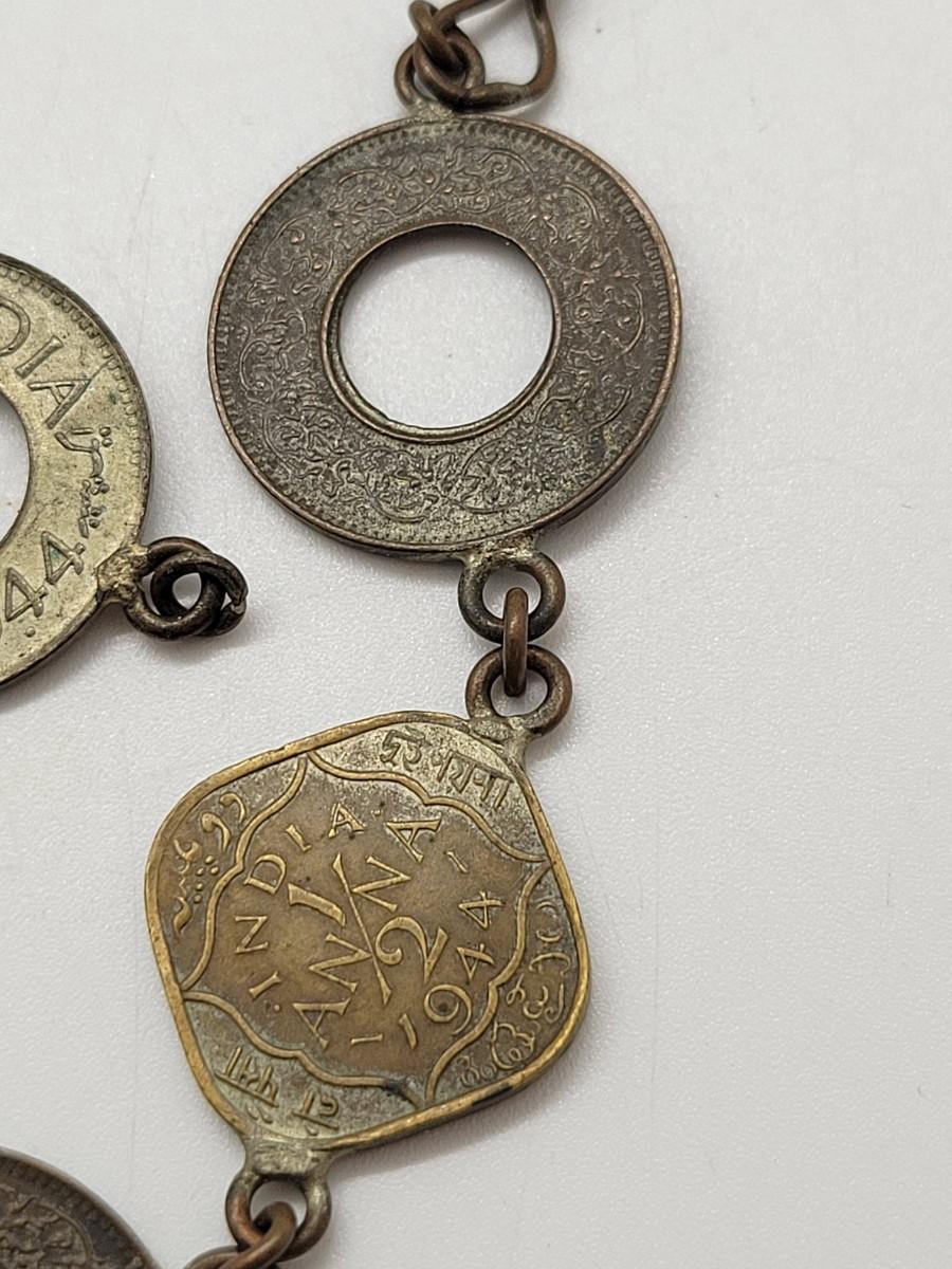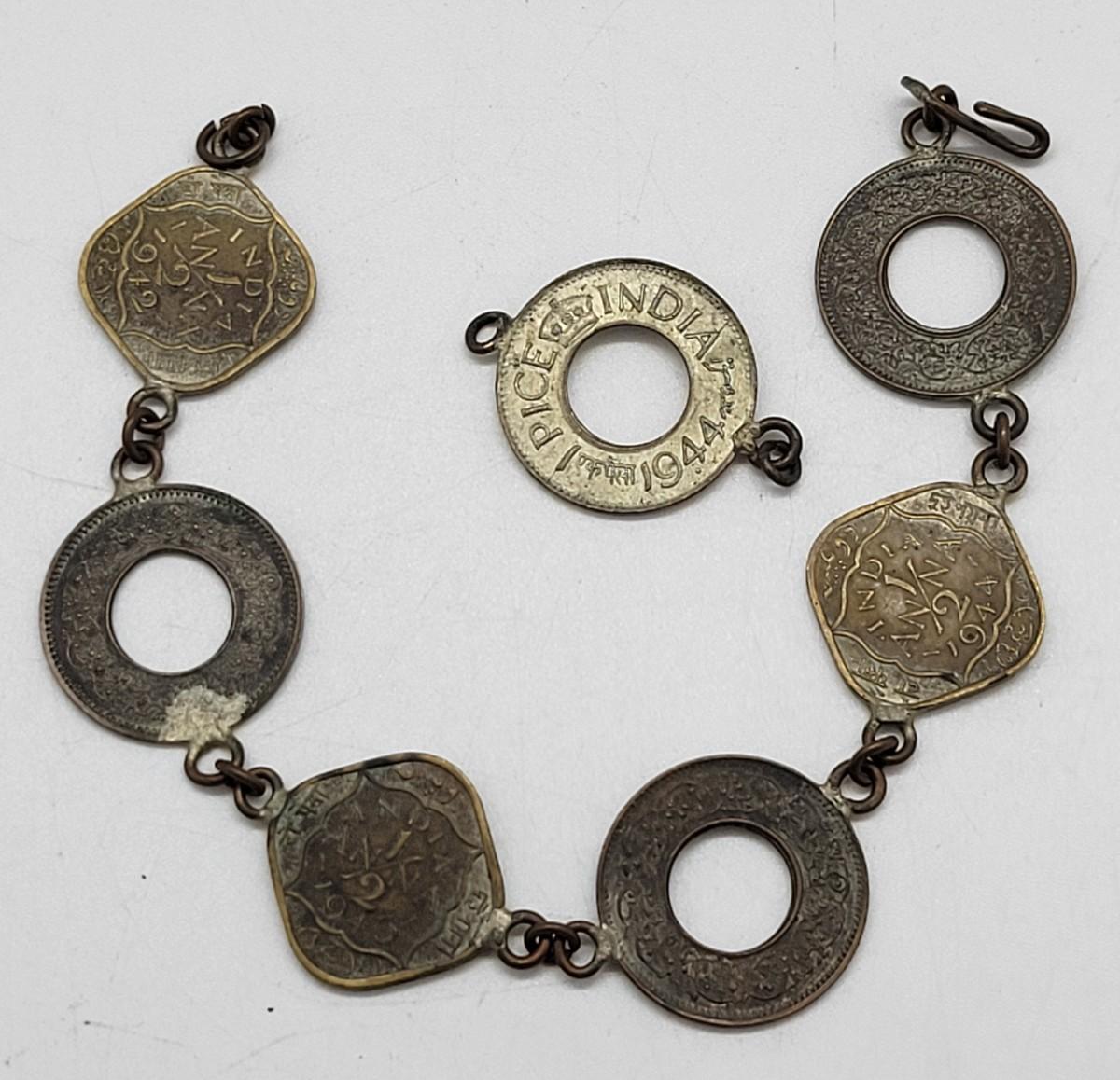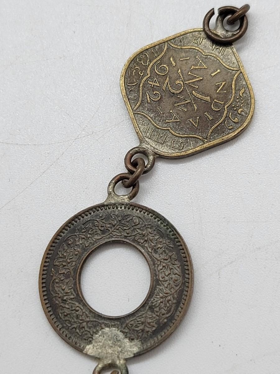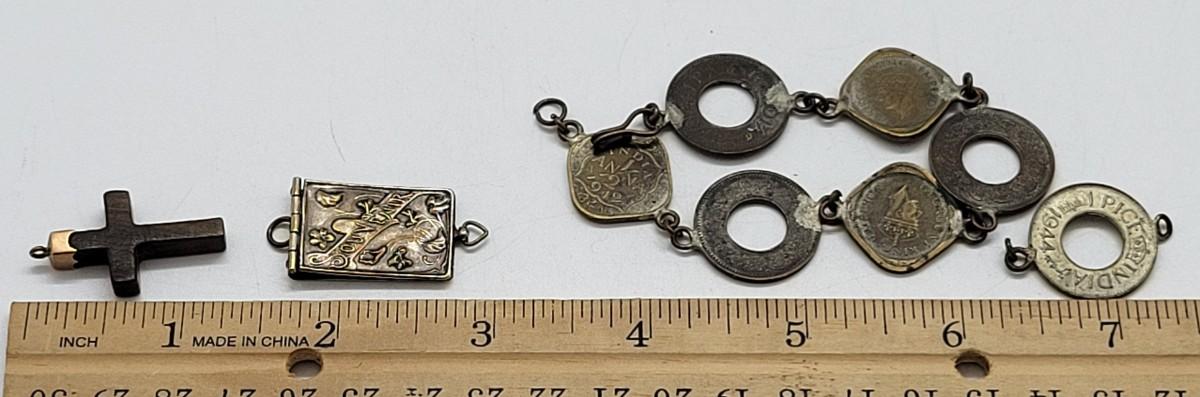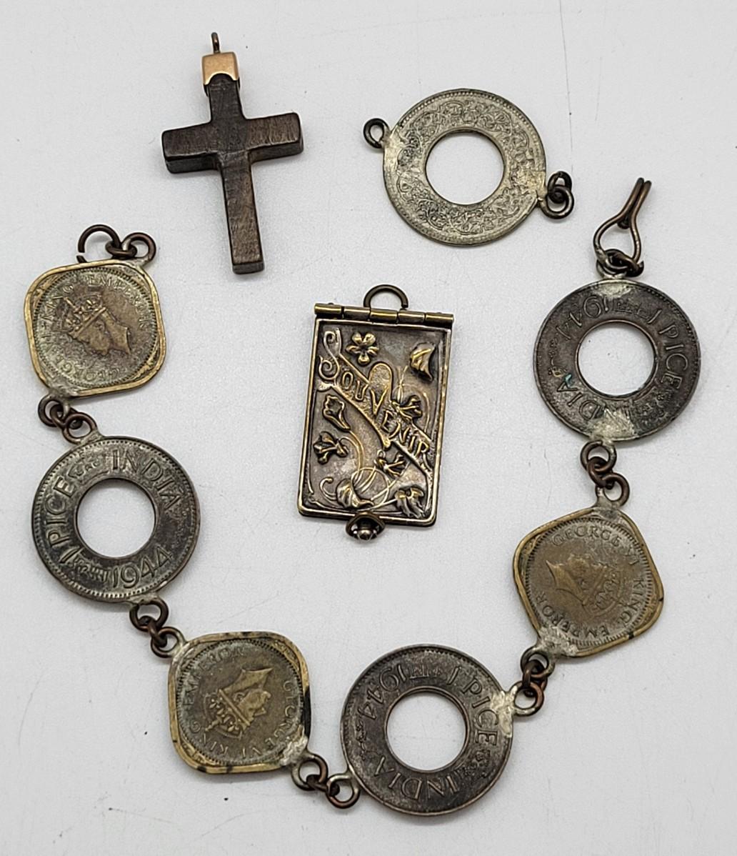 LOT 79: 1944 King George Coin Bracelet with Extra Link, Souvenir Charm/ pendant / locket from Cherbourg, and Small Wood Cross Pendant