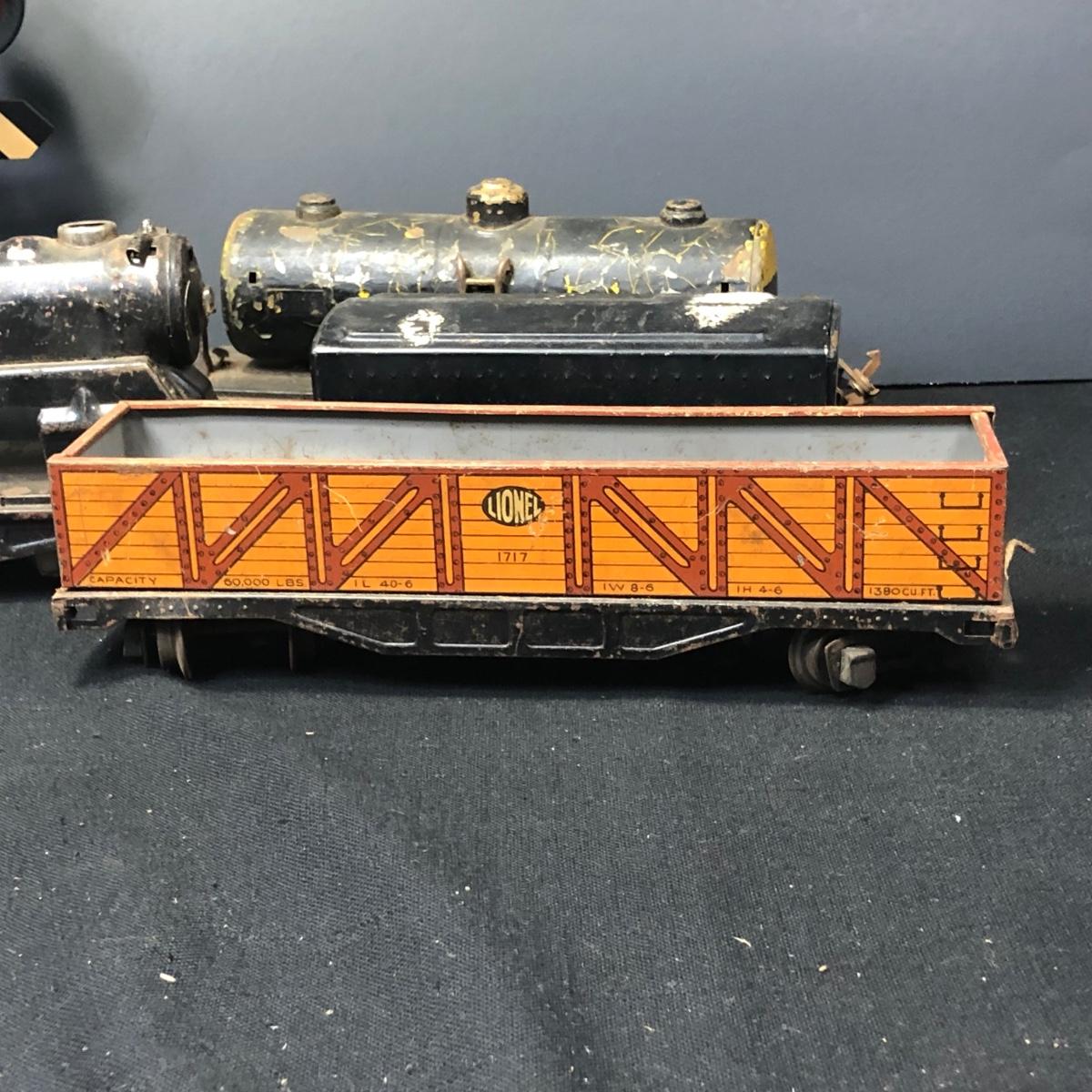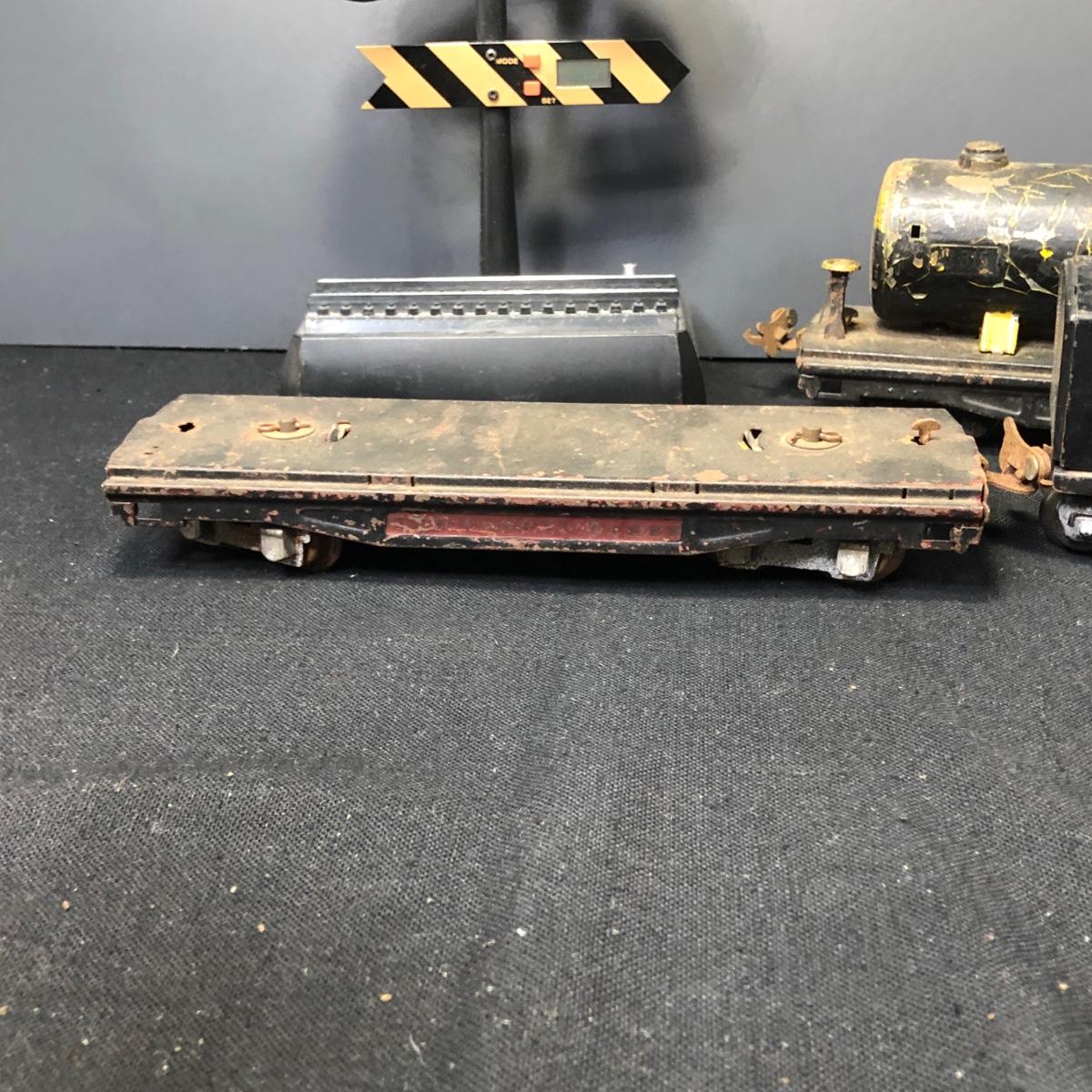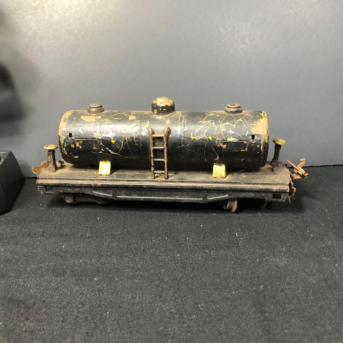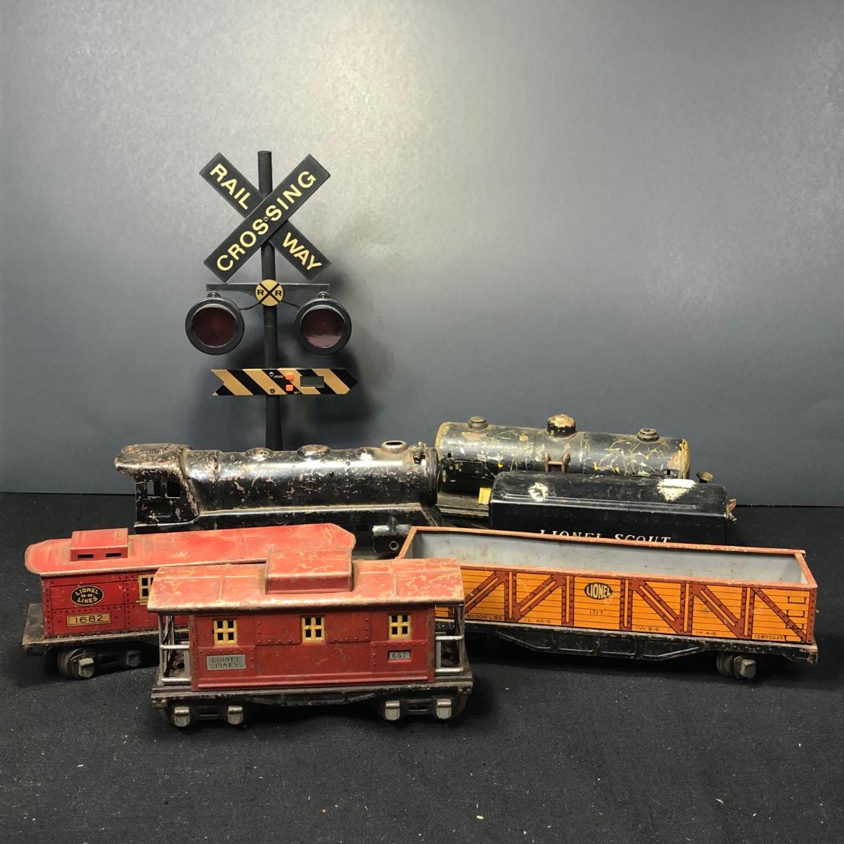 LOT 136: Lionel Train Cars, MAR Toys Engine Shell, Railway Crossing Sign & Texaco Car