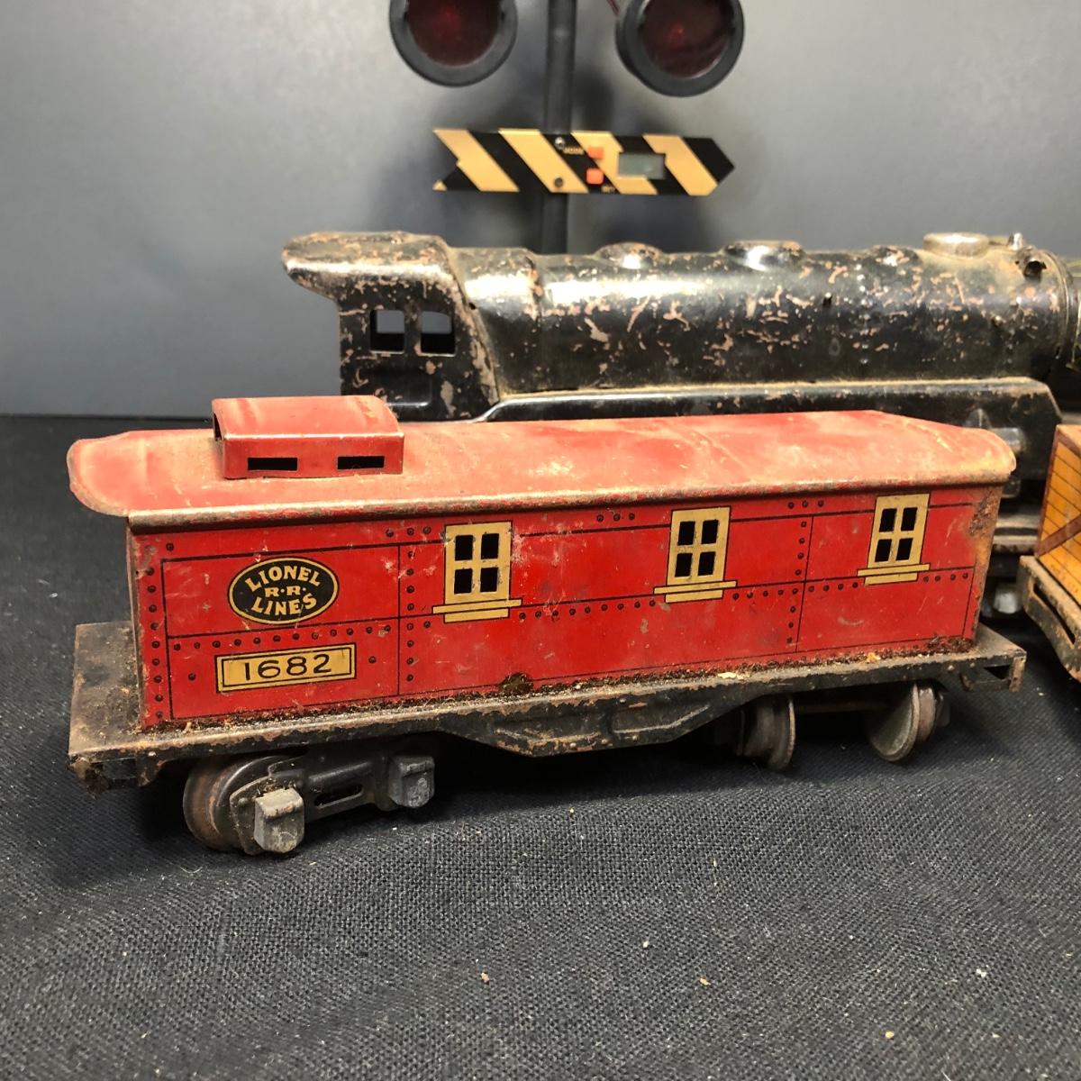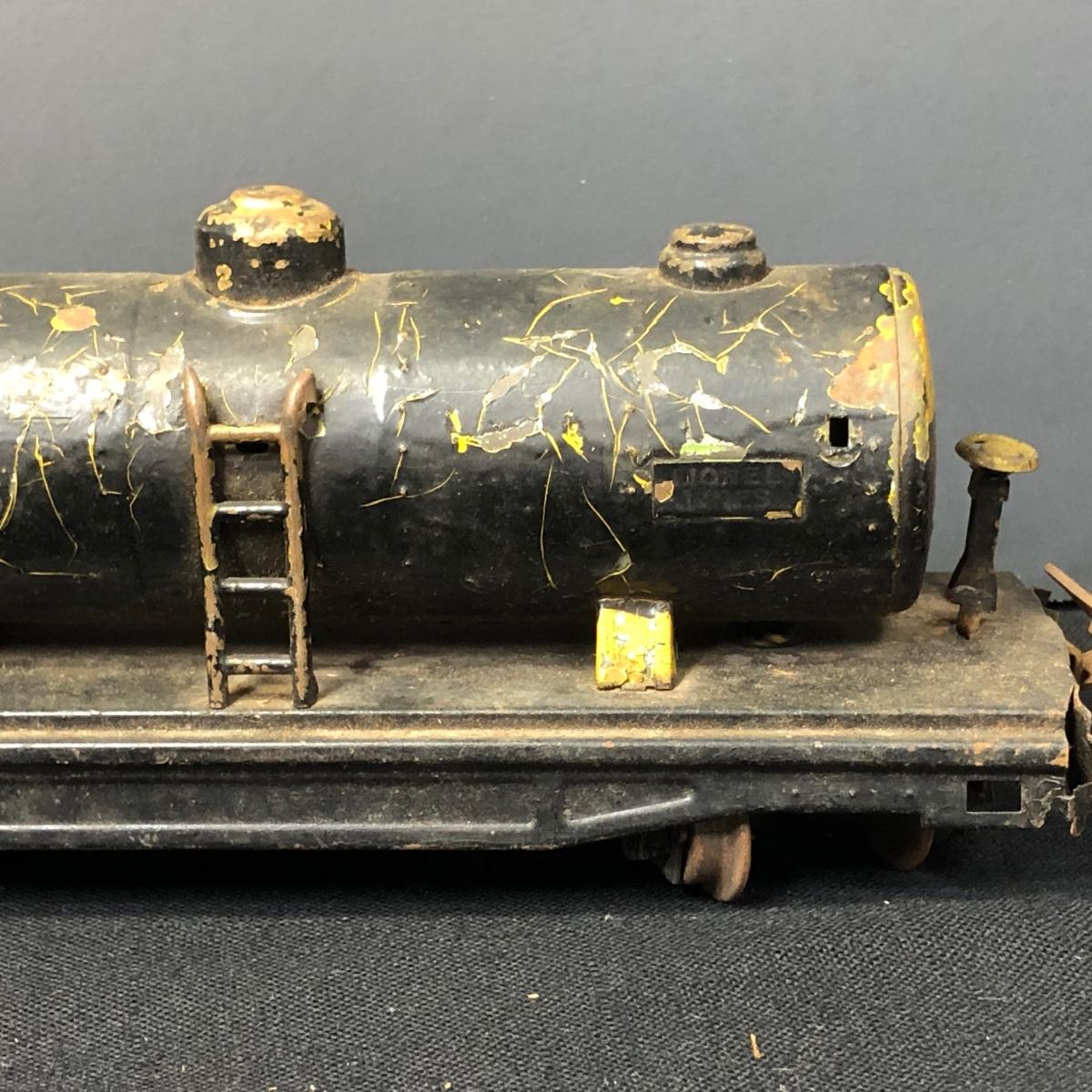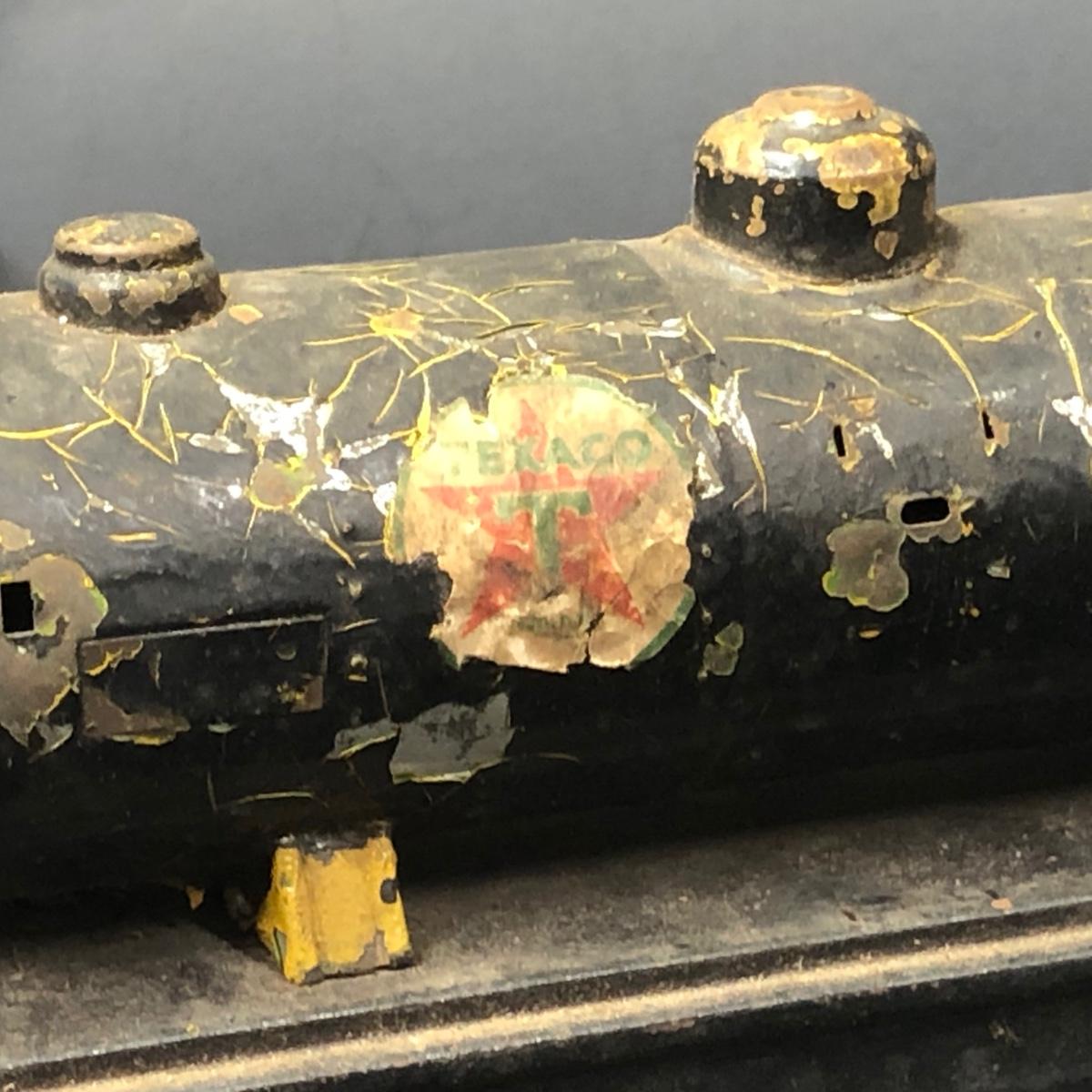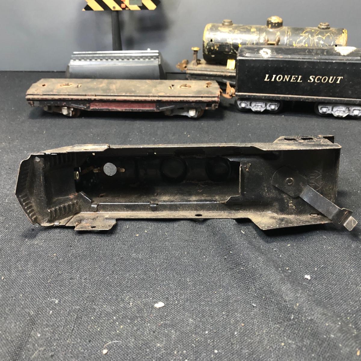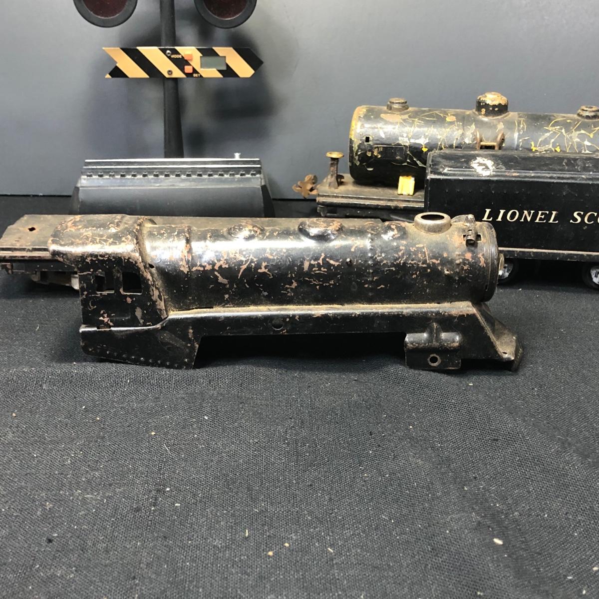 LOT 136: Lionel Train Cars, MAR Toys Engine Shell, Railway Crossing Sign & Texaco Car
