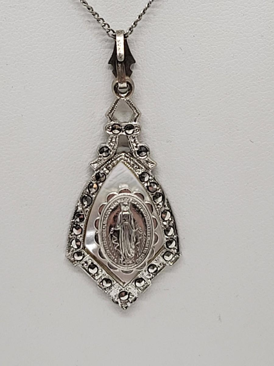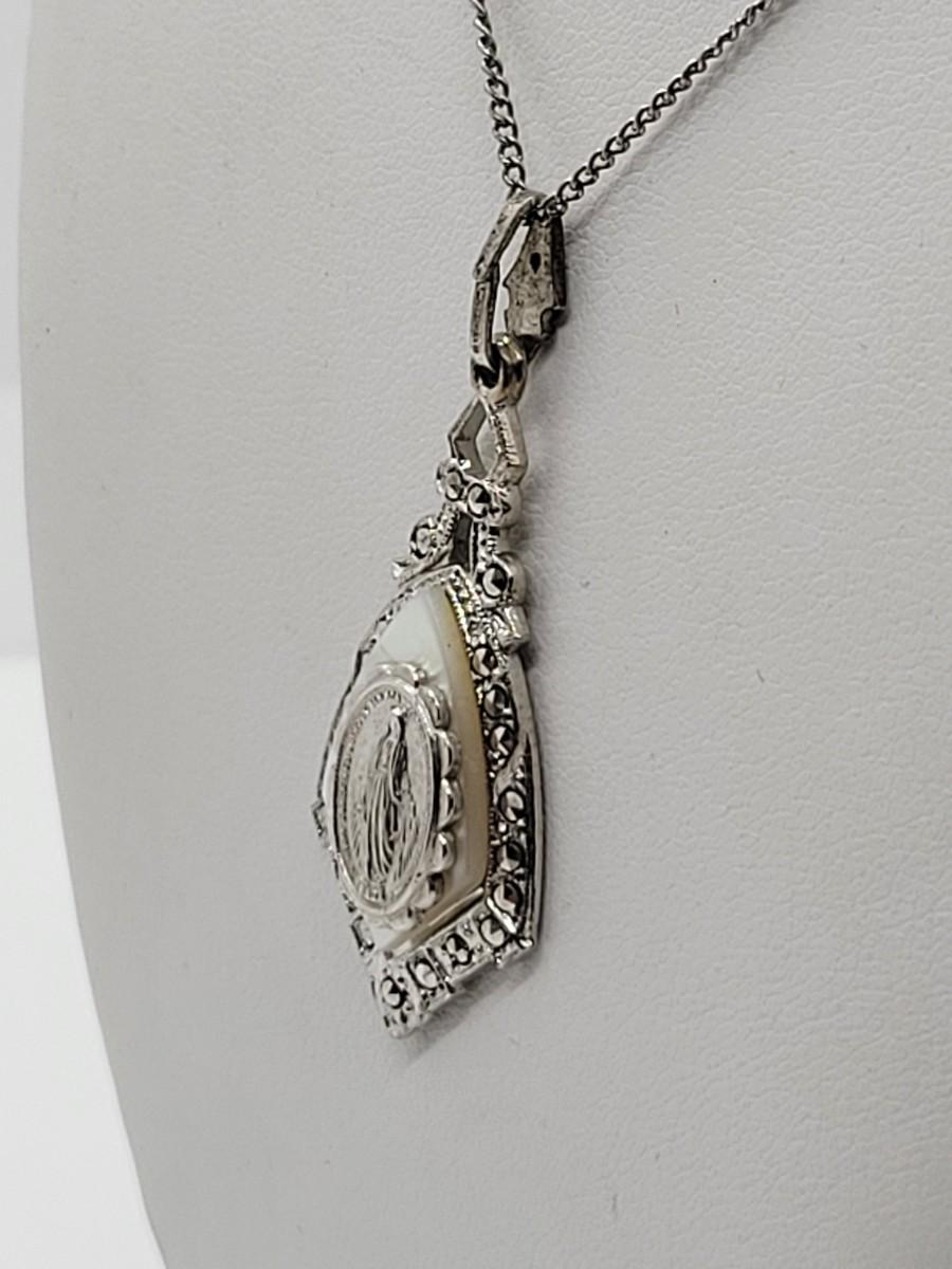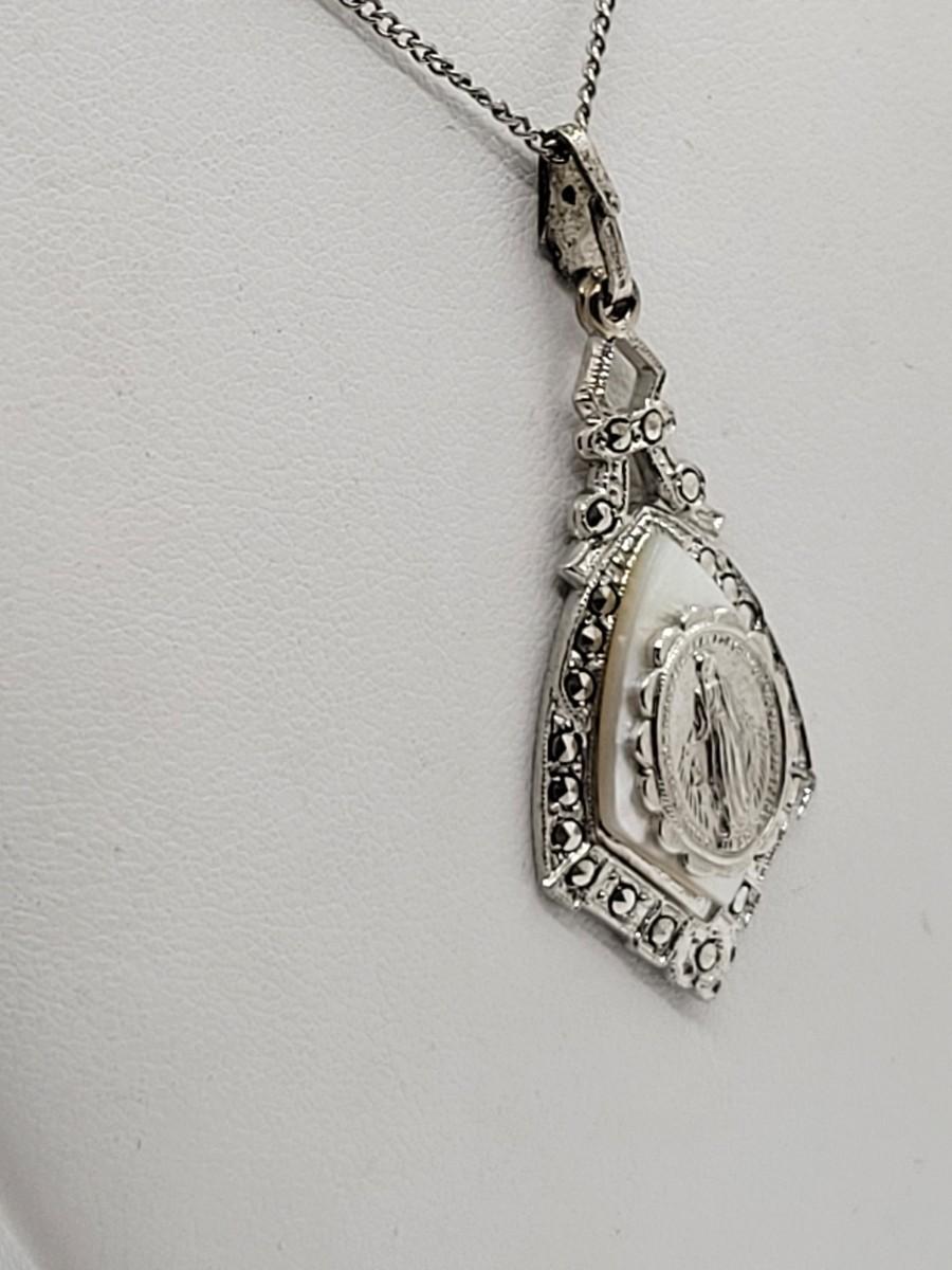 LOT33: Vintage Sterling Marcasite & mother of pearl Jesus Pendant on sterling 18" L Chain (8.3g)