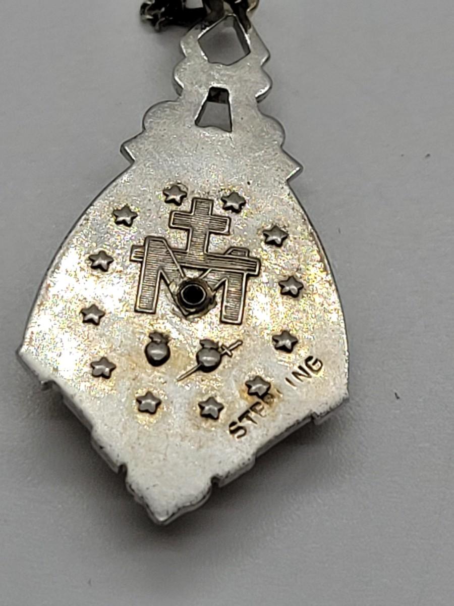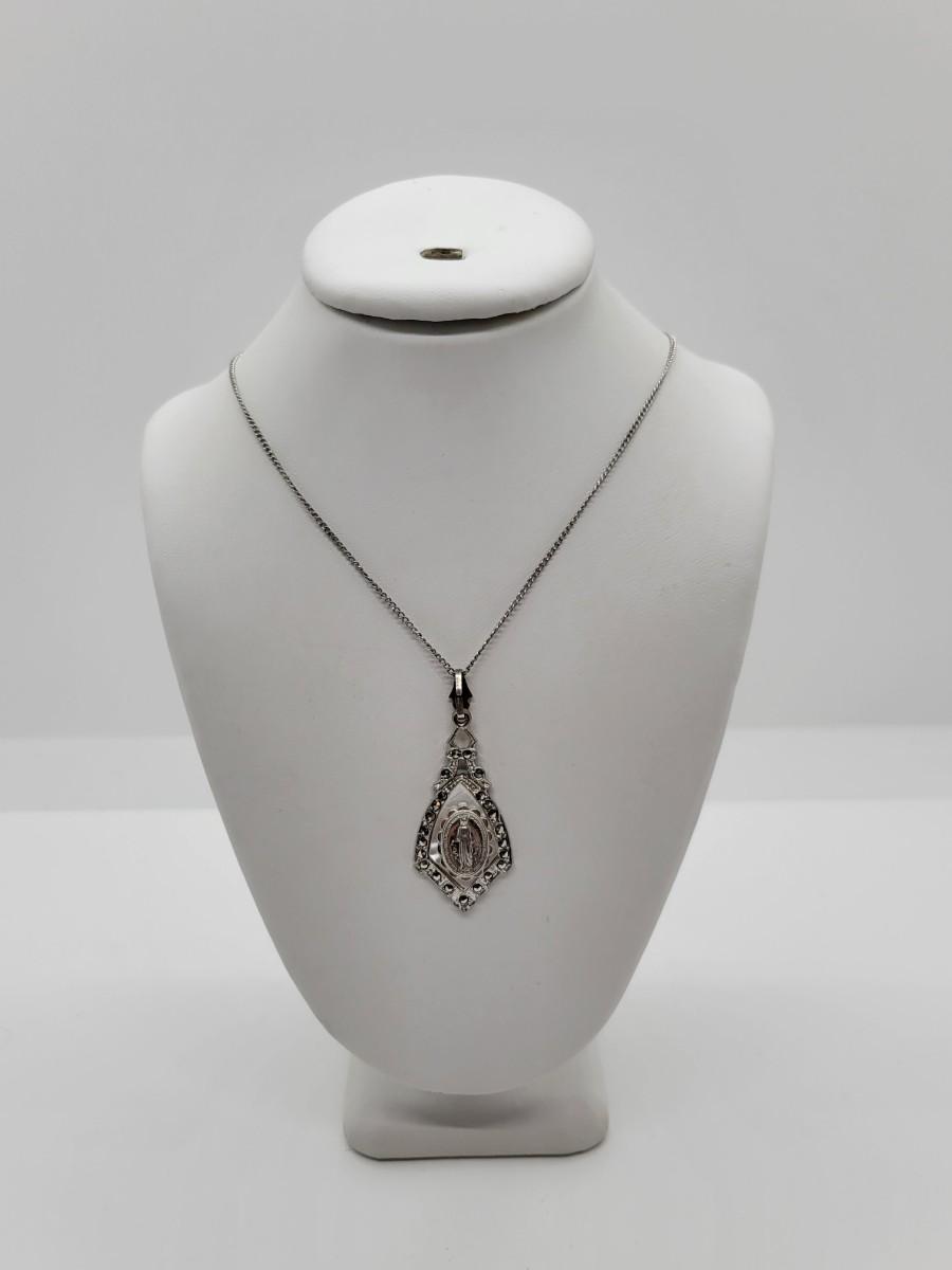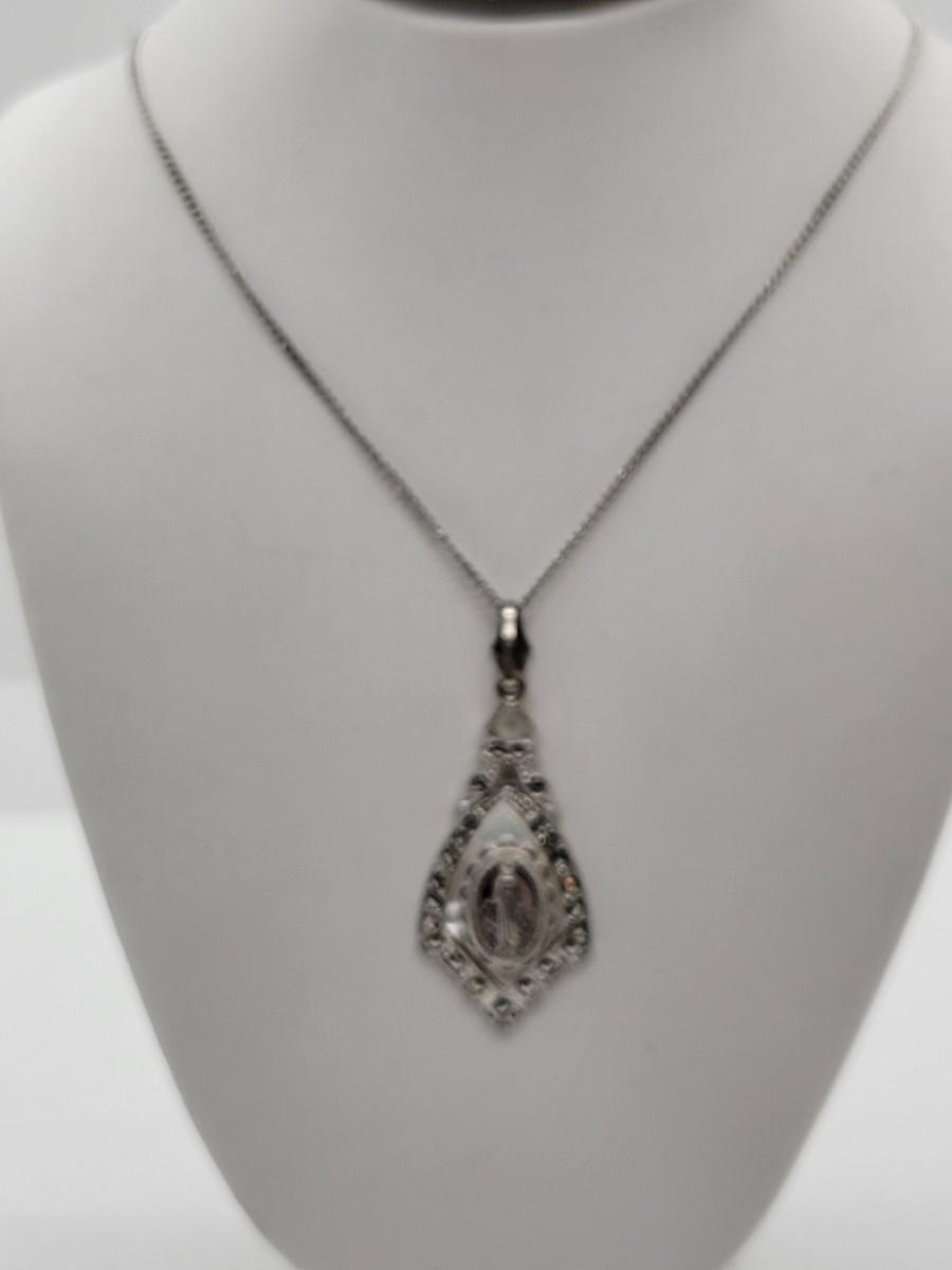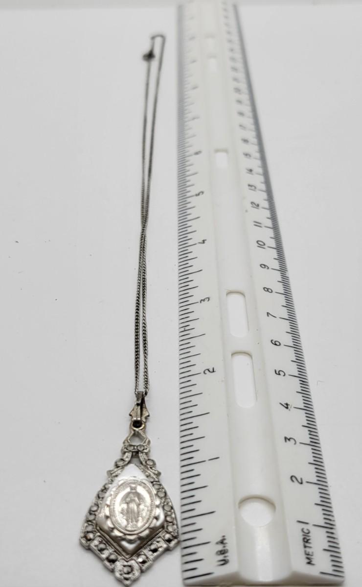 LOT33: Vintage Sterling Marcasite & mother of pearl Jesus Pendant on sterling 18" L Chain (8.3g)