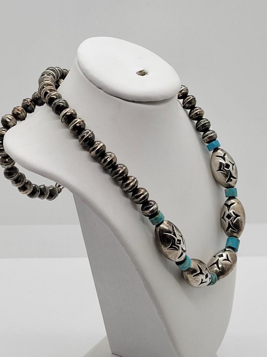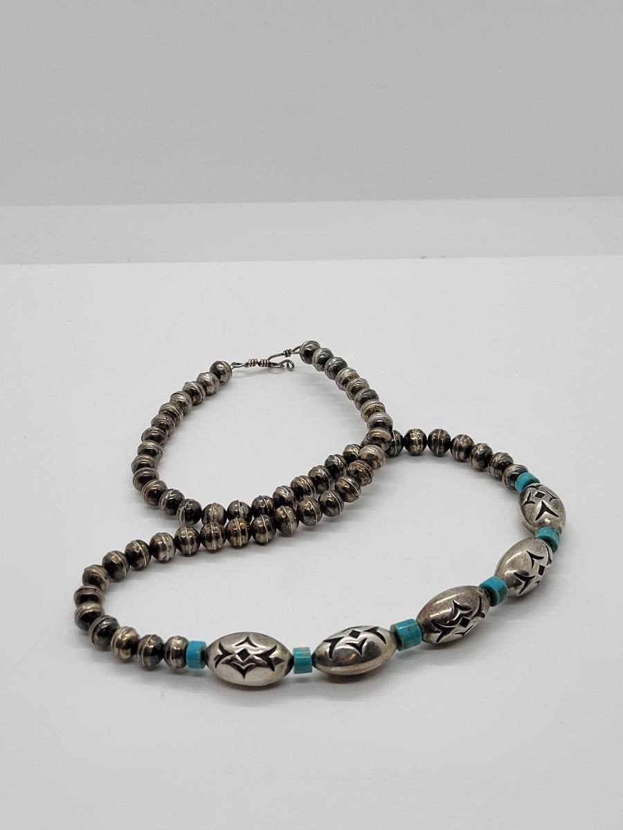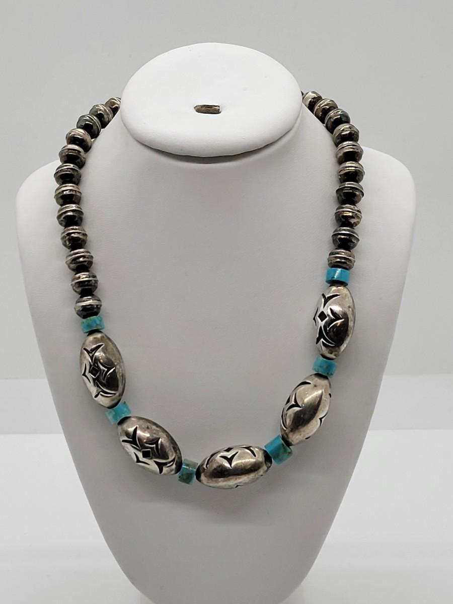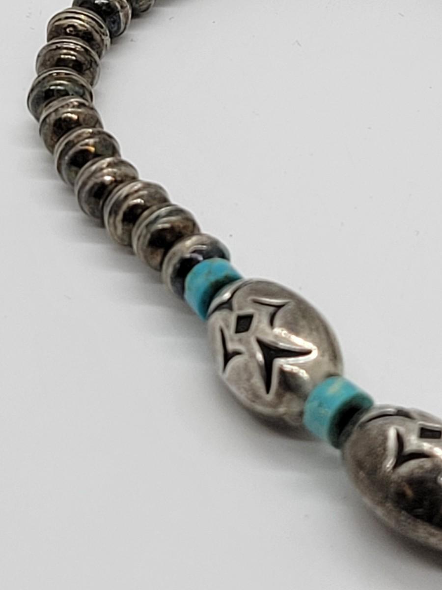 LOT42: One of a Kind Native American Navajo Old Pawn Bench Bead & Turquoise 24"L Necklace - Acid tested Silver - (59.2g total weight)
