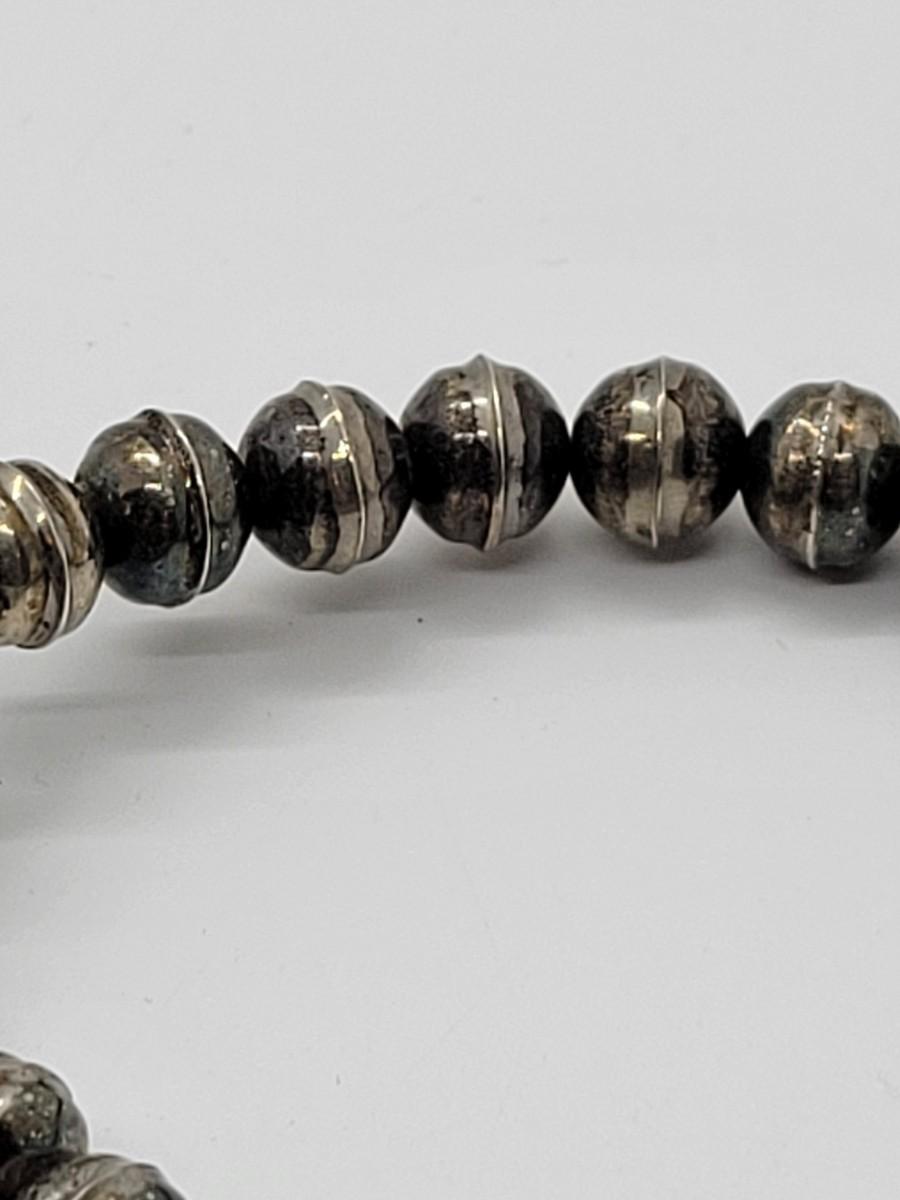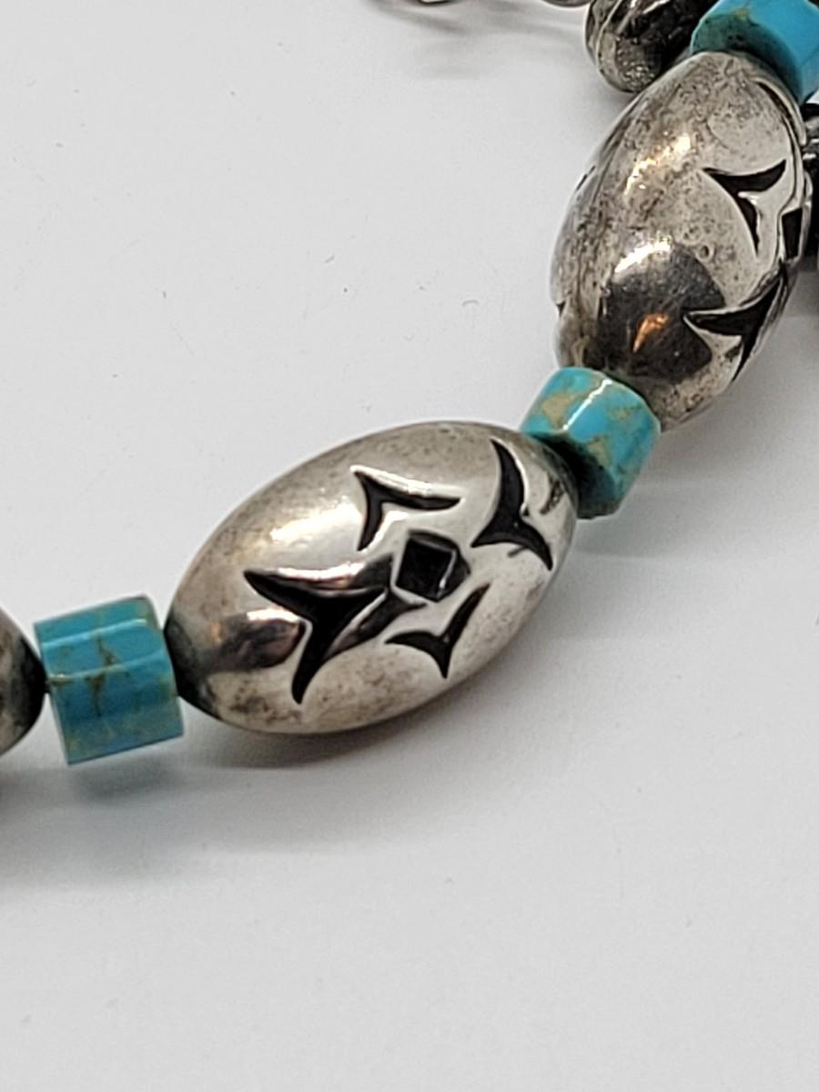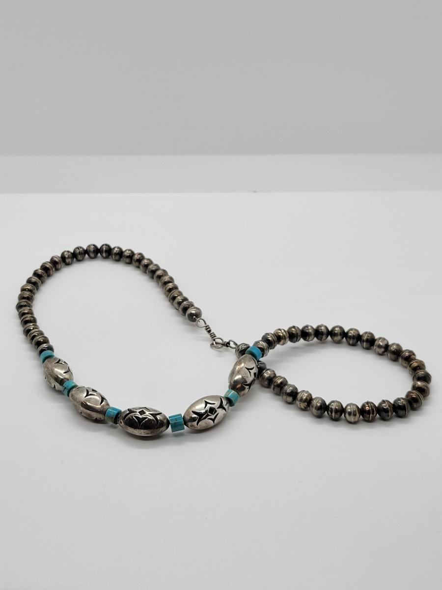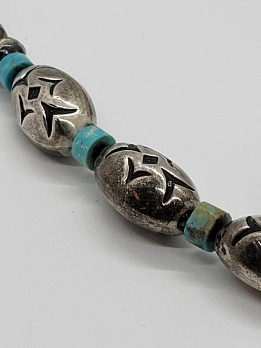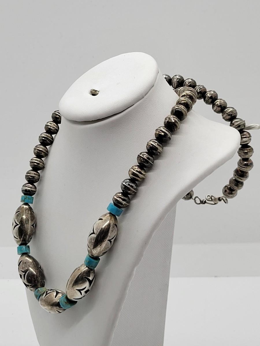 LOT42: One of a Kind Native American Navajo Old Pawn Bench Bead & Turquoise 24"L Necklace - Acid tested Silver - (59.2g total weight)