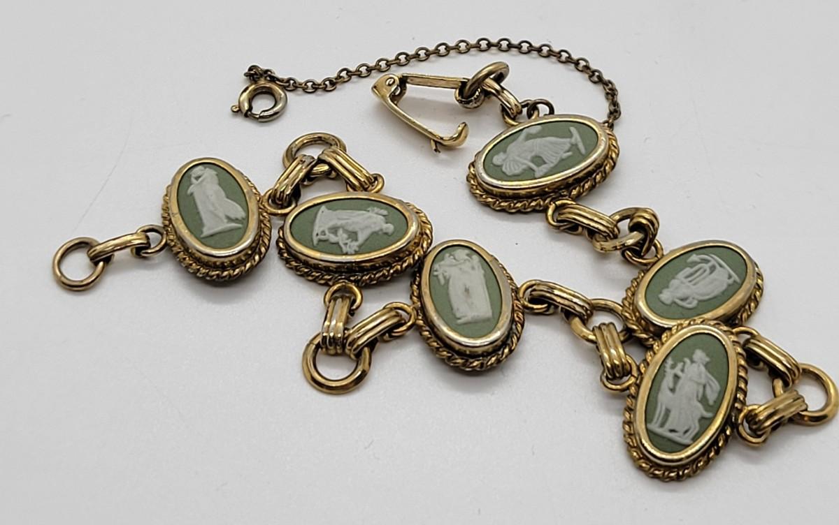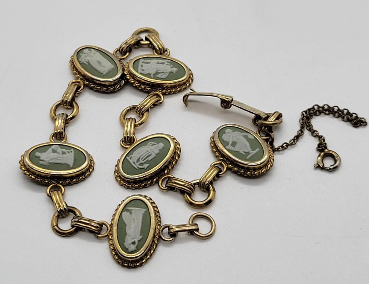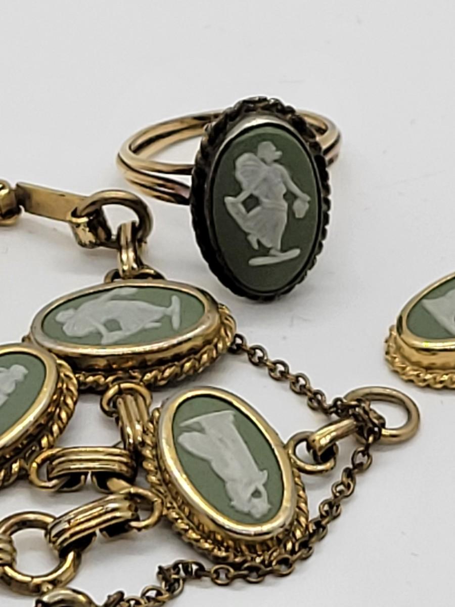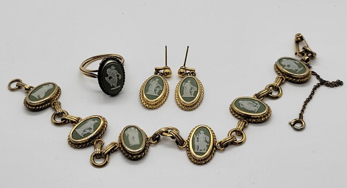 LOT46: Wedgewood Green Jasperware pierced earrings, ring (SZ7), bracelet (8"L) with safety chain gold filled