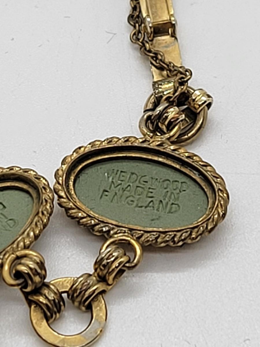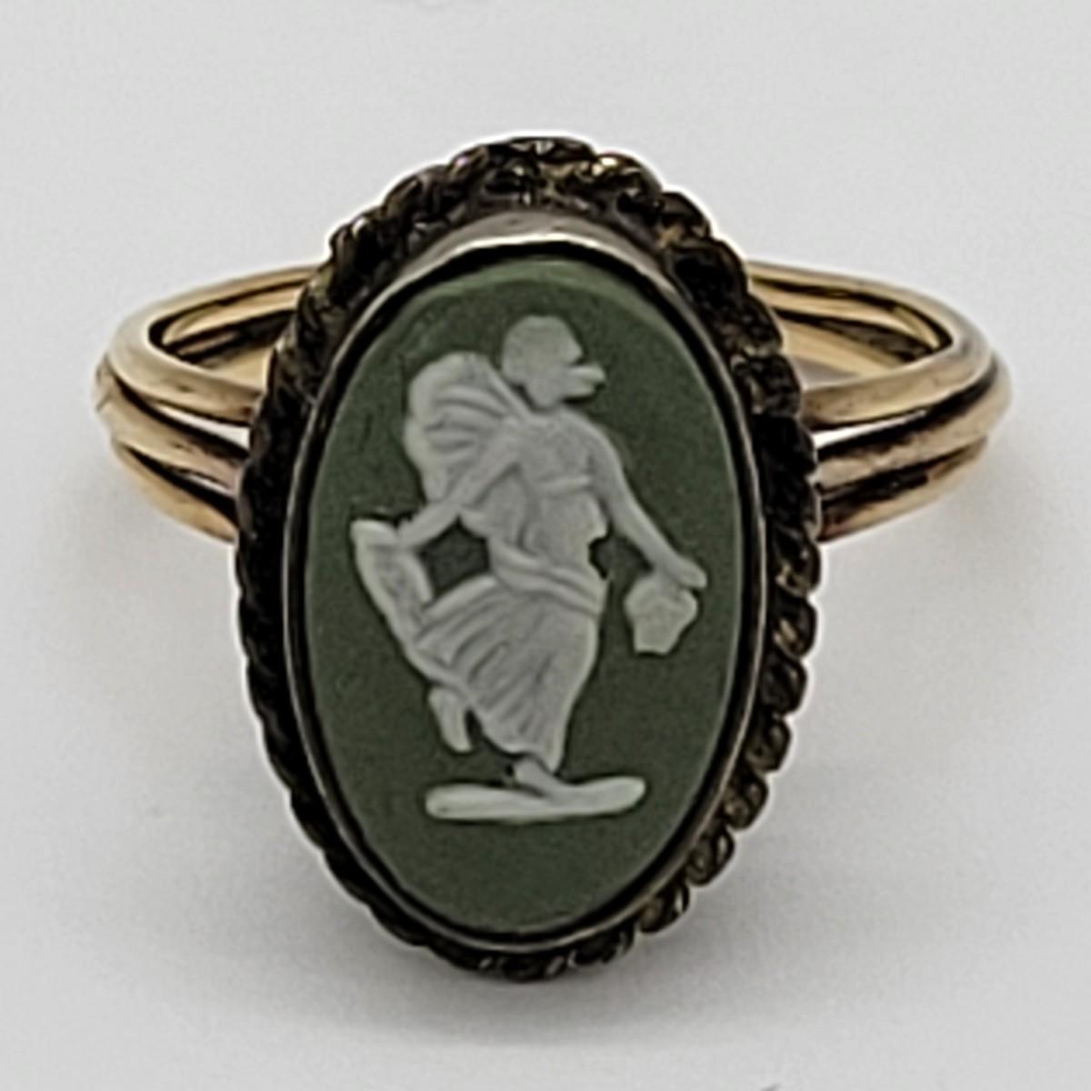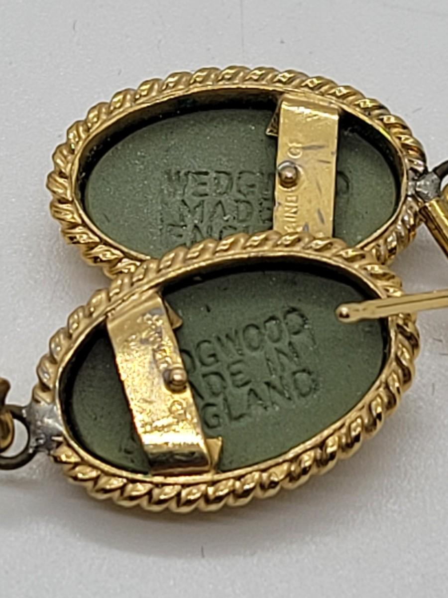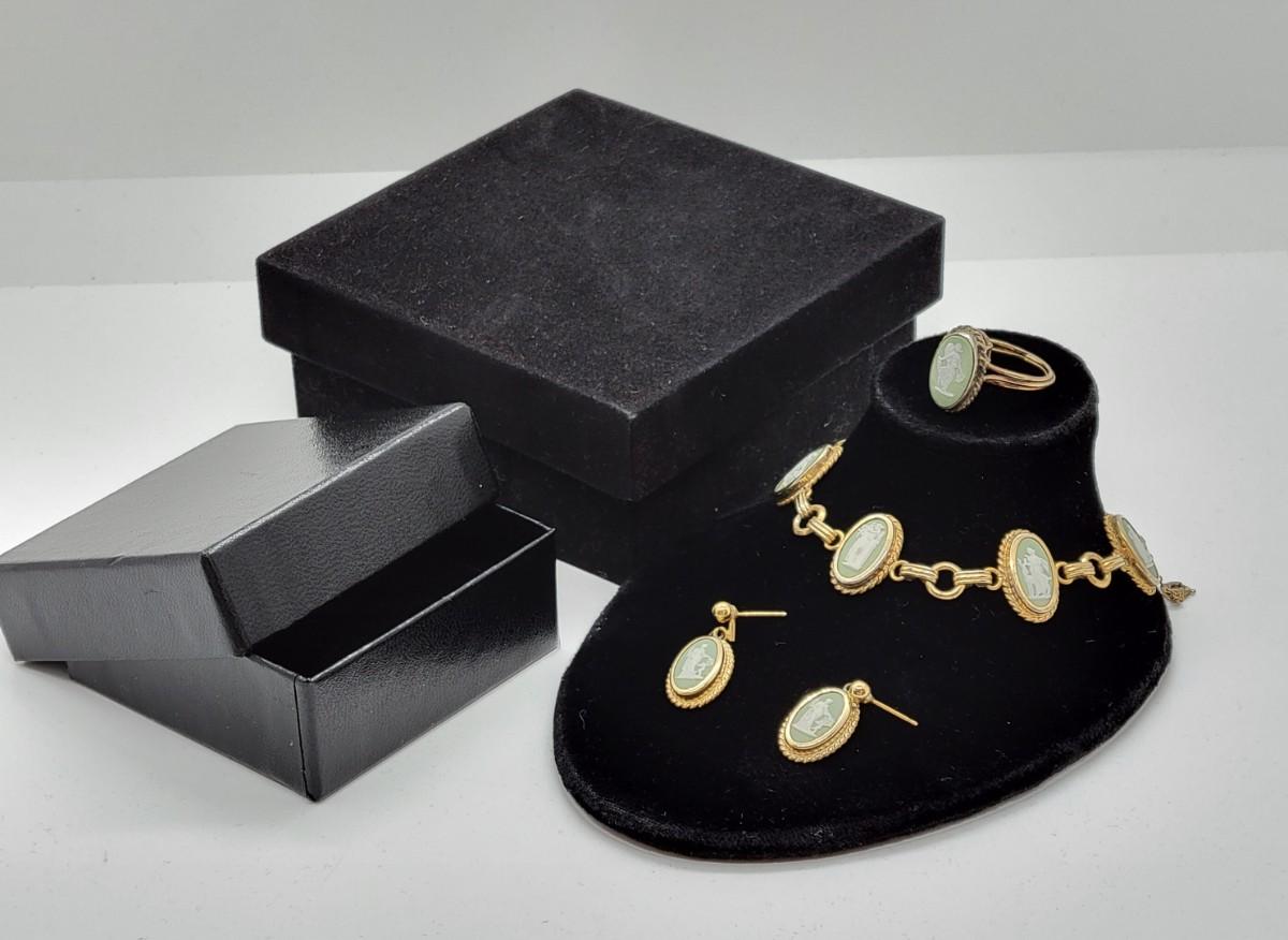 LOT46: Wedgewood Green Jasperware pierced earrings, ring (SZ7), bracelet (8"L) with safety chain gold filled