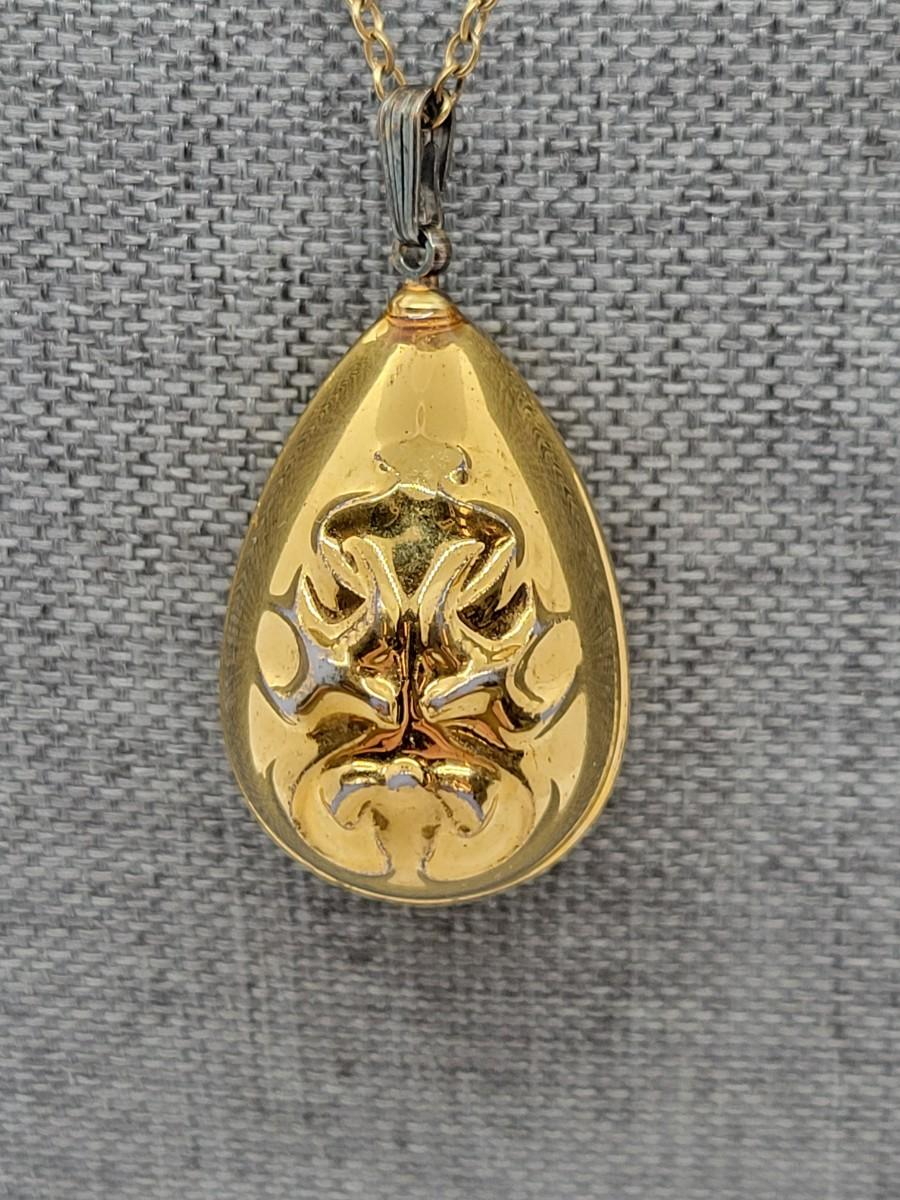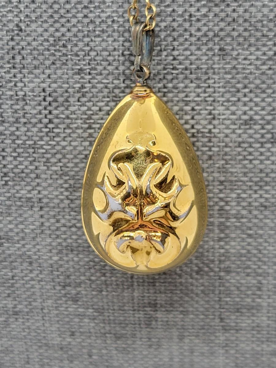 LOT68: Handsewn Freshwater pearl Heart pendant on 18" chain and a  gold covered ceramic egg pendant on a  22"L goldtone chain