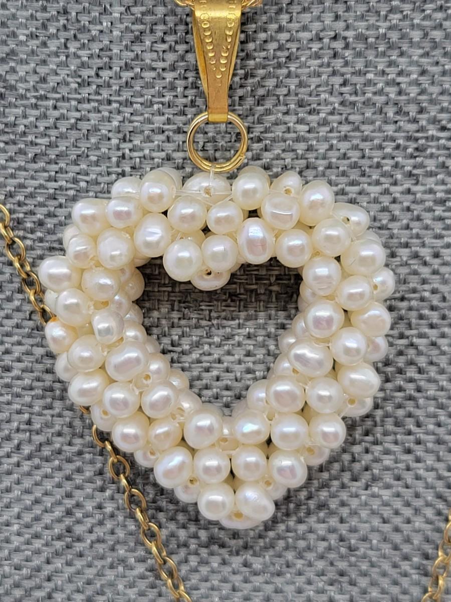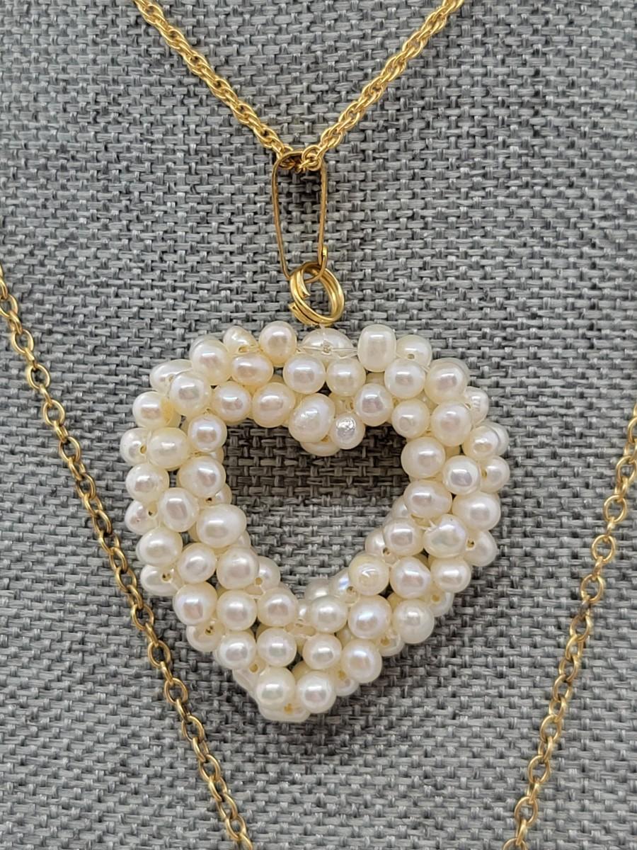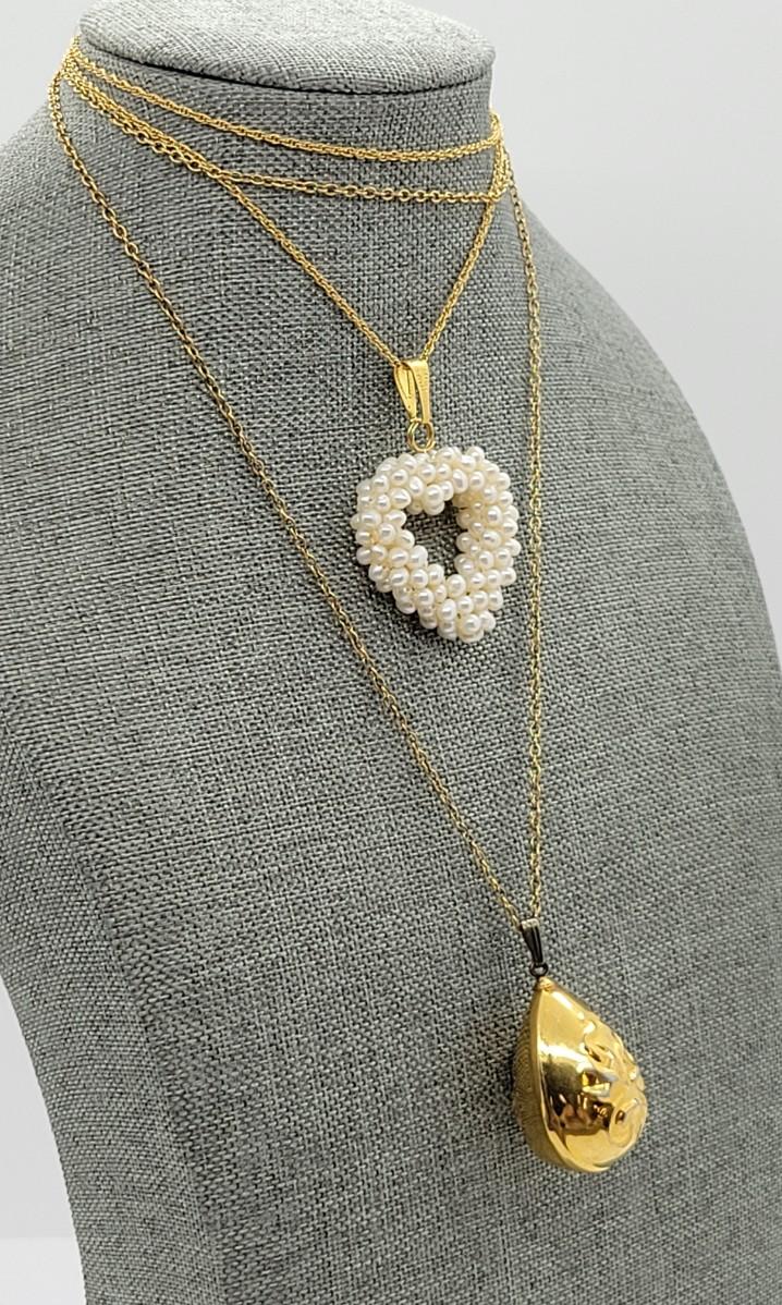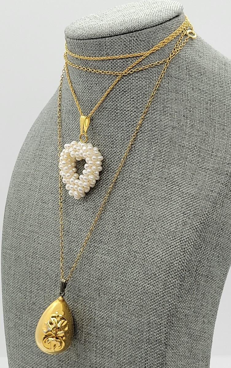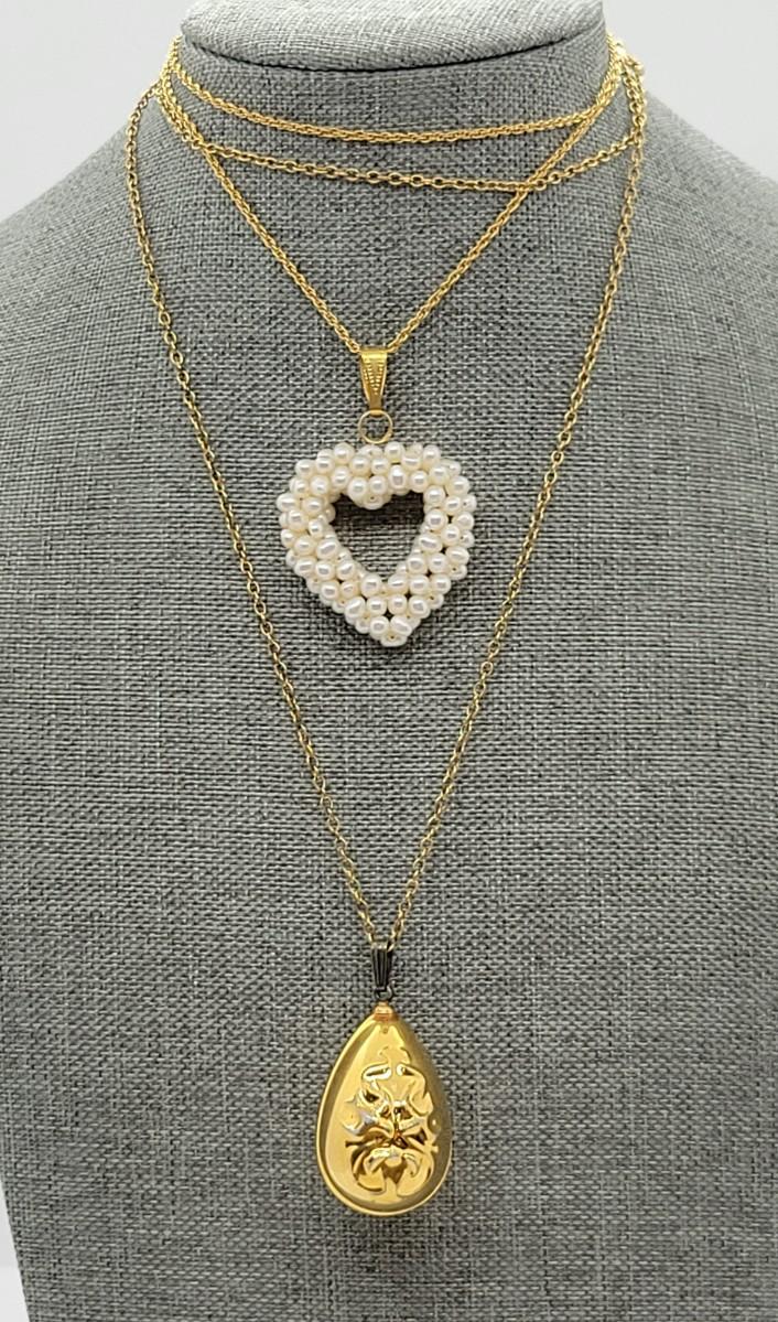 LOT68: Handsewn Freshwater pearl Heart pendant on 18" chain and a gold covered ceramic egg pendant on a 22"L goldtone chain
