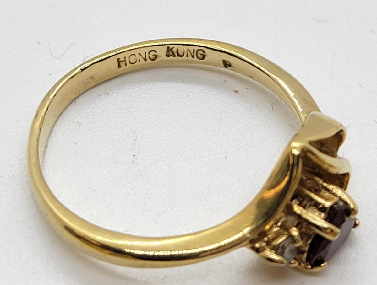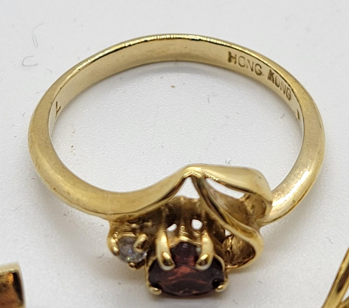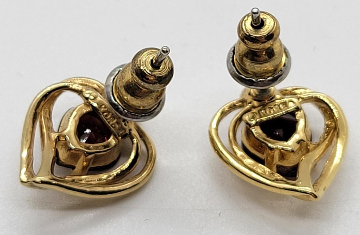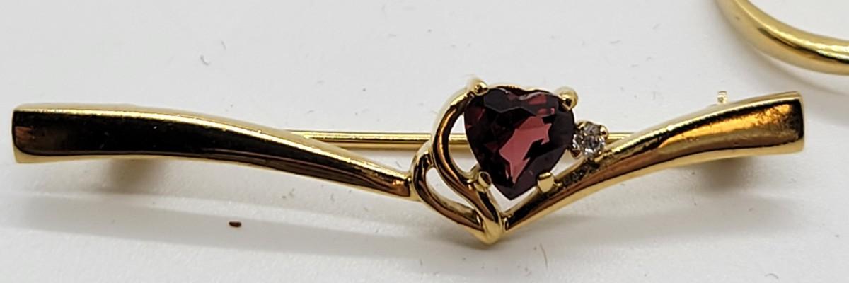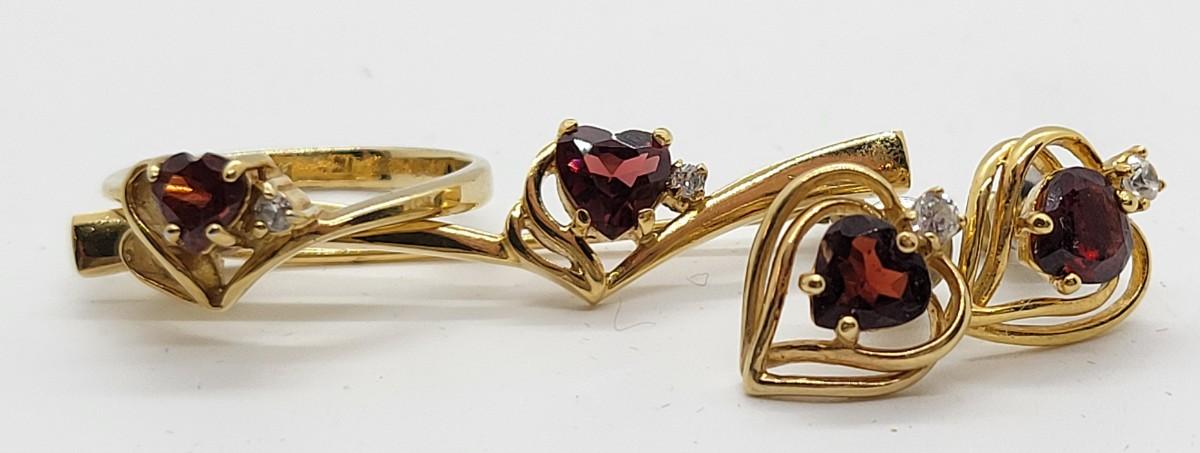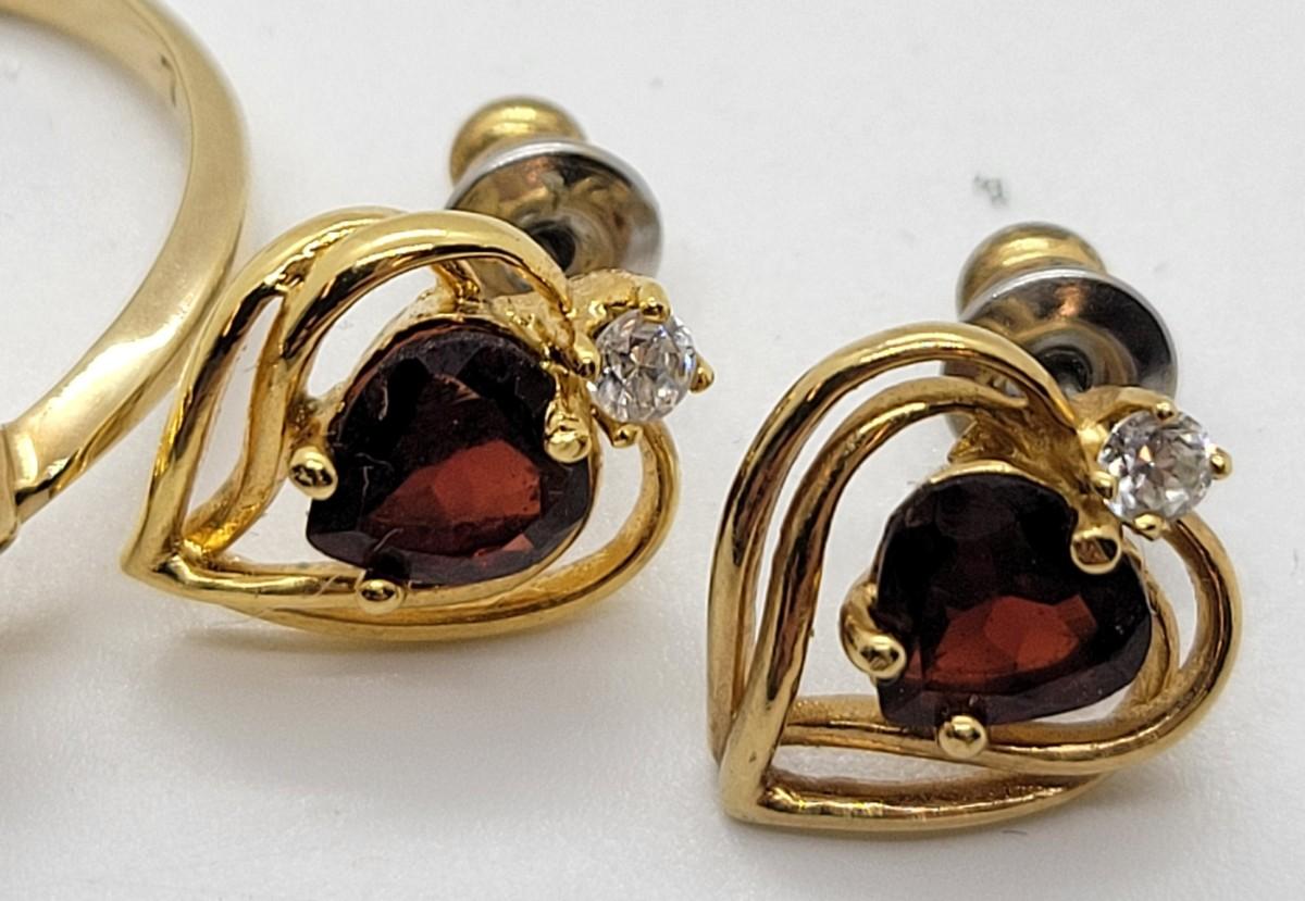 LOT97: Vintage goldtone faux garnet heart set - brooch, size 7 ring, pierced earrings
