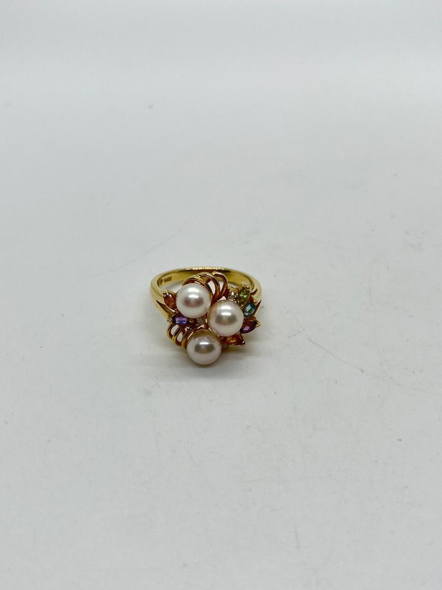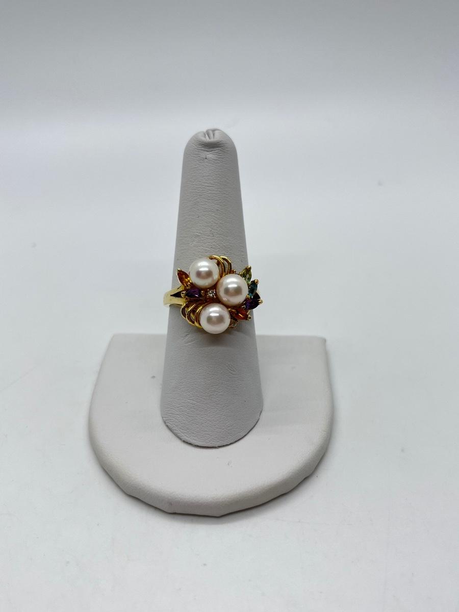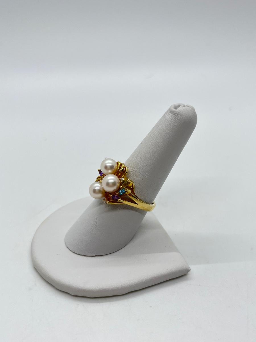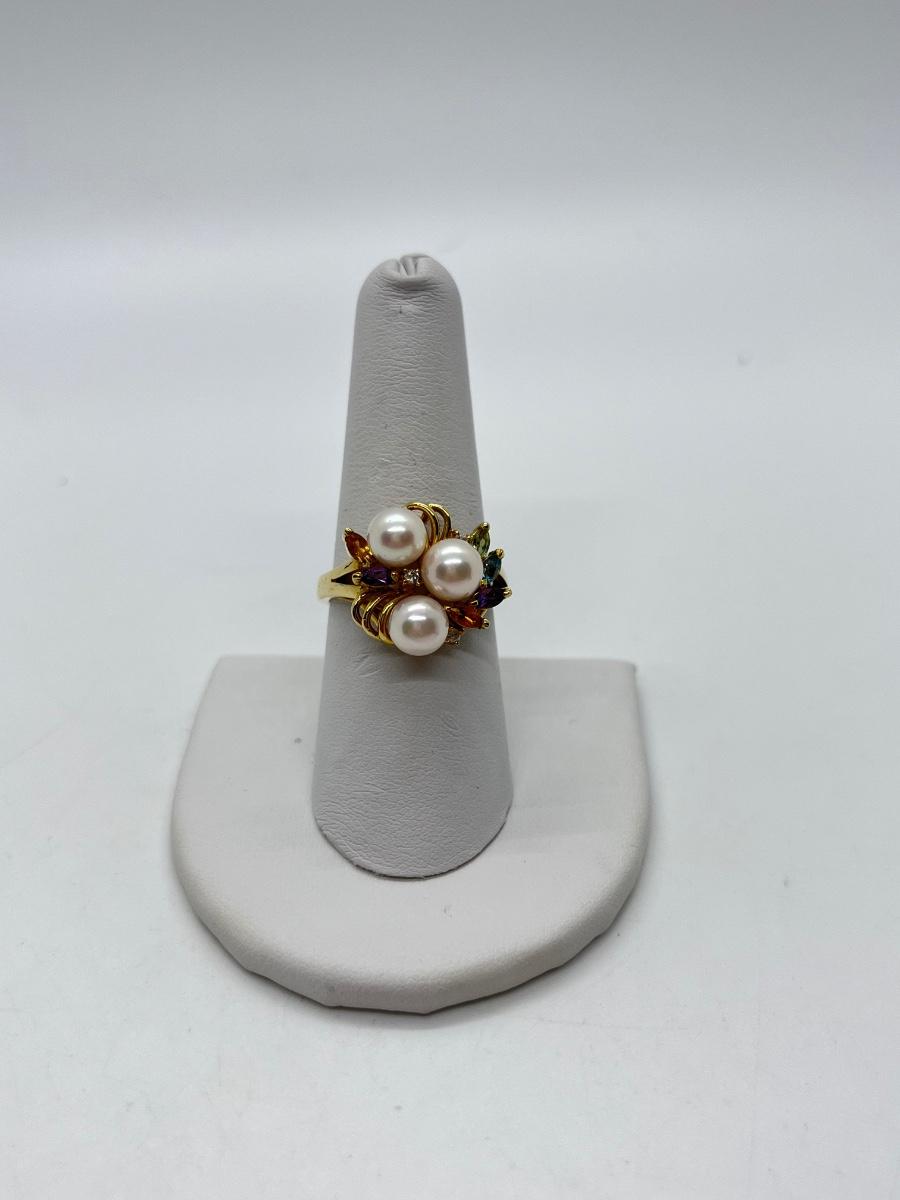 LOT 133: 14K Gold Marked "SIN"  Size 8 Ring with Cultured Pearls, Diamonds, Amethyst, Citrine, Peridot, Blue Topaz