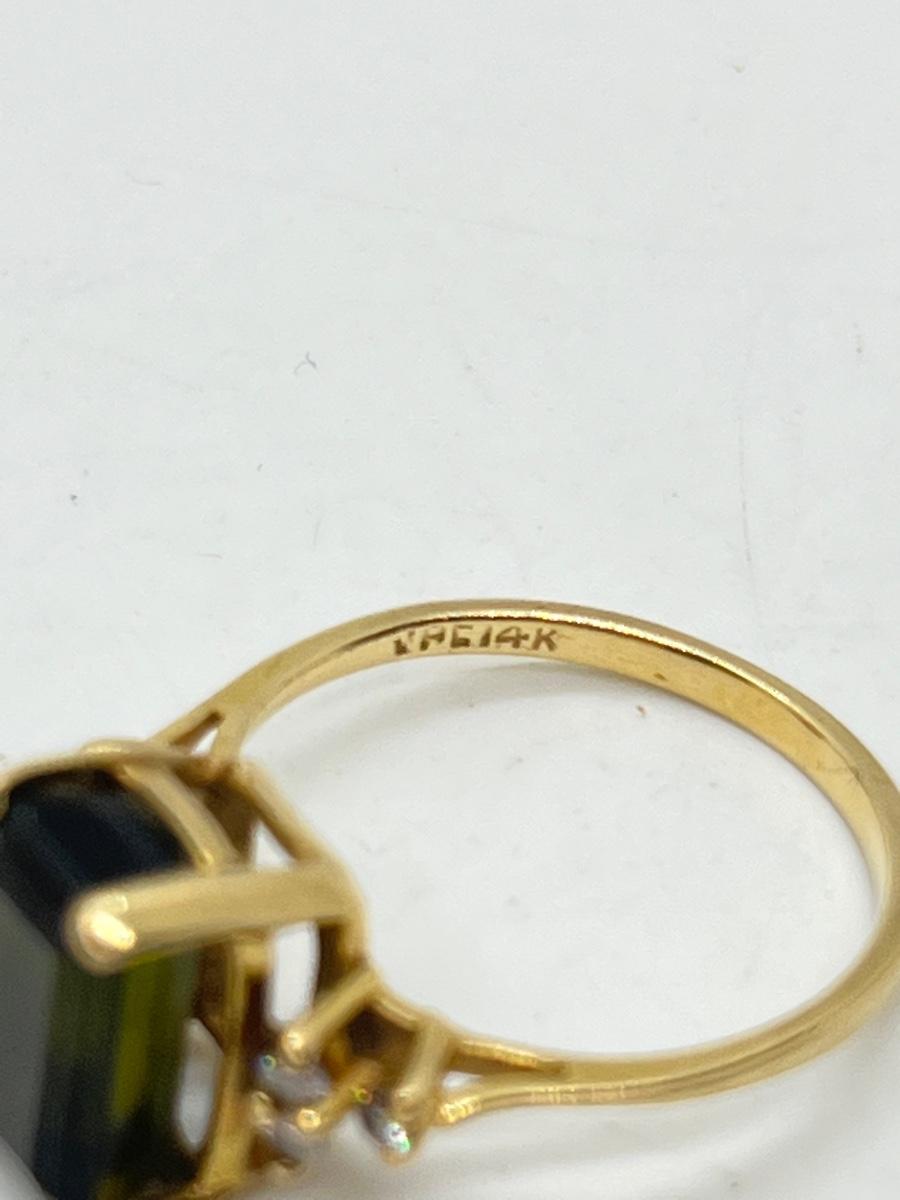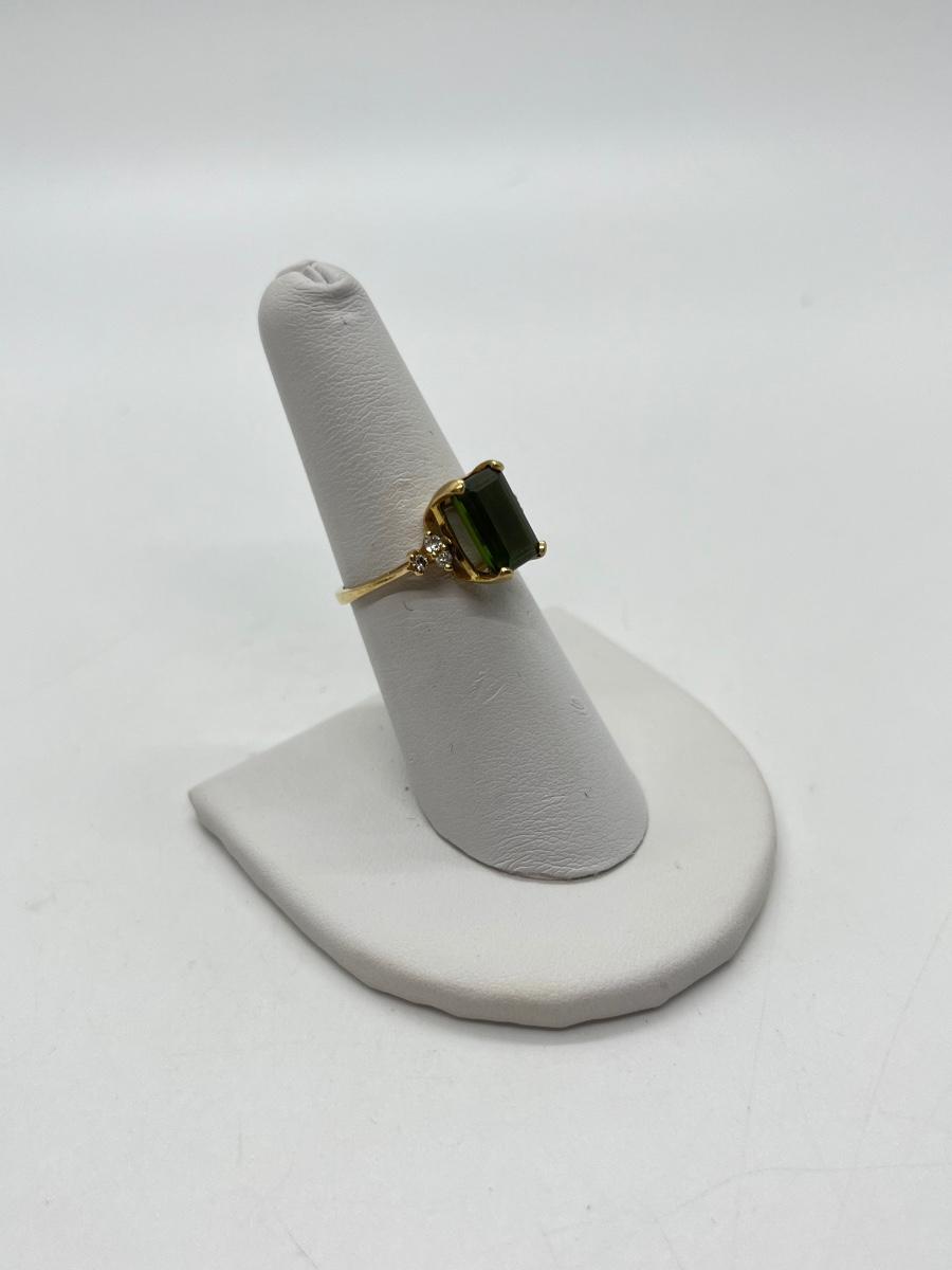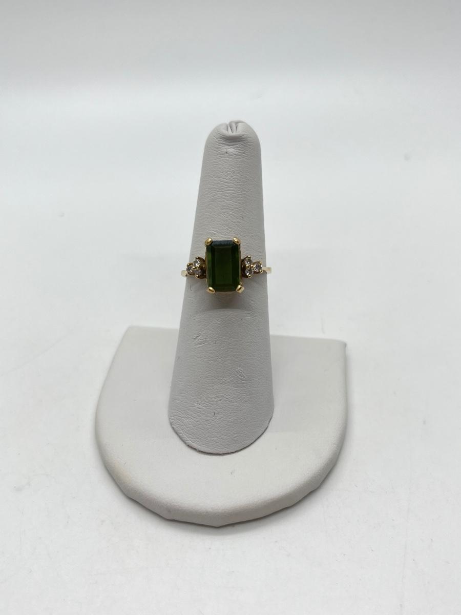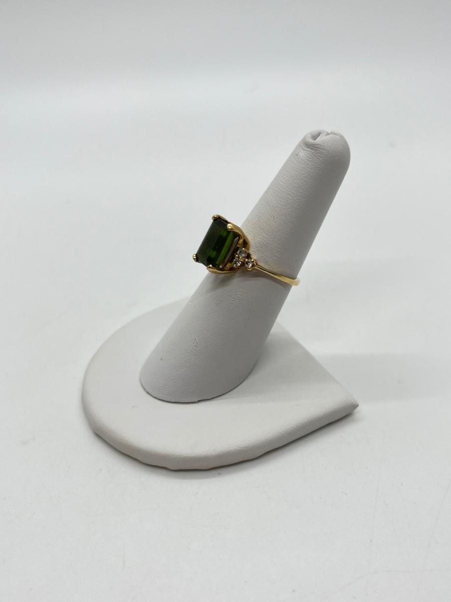 LOT 139: 14K Gold Marked "JBC" Green Tourmaline + Diamond Chip Size 8 Ring - 2.94 gtw