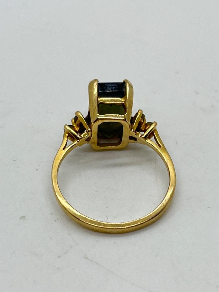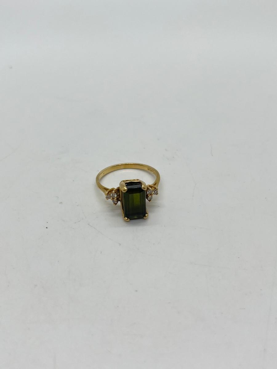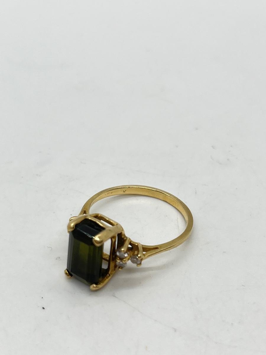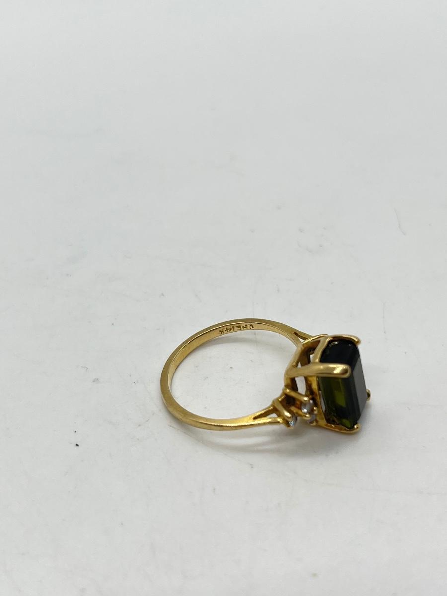LOT 139: 14K Gold Marked "JBC" Green Tourmaline + Diamond Chip Size 8 Ring - 2.94 gtw