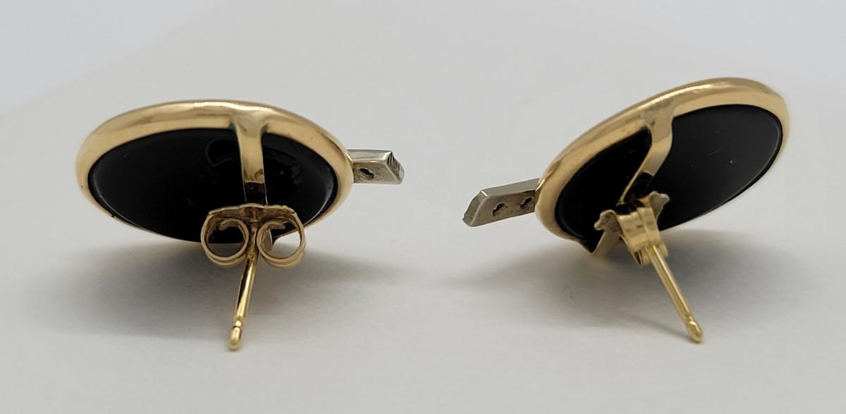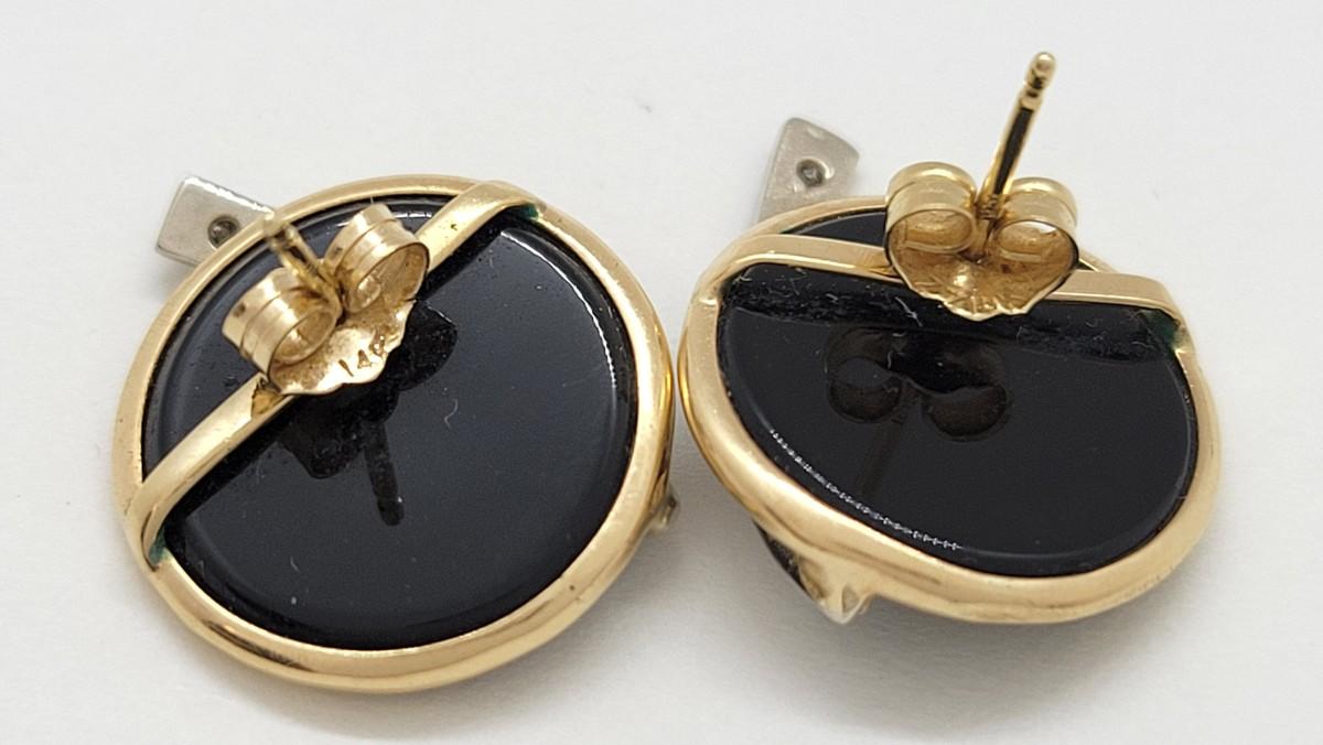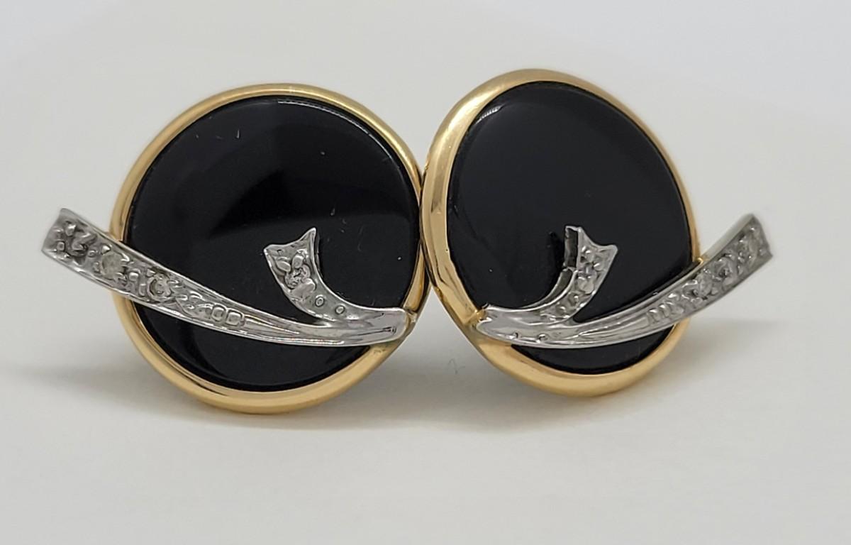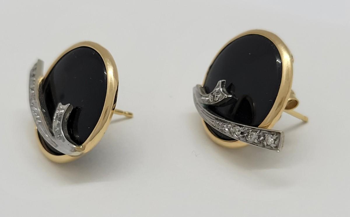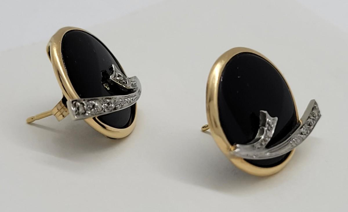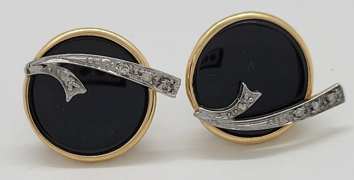LOT 34: 14K Yellow Gold, Black Onyx, and Diamond Earrings