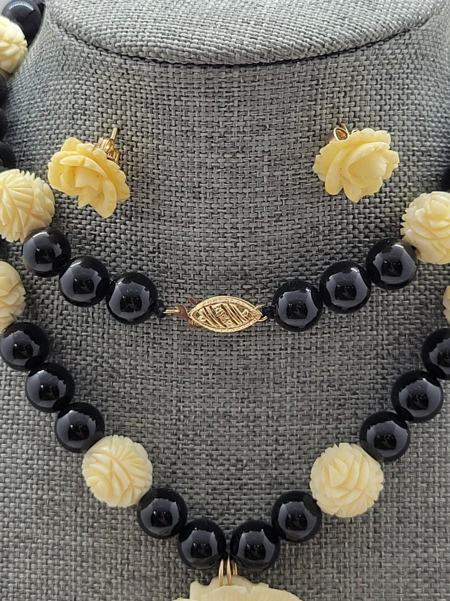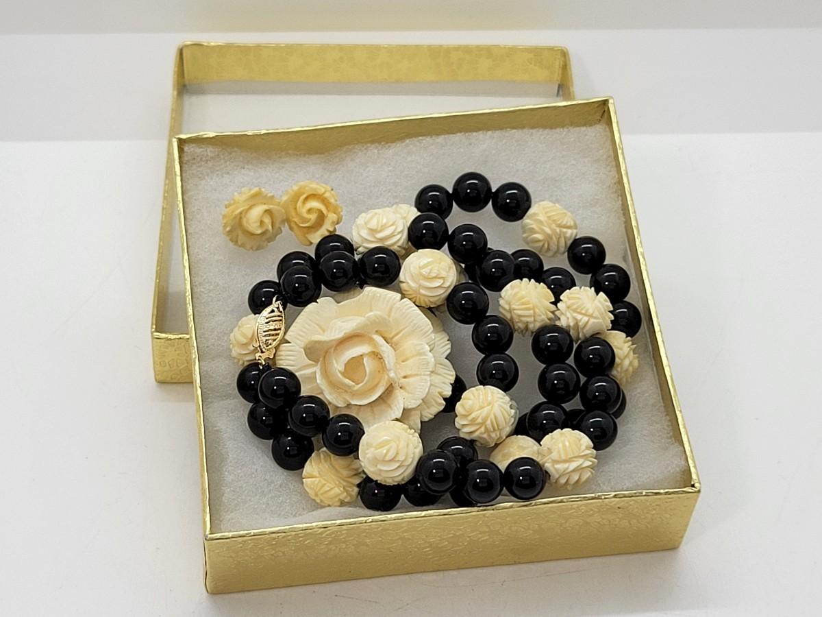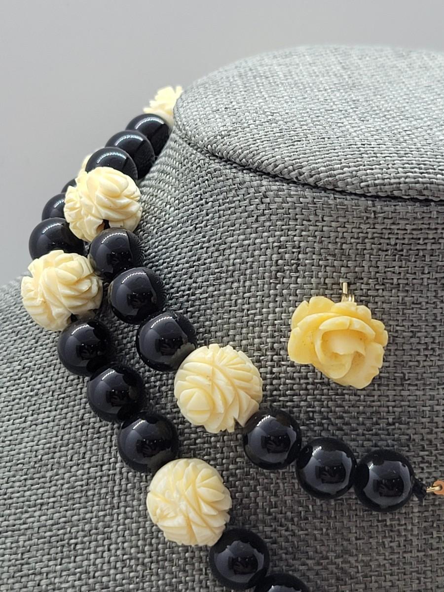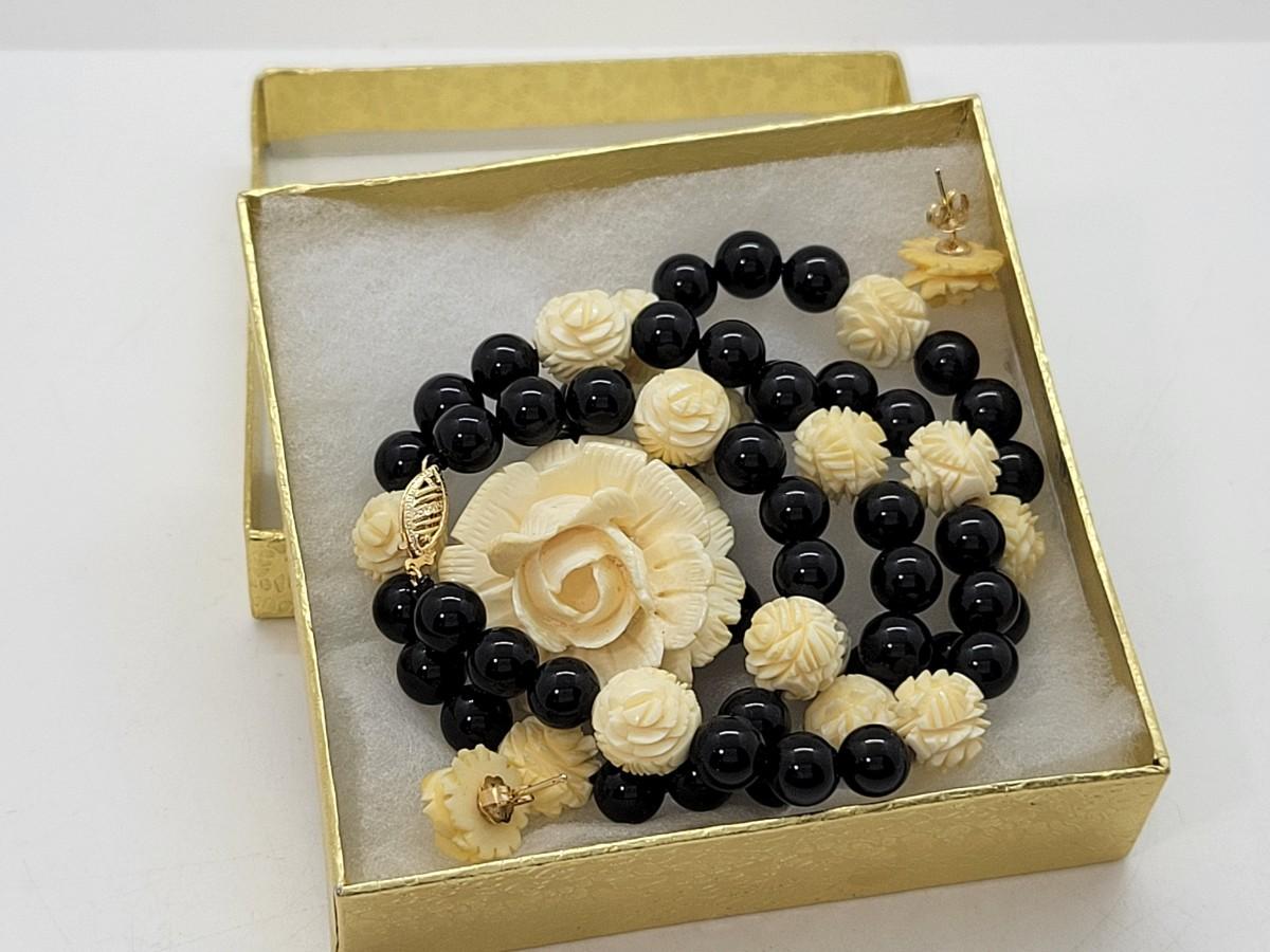 LOT 45: Carla Carved Roses and Onyx Bead Necklace & Earring set w/ 14K Posts and Clasp