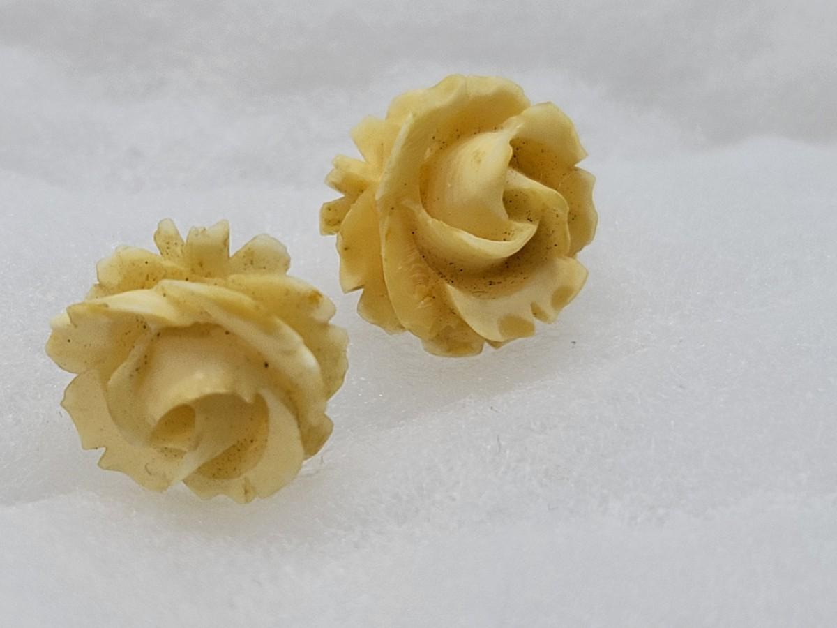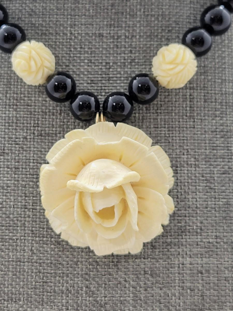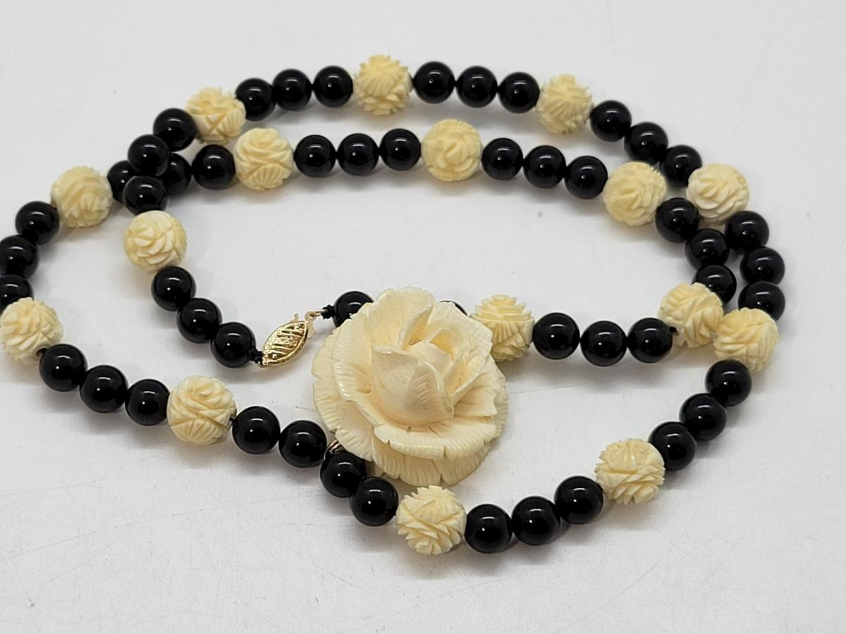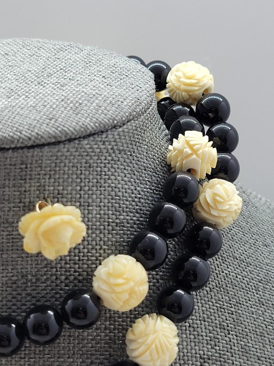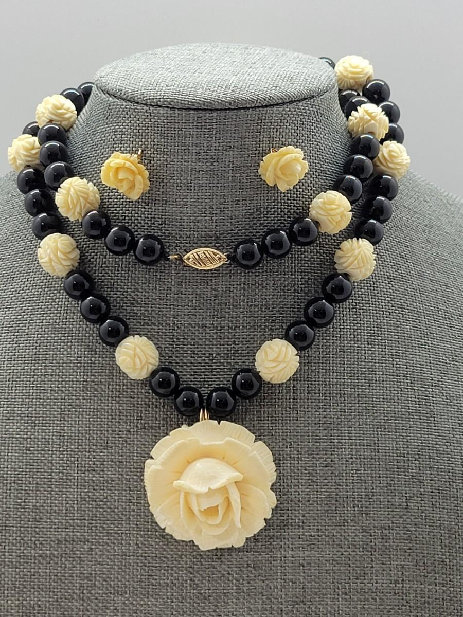 LOT 45: Carla Carved Roses and Onyx Bead Necklace & Earring set w/ 14K Posts and Clasp