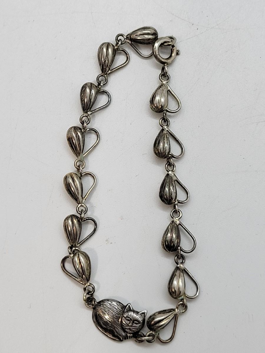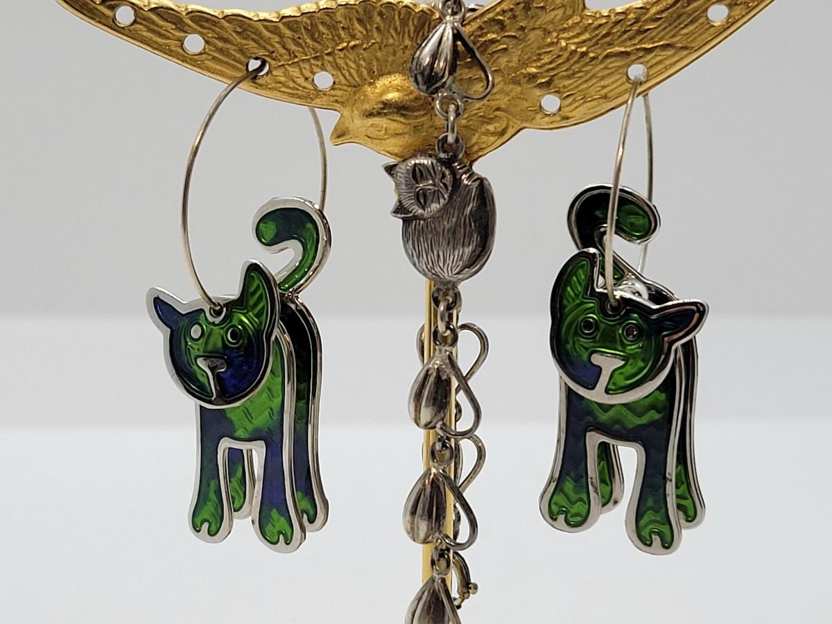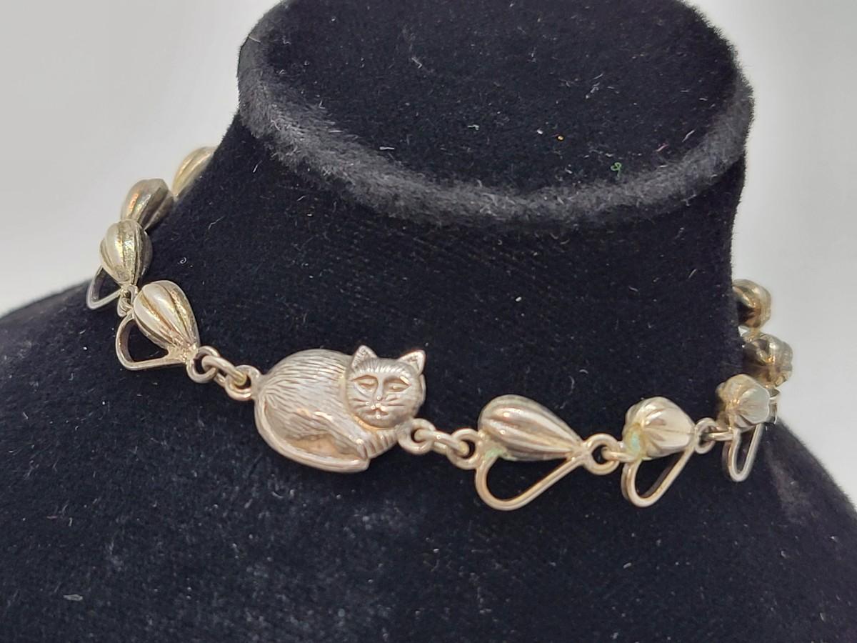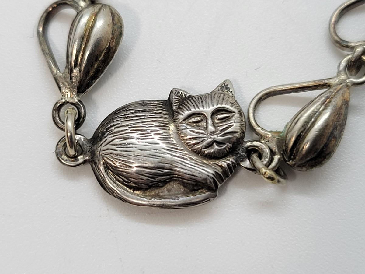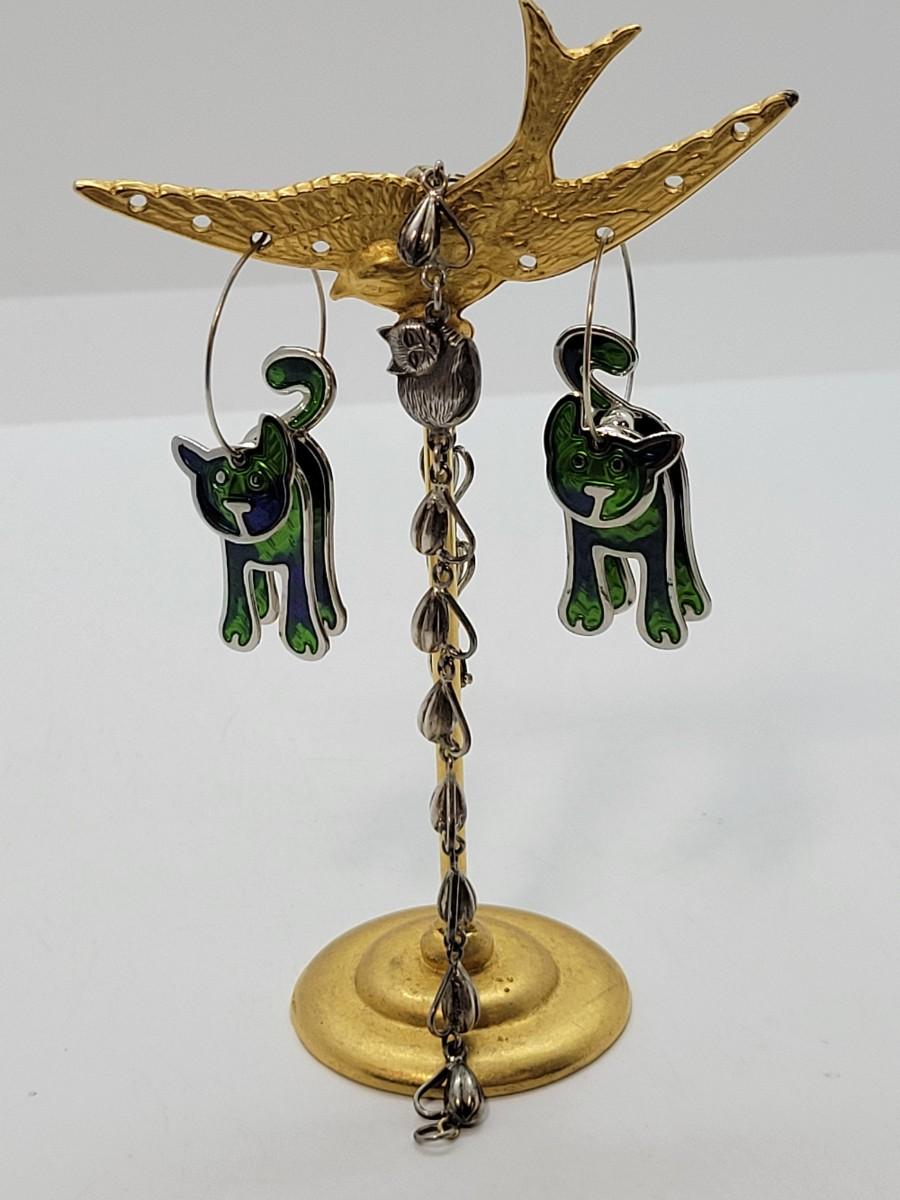 LOT 5: Sterling Silver Cat Bracelet - 7" & Berebl Enamel Mobile Pierced Cat Earrings