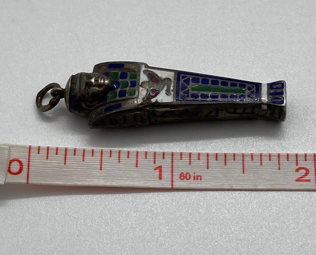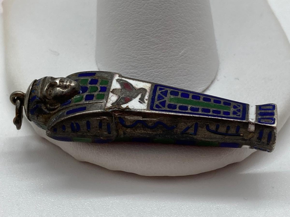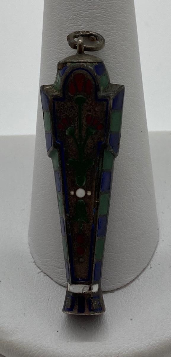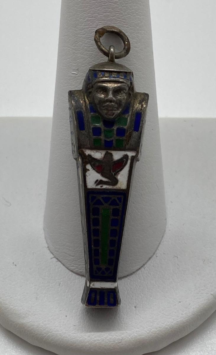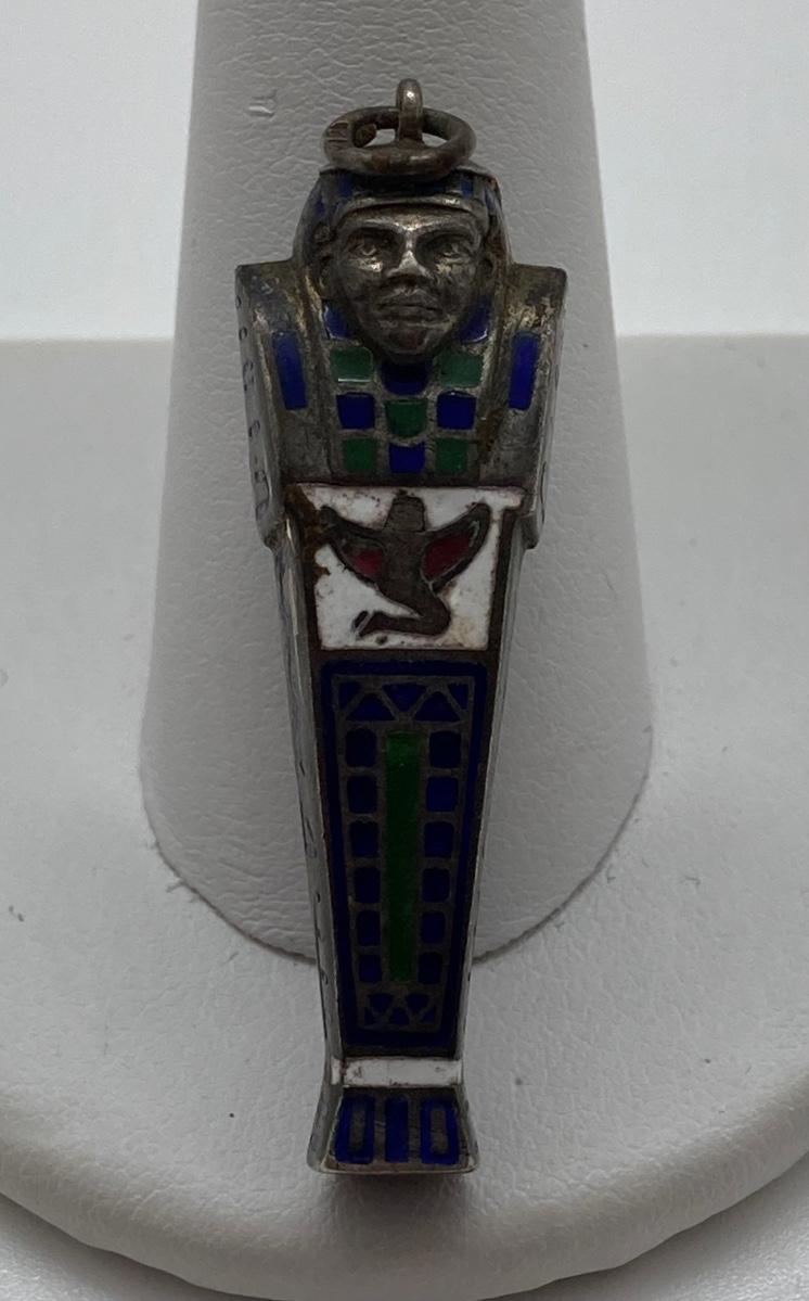 LOT 29J: Egyptian Revival Sterling Silver and Enamel Sarcophagus Pendant