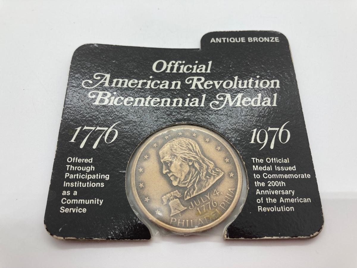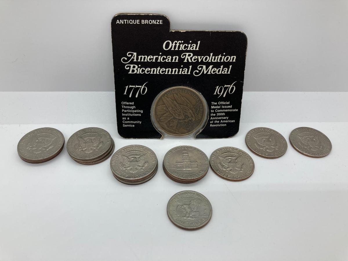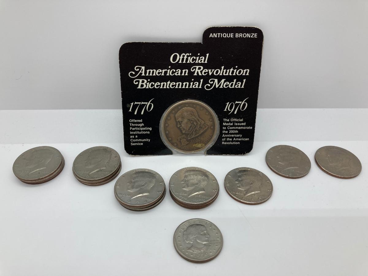 Collection includes: 15 Kennedy Half Dollars - (Three) 1971, (Three) 1972, (Three) 1974, (Three) 1776-1976, (One) 1980, (One) 1983, (One) 1985, (One) 1979 Susan B Anthony $1 Coin and (One) Official American Revolution Bicentennial Medal.
