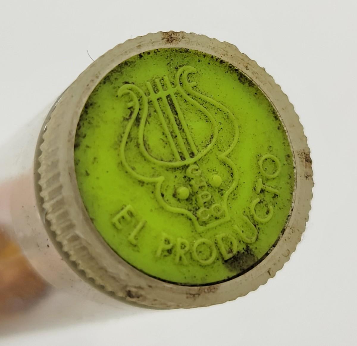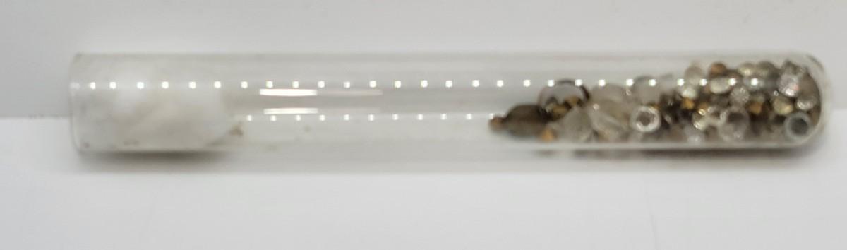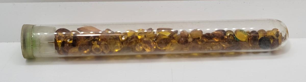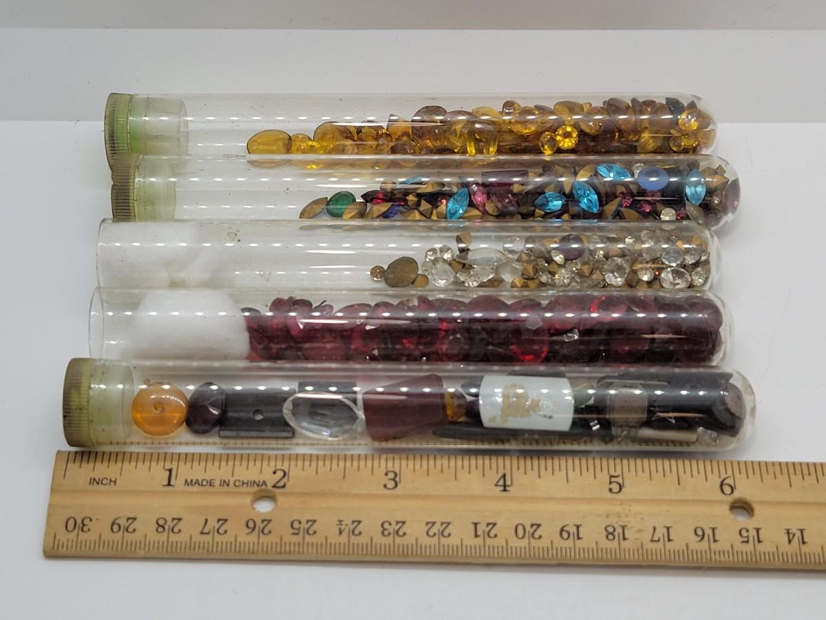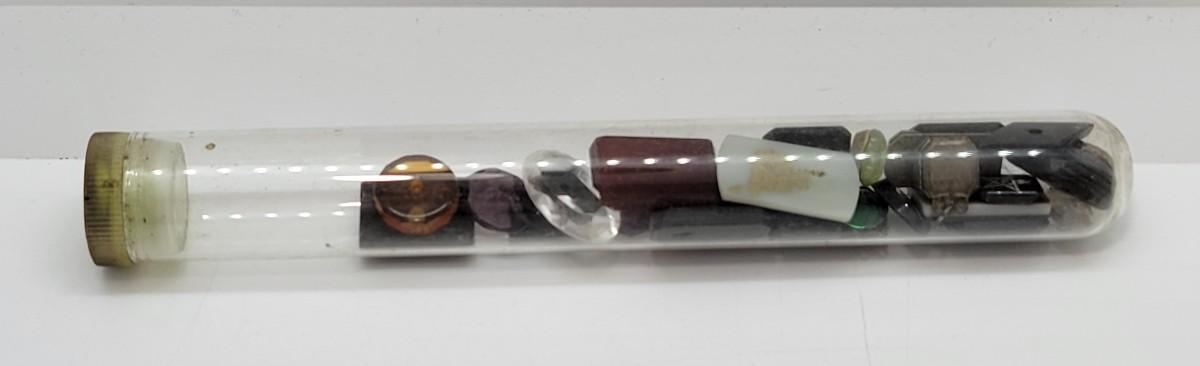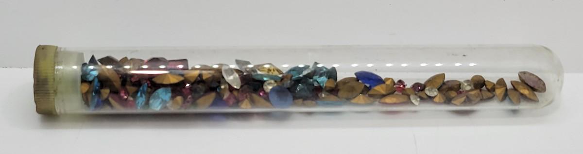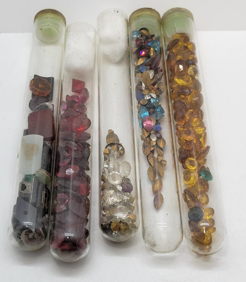 These came from the workbench of a former jeweler. It's unknown if these are glass or genuine gemstones. They were stored in these glass cigar tubes and used for making and repairing jewelry.