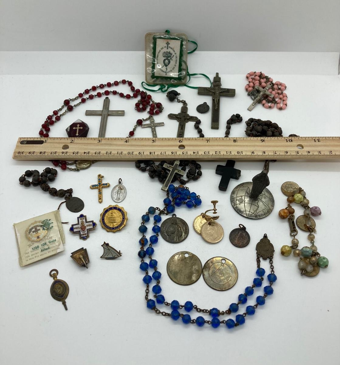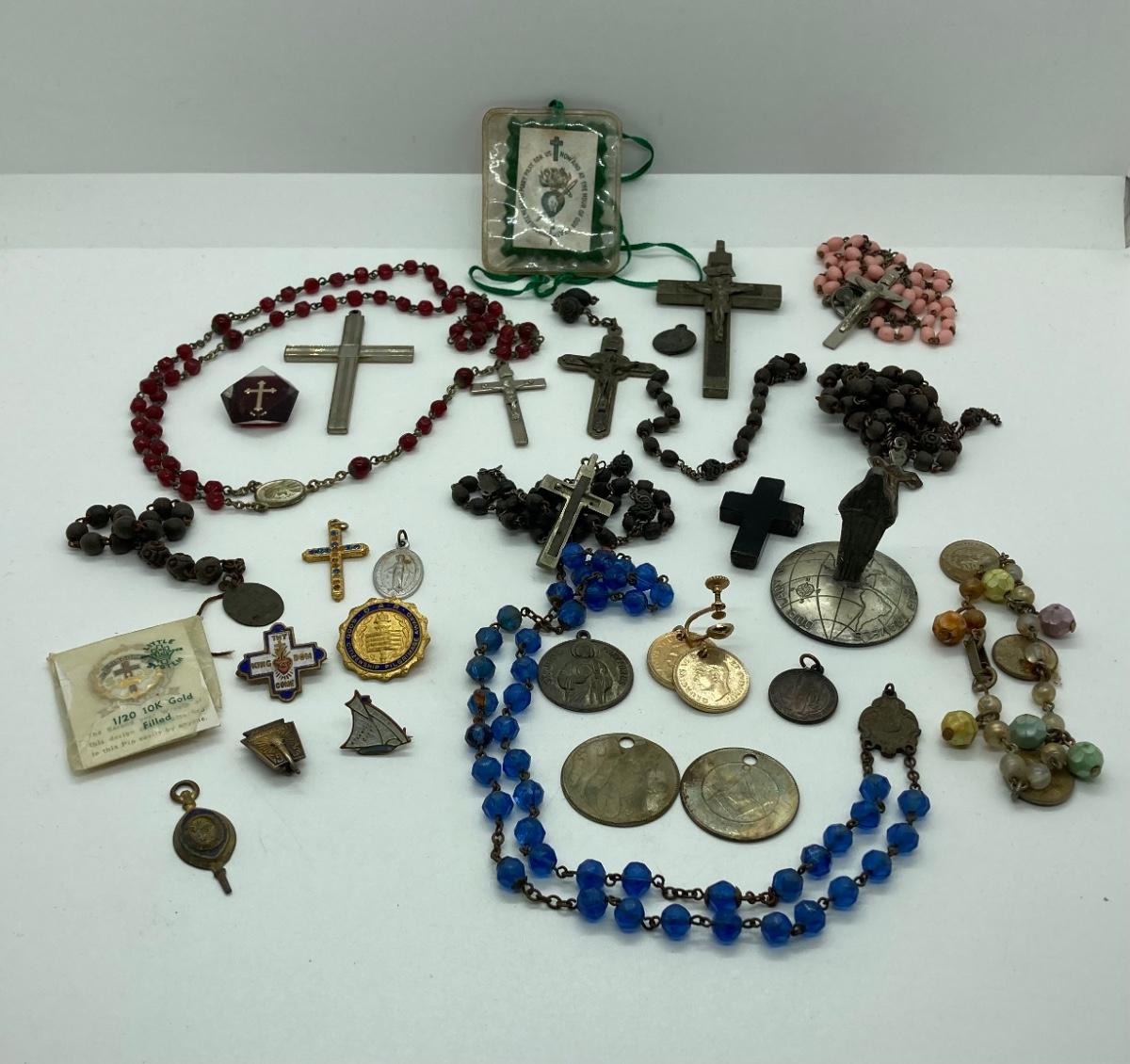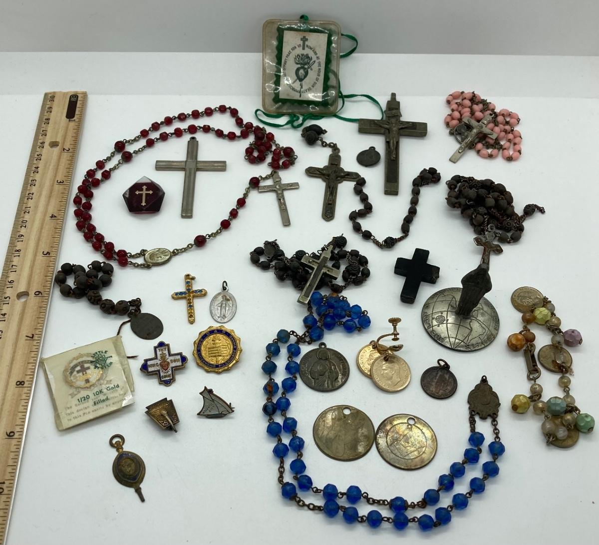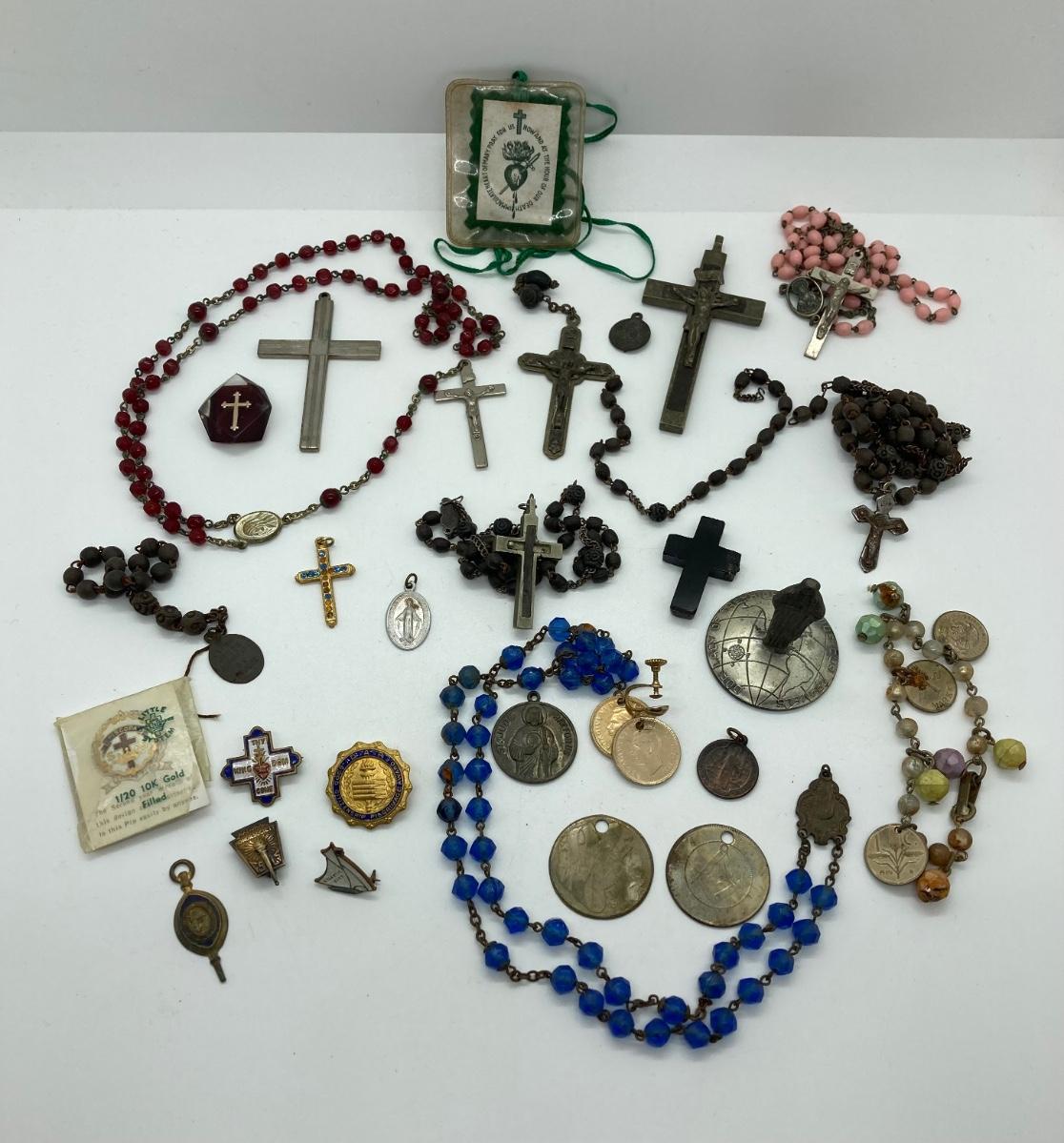 LOT 91J: Religious and Pin Lot: Atlantic City, Antique Wood/Metal Crucifixes, Rosary Beads and More.
